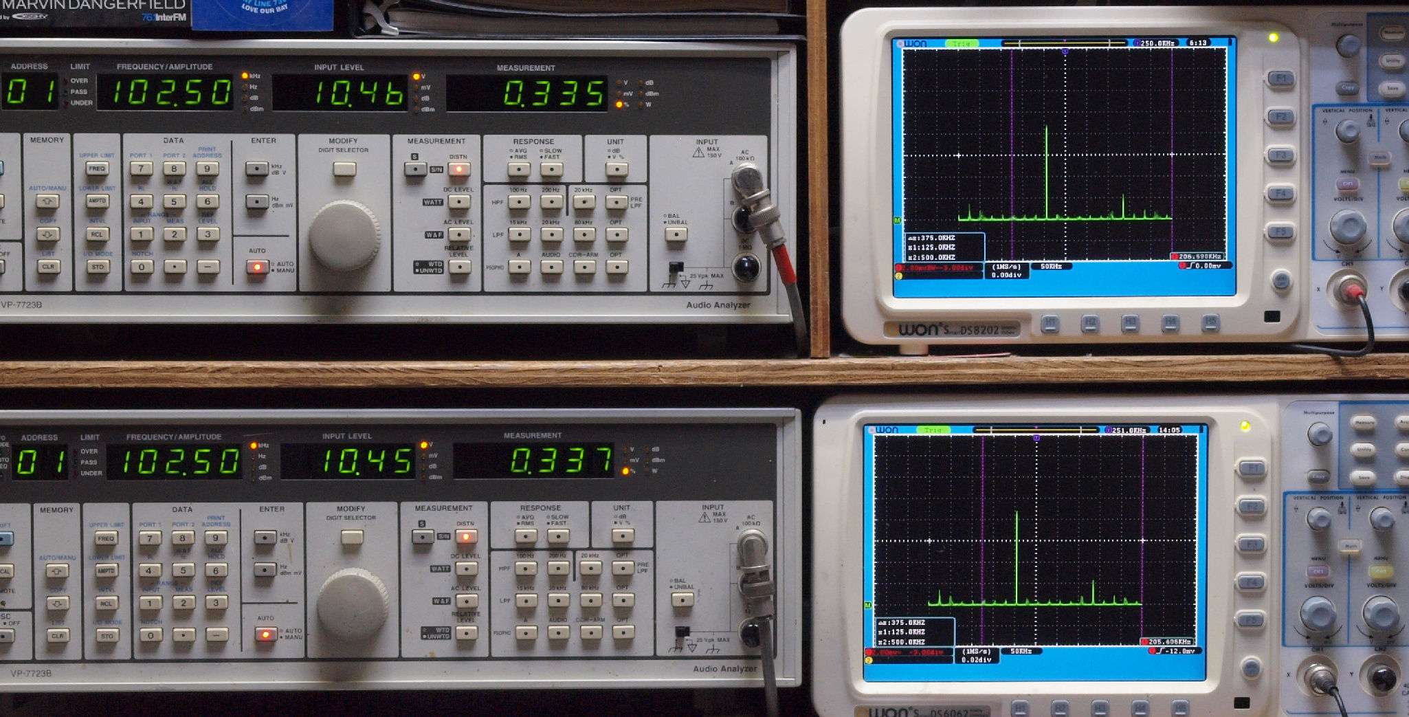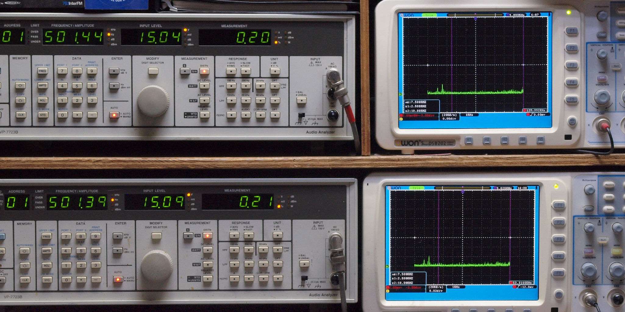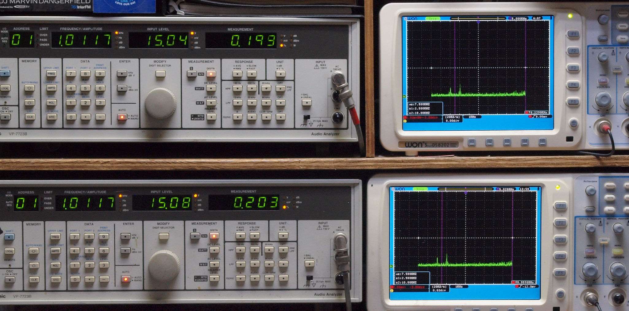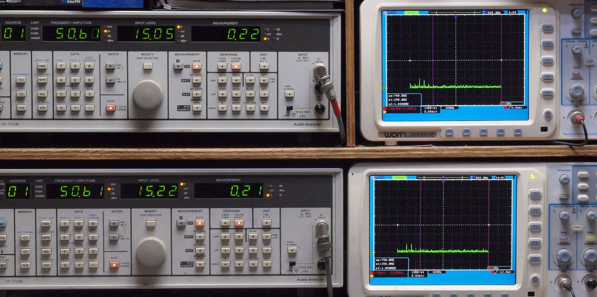 上段右端 VP−7723Bの基本波除去出力を「owon SDS8202(200MHZ)」で「FFT分析」表示。
