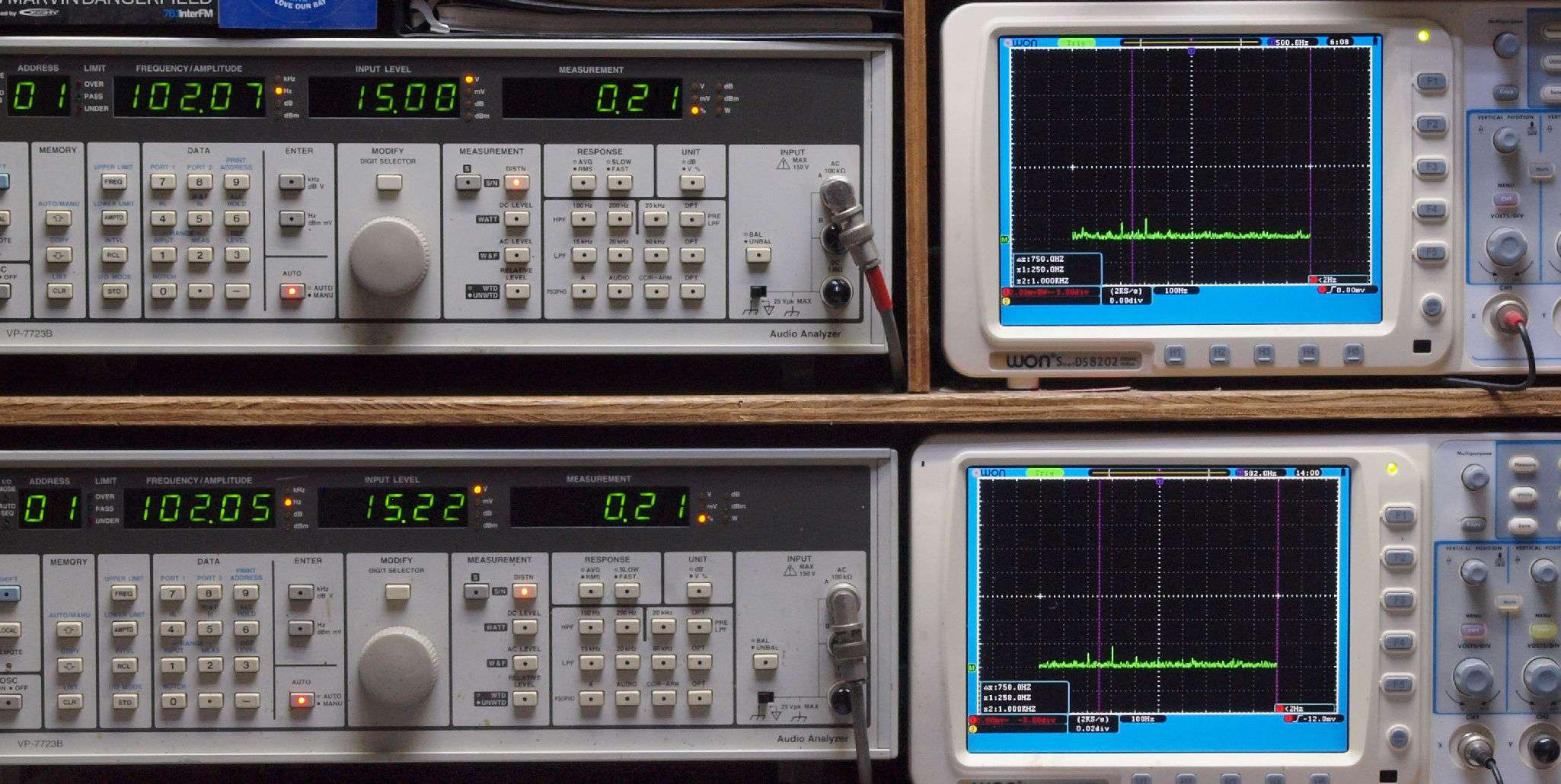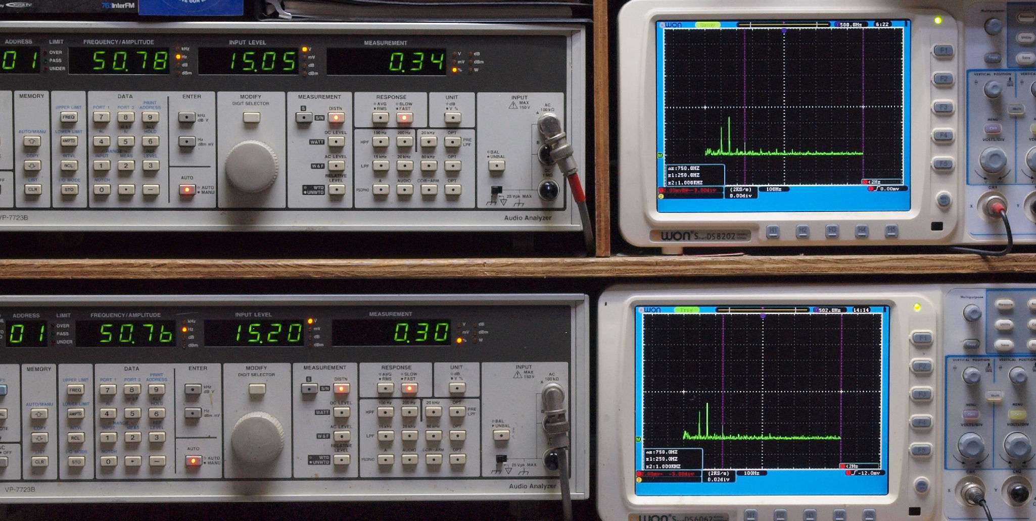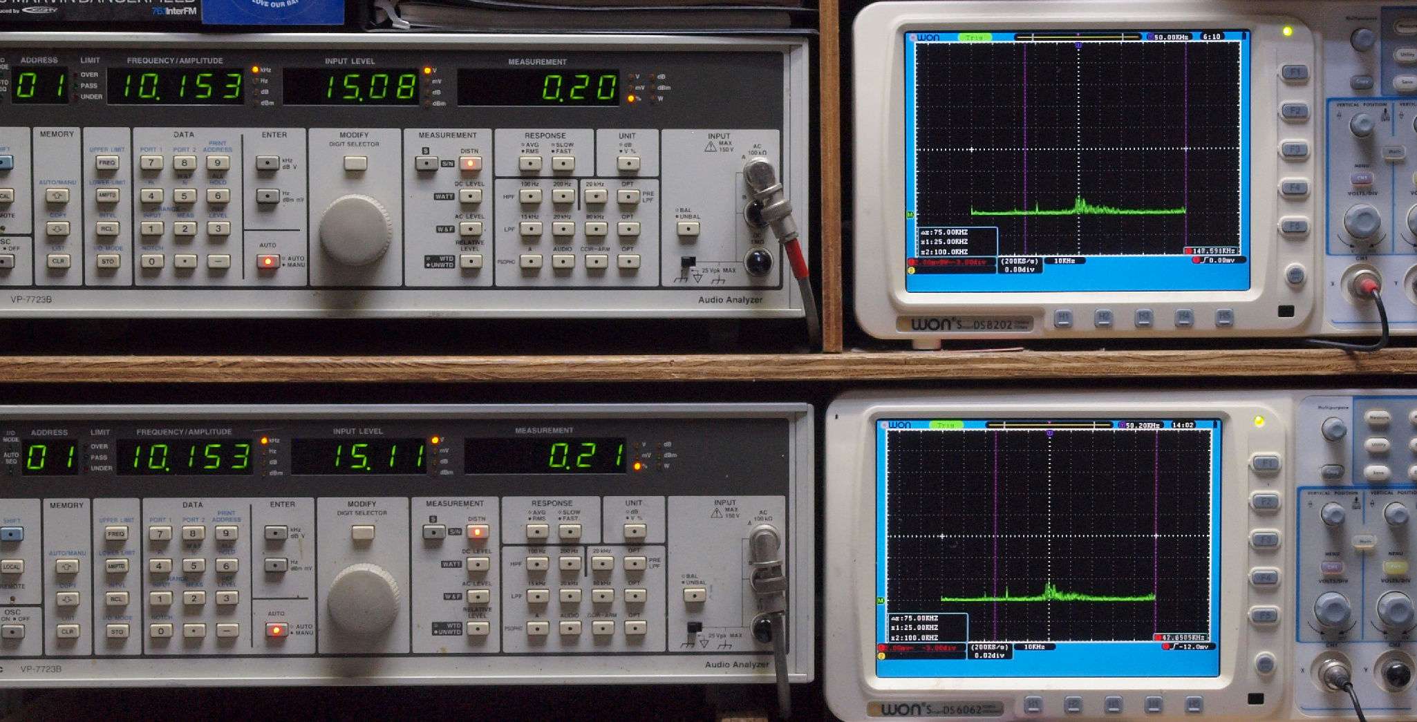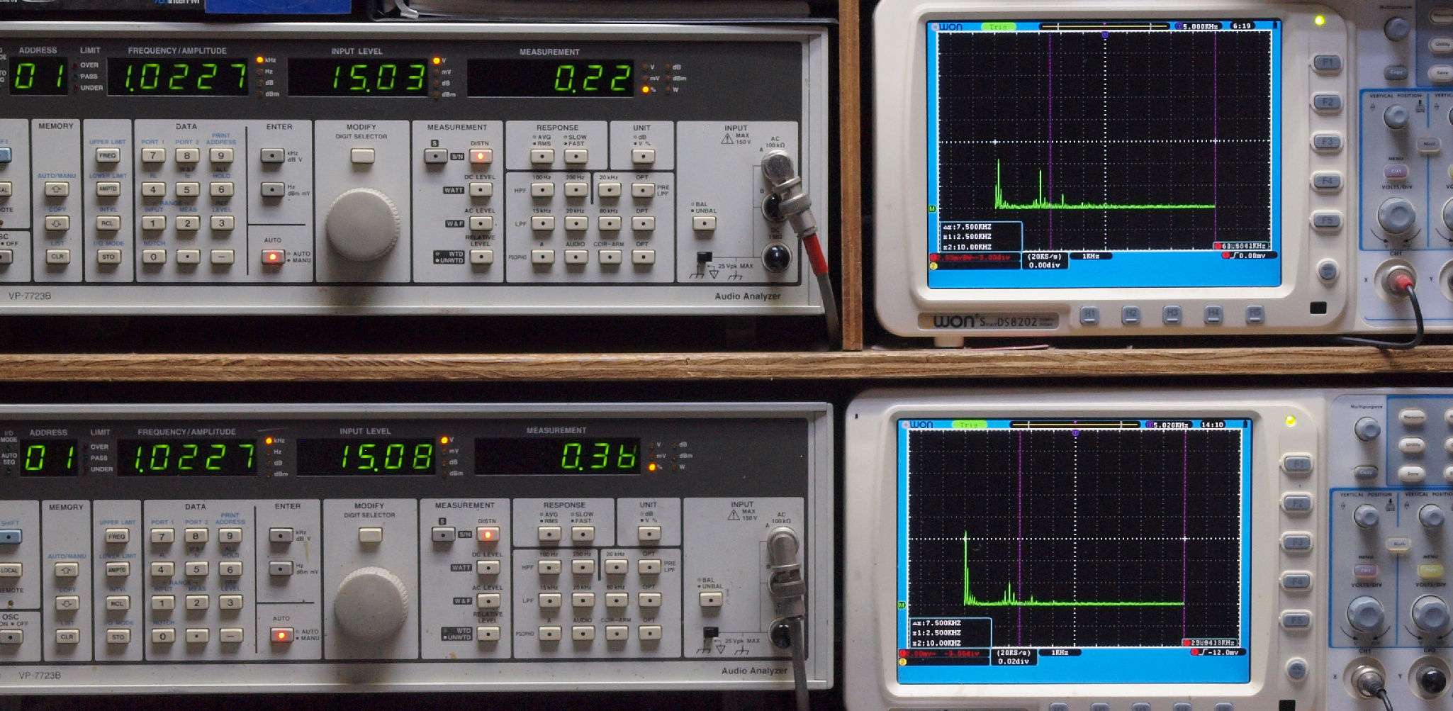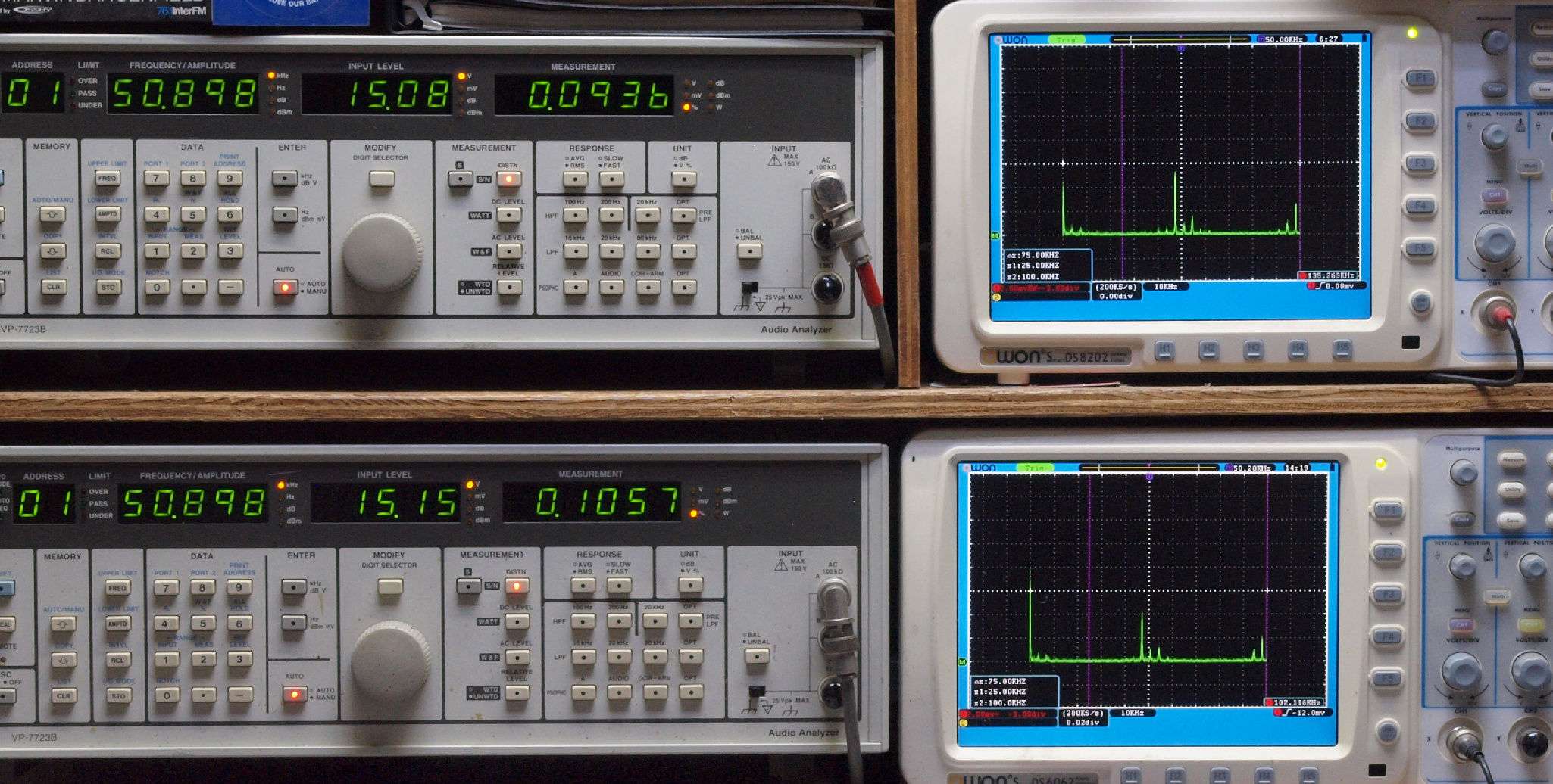 よって、ダイアル設定出力レベルより低くなります。測定機器の仕様や整備の様子はこちら、「VP−7723B」「VP−7201A」。 FFT画面の見方はこちら。