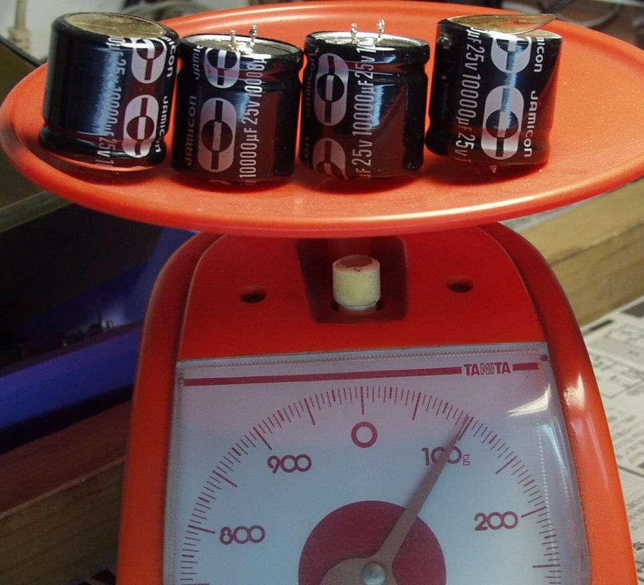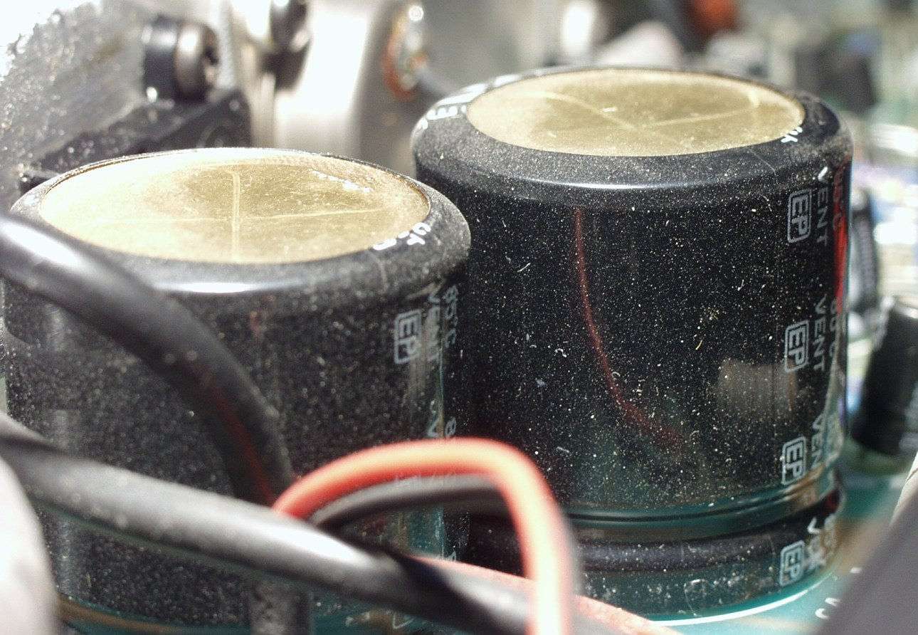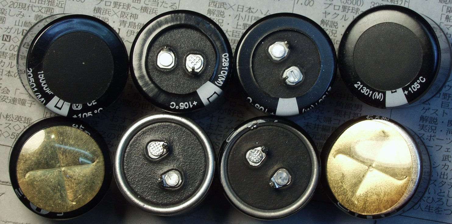 | A2. 修理前 熱のため膨らんだ、電源用電解コンデンサー R側 | ||||||||||||||||||||