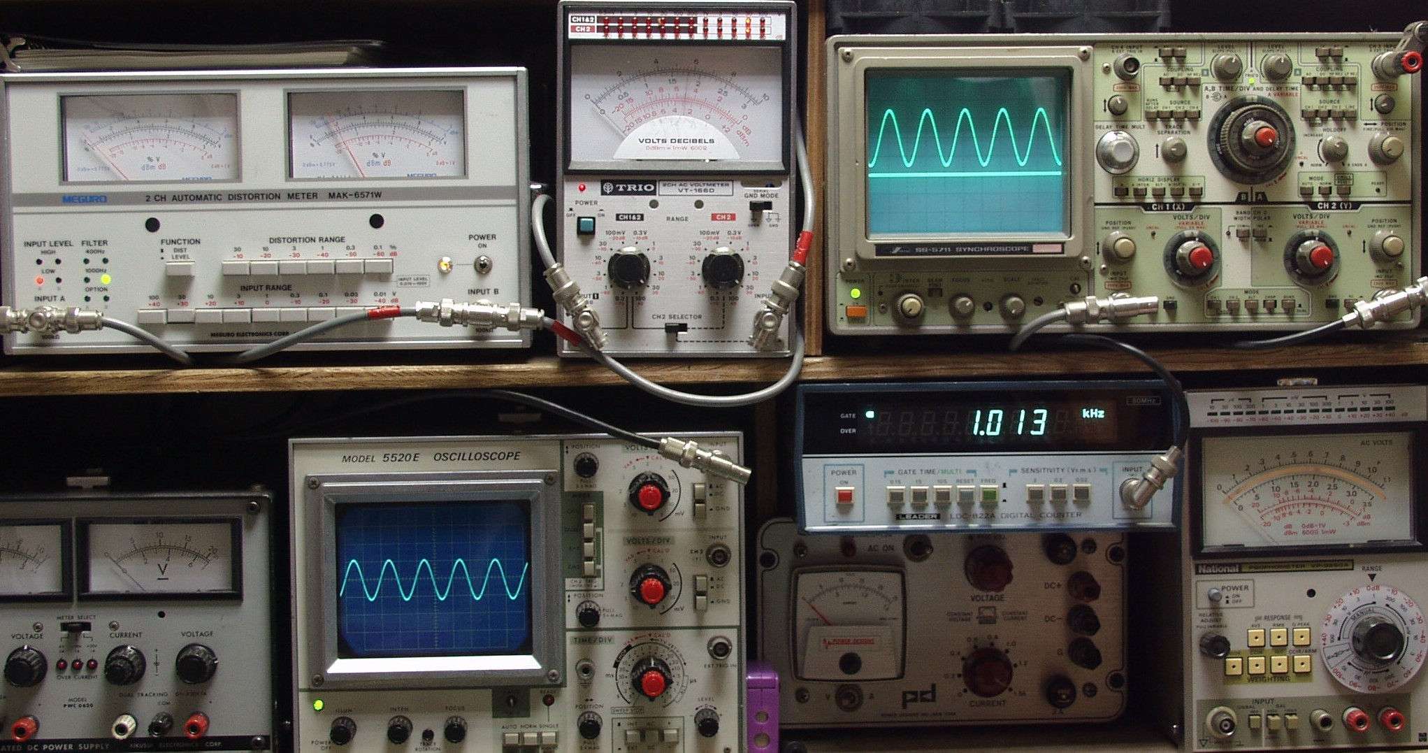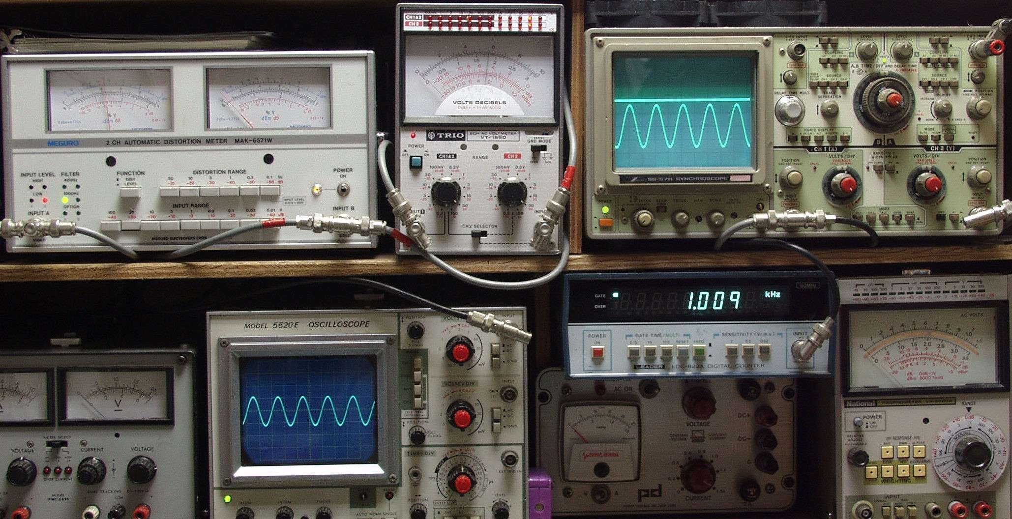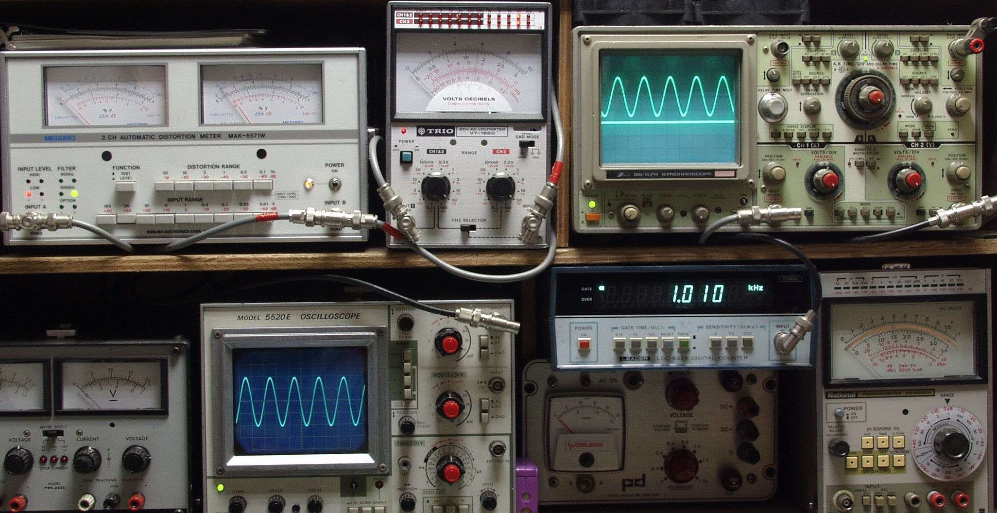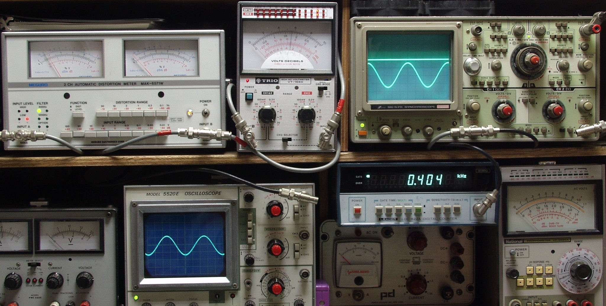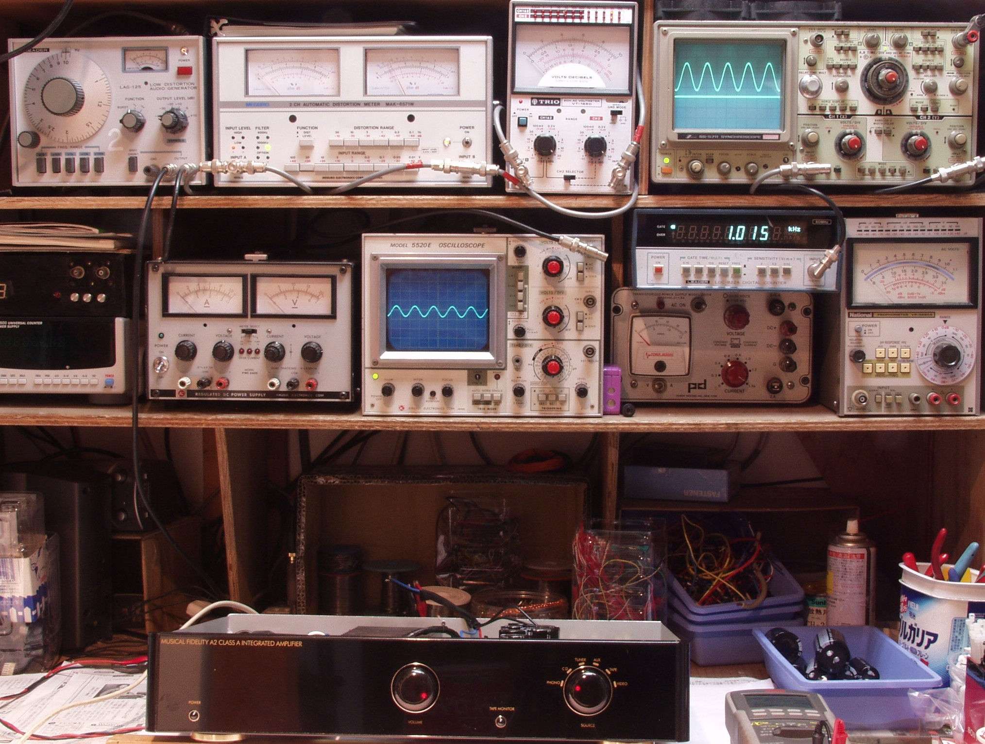 | E. 測定・調整。 E1A. 出力・歪み測定・調整 ノンNFBなので歪みは真空管AMPなみ。 見方 下左オーディオ発振器より400HZ・1KHZの信号を出す(歪み率=約0.003%)。 下中=入力波形(オーディオ発振器のTTLレベル) 下右=周波数計。 上左=SP出力の歪み率測定 左メータ=L出力、右メータ=R出力。 上中=SP出力電圧測定器、赤針=R出力、黒針=L出力。 上右=SP出力波形オシロ 上=R出力、下=L出力(出力電圧測定器の出力)。 |
