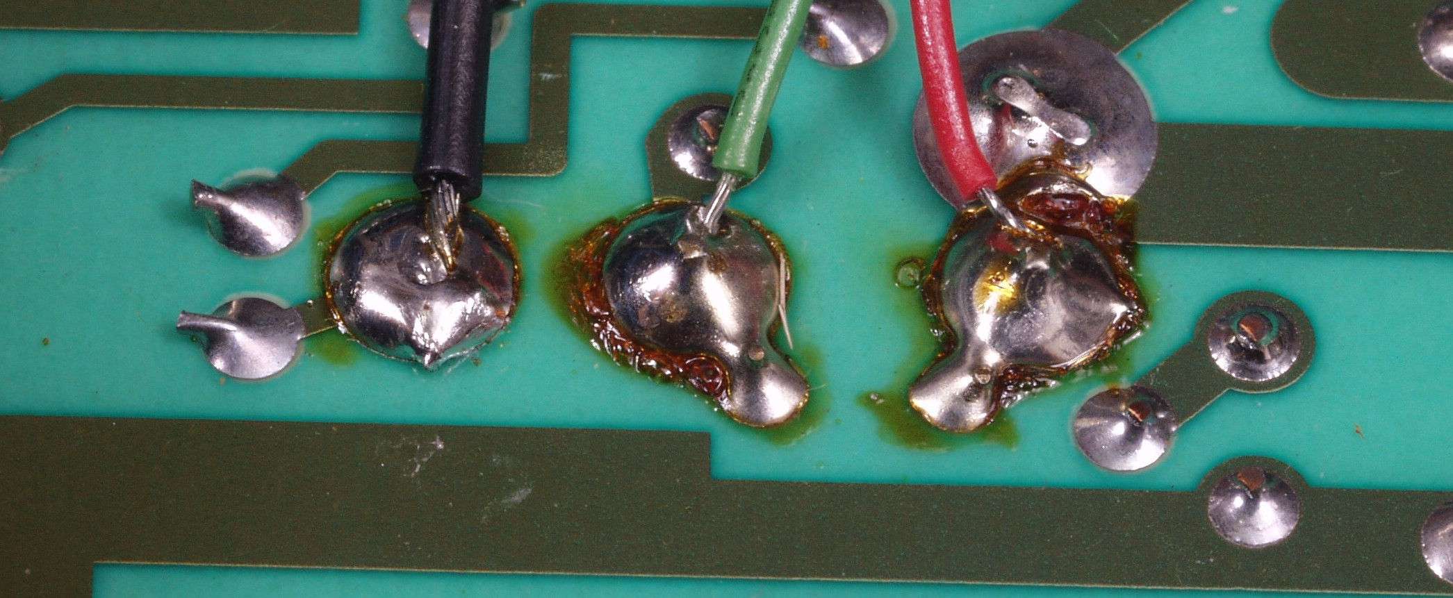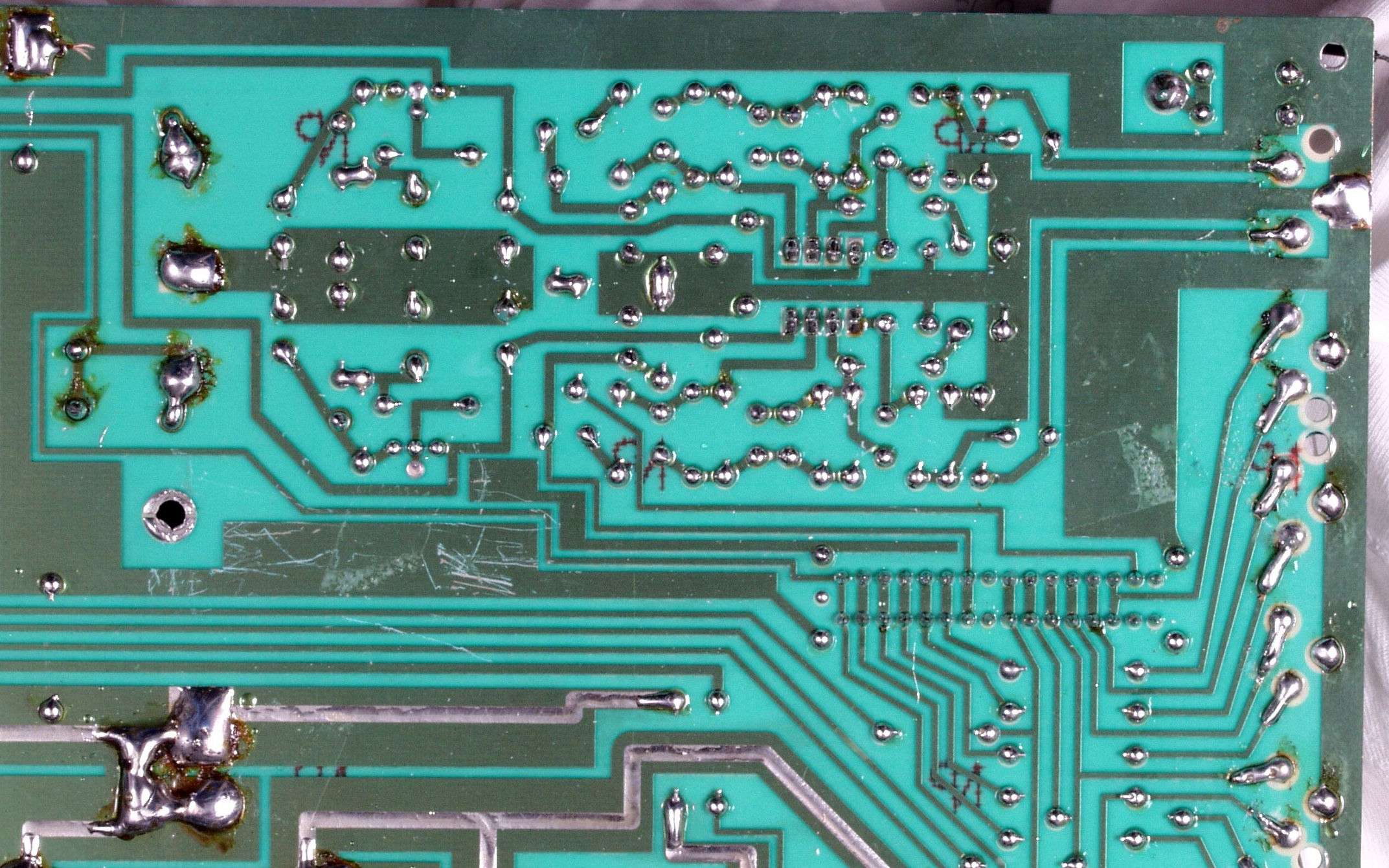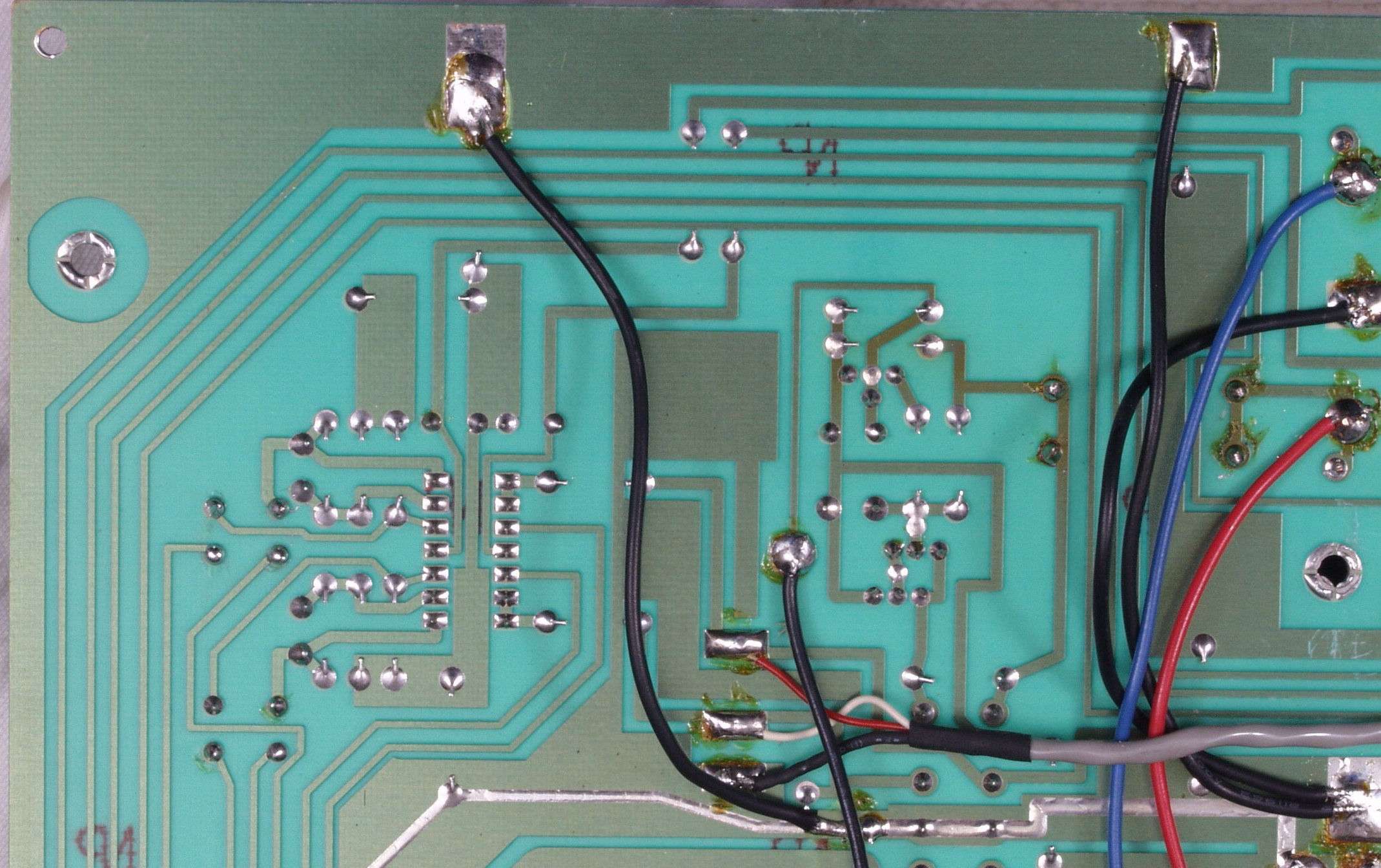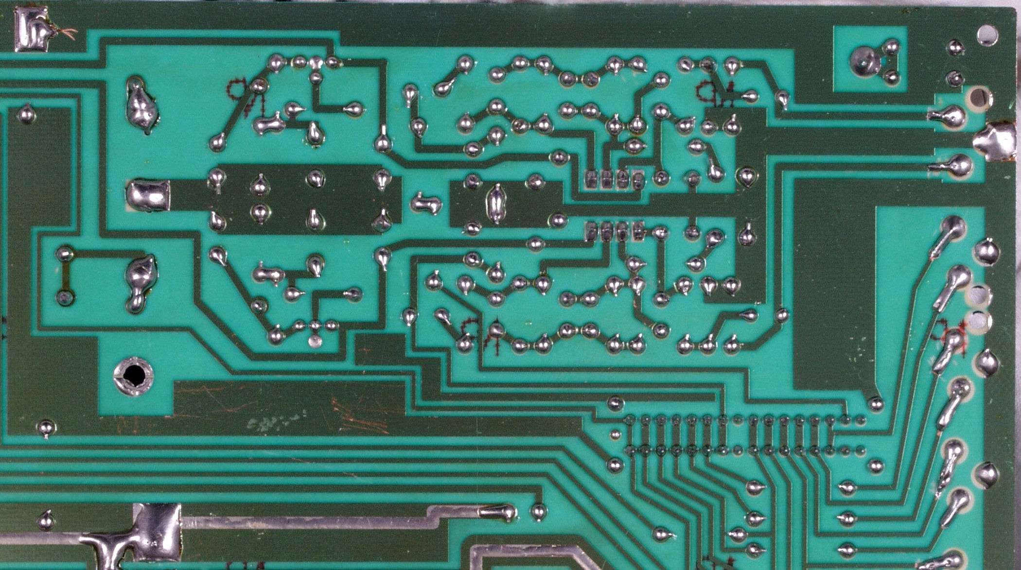 | C3D. 修理(半田補正)後 プリ基板裏、 半田を全部やり直す。 ジャンパー線や引き出し線は、基板の為に、表に移動 | ||||||||||||||||||||||