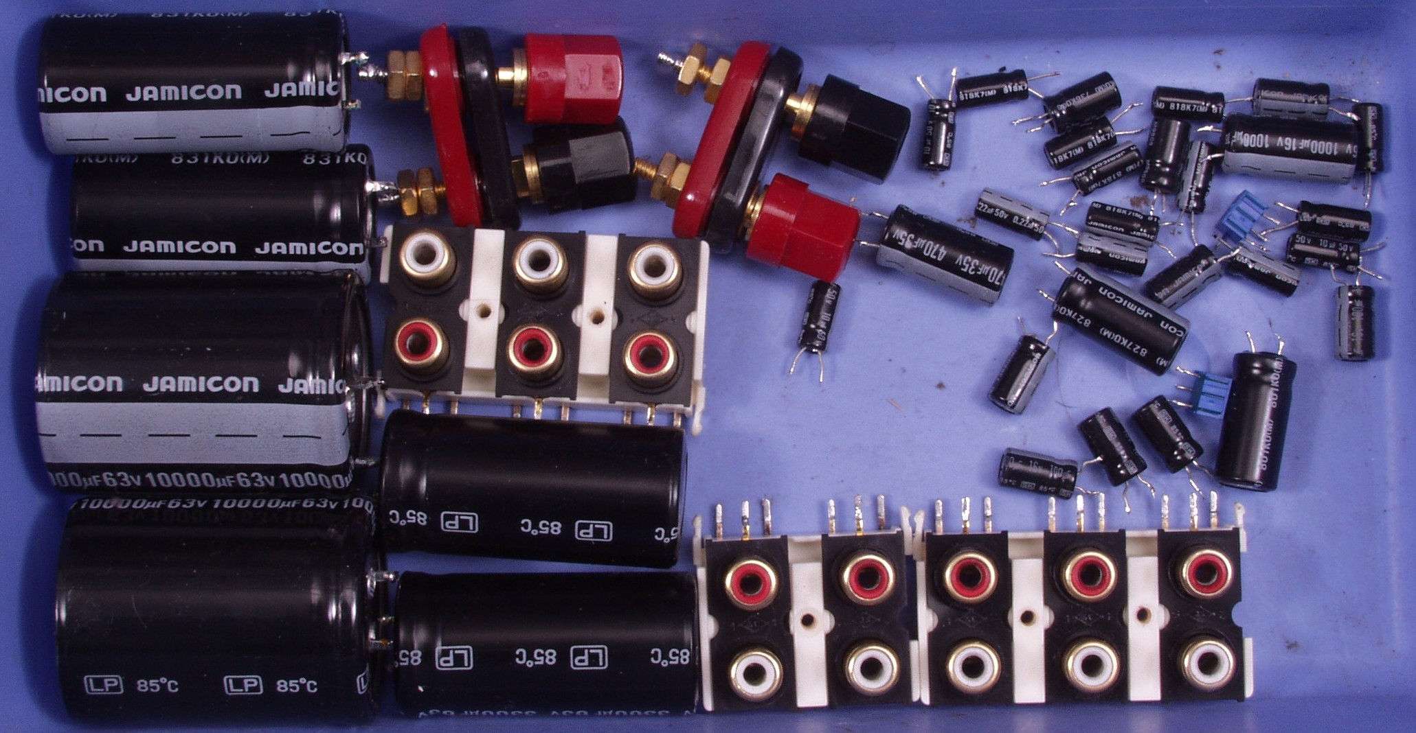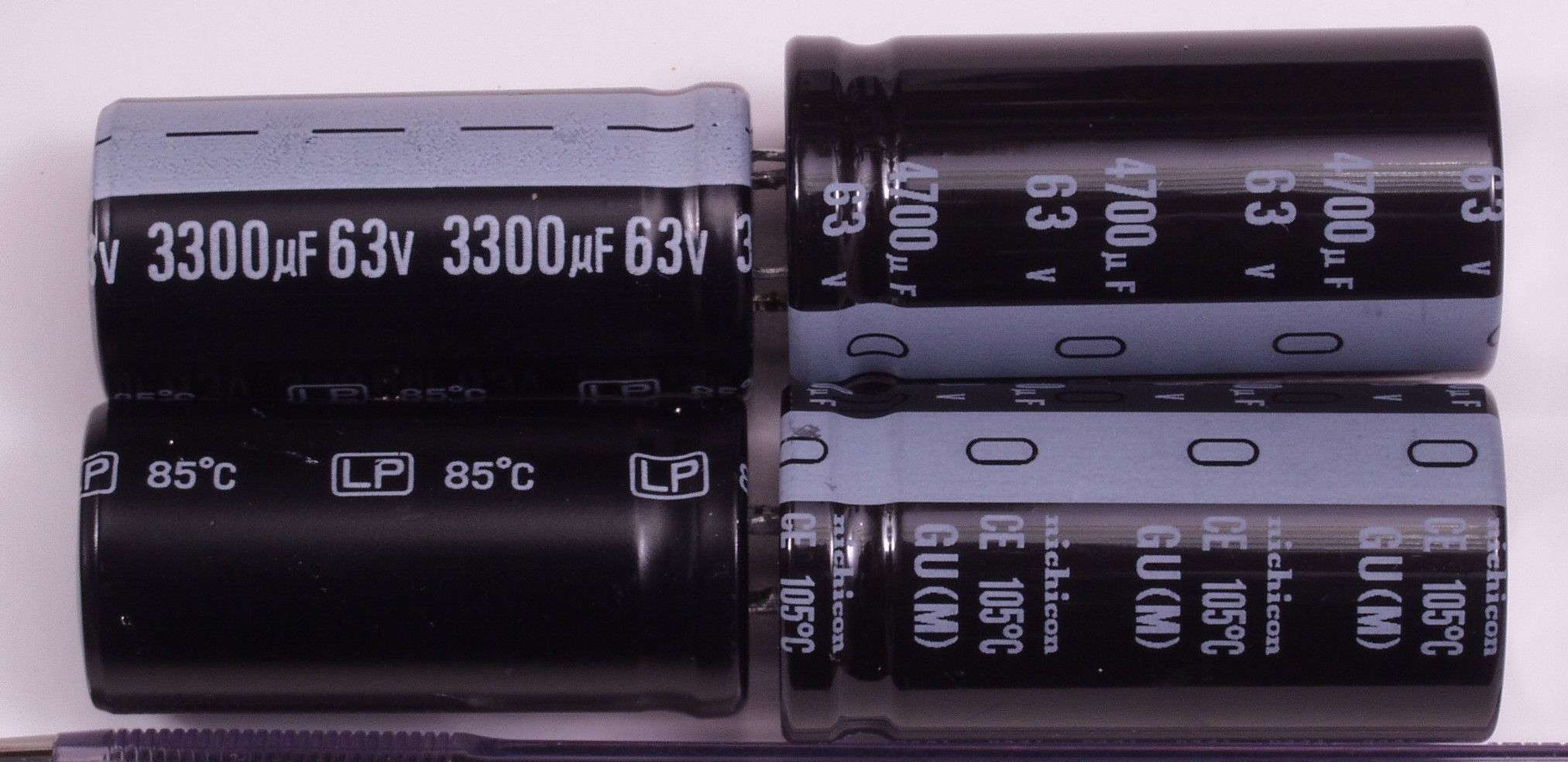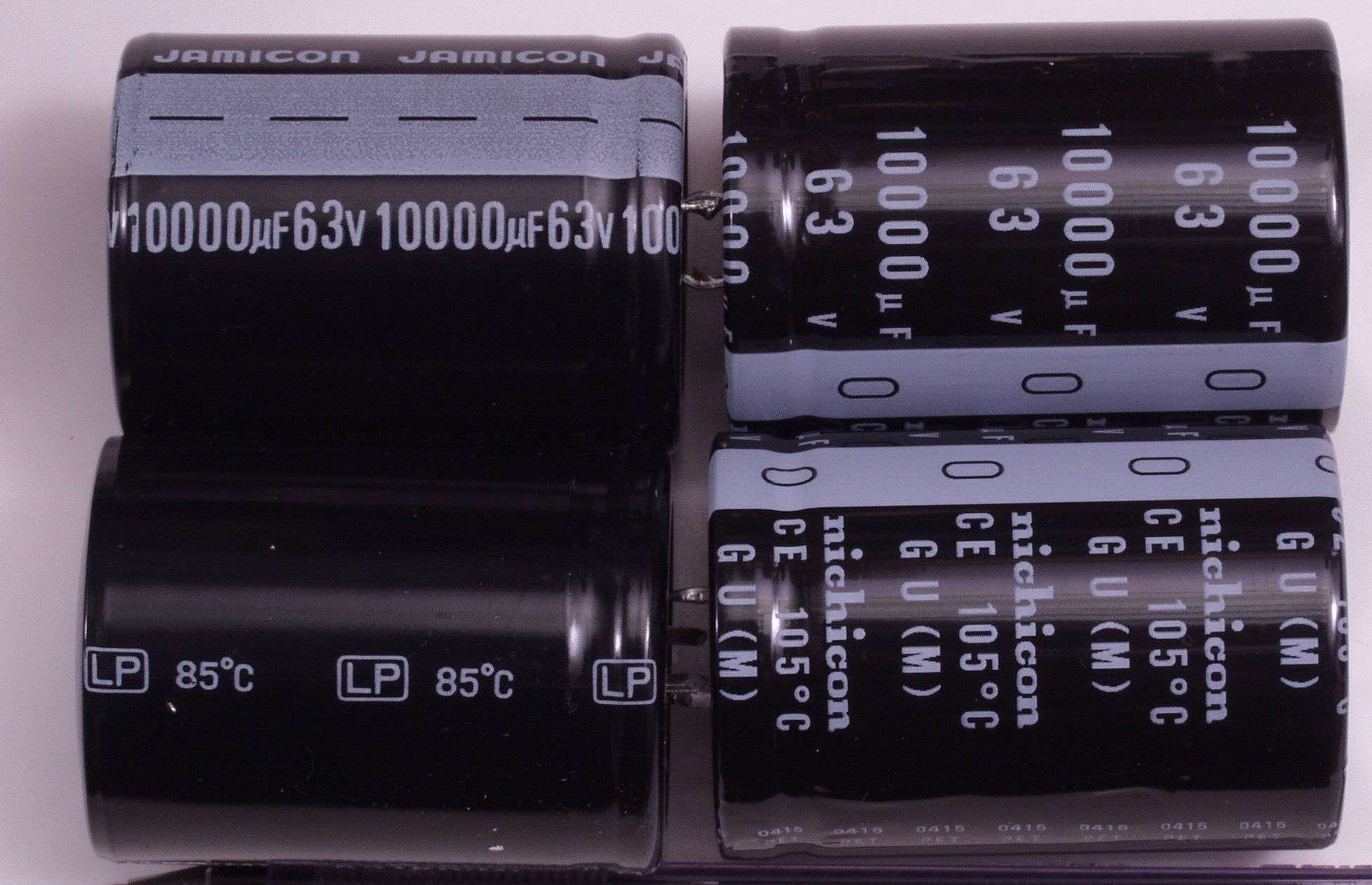 | A6. 点検中 電解コンデンサー比較 左=付いていた物 右=交換する新しい物 3300μ/63V/85度C 4700μ/63/105度C |