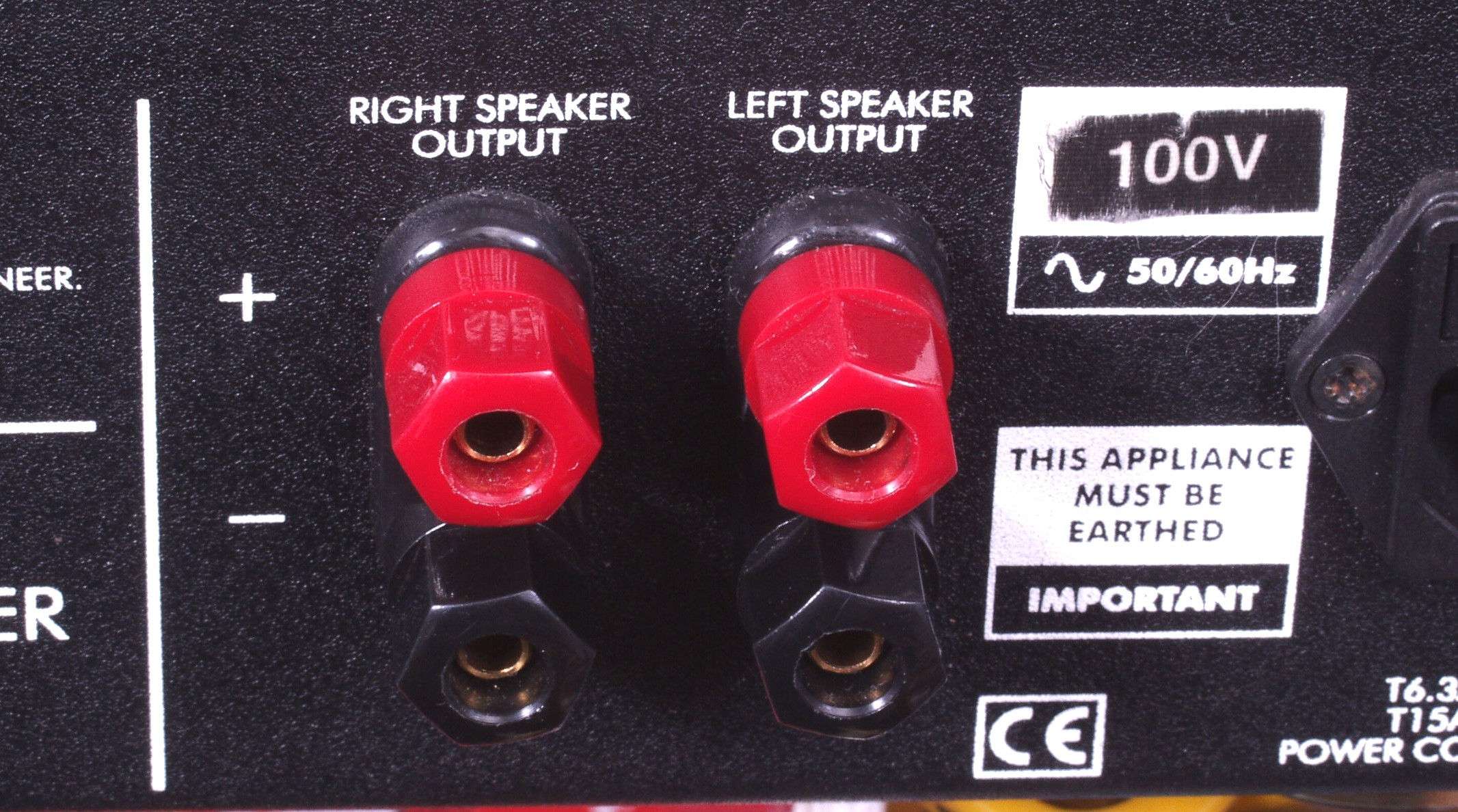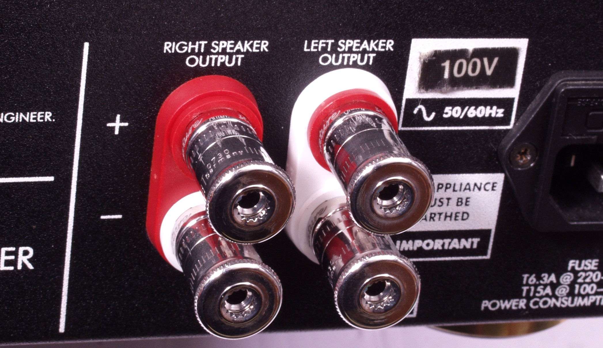 | このAMPはSP接続リレーが装備されておりません。 電源入切り時にSPに直流が流れます、ネットワークを装備していないSPを接続する時は、十分注意してください。 |