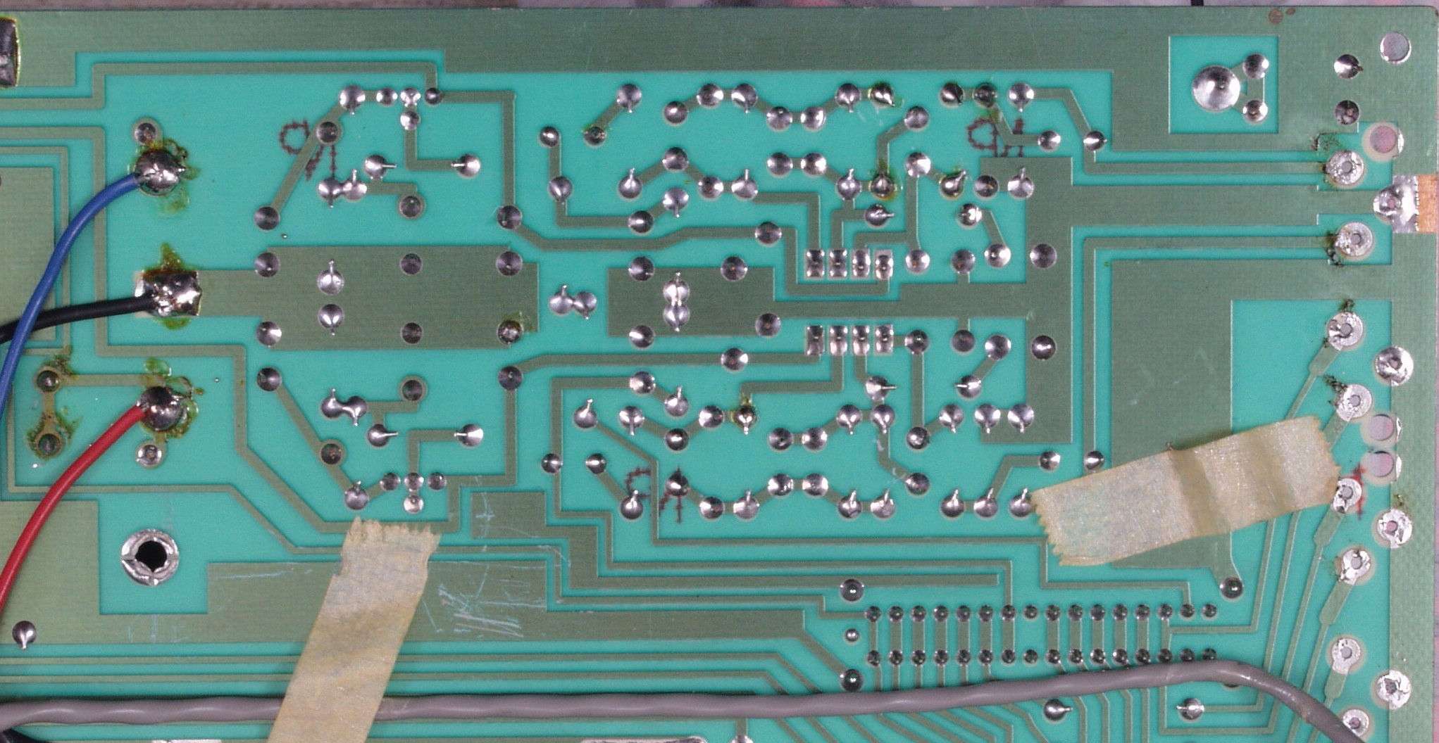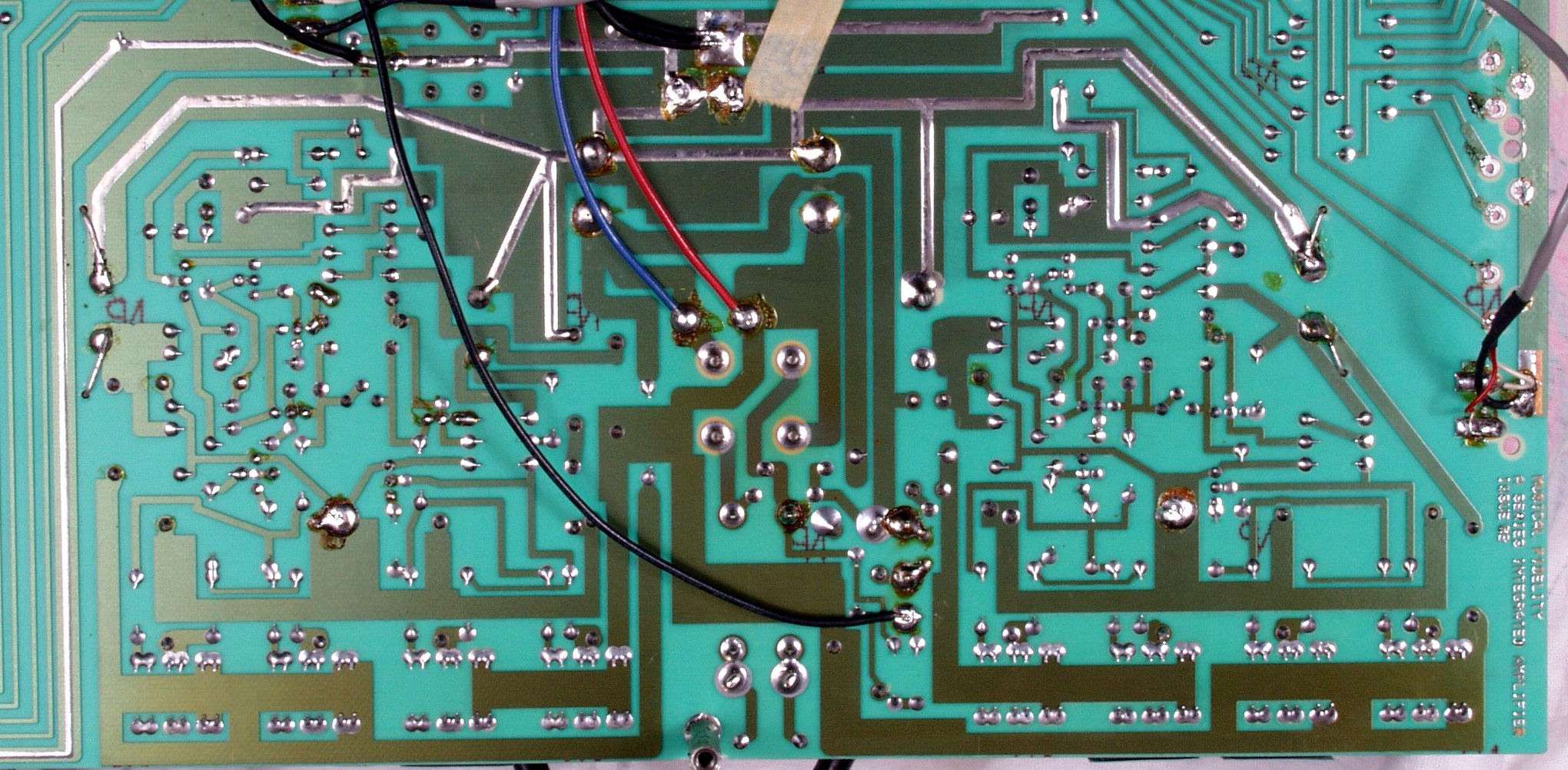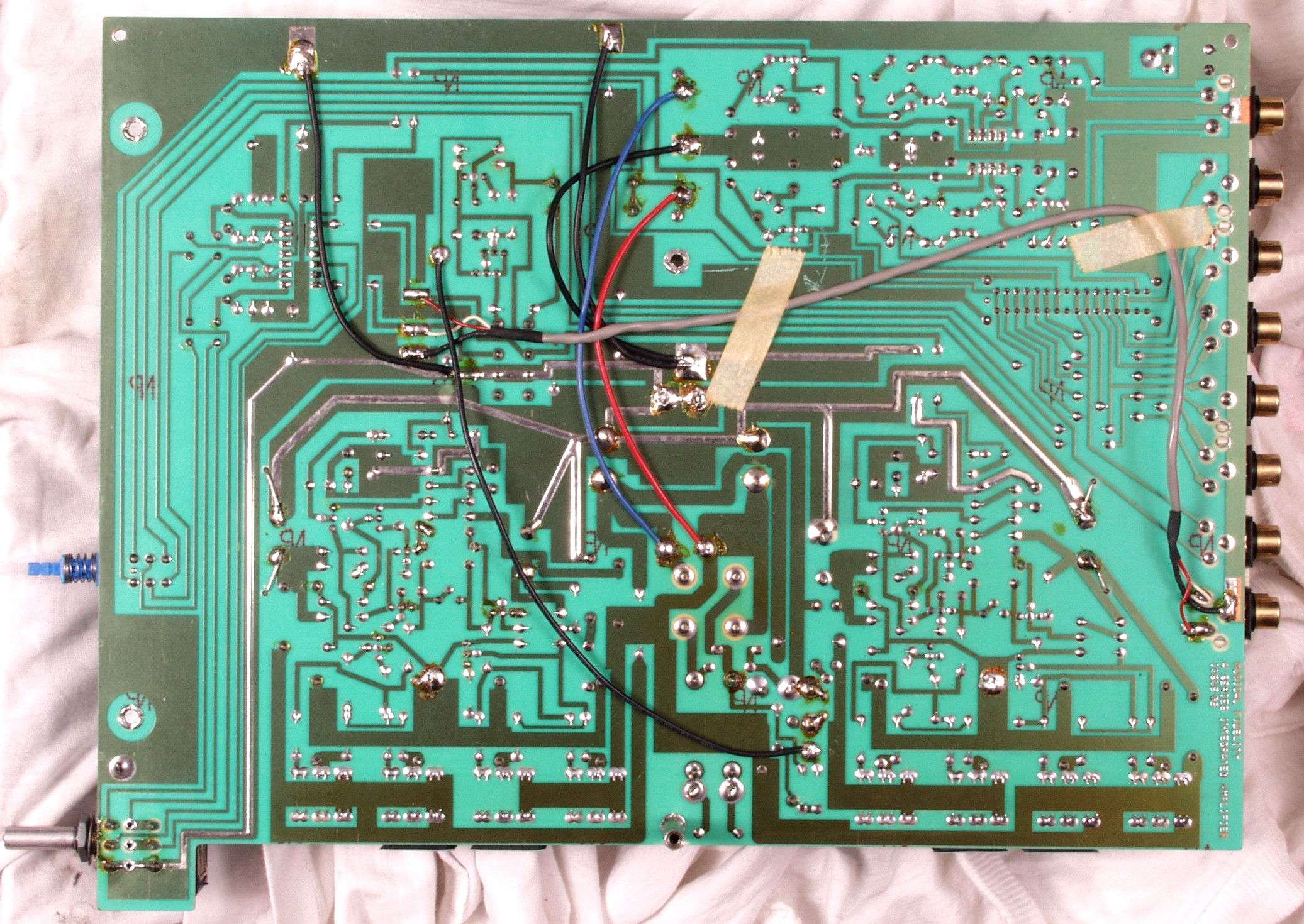 | C4D. 修理(半田補正)後 EQ基板裏、 半田を全部やり直す。 ジャンパー線や引き出し線は、基板の為に、表に移動 | ||||||||||||||||||||||