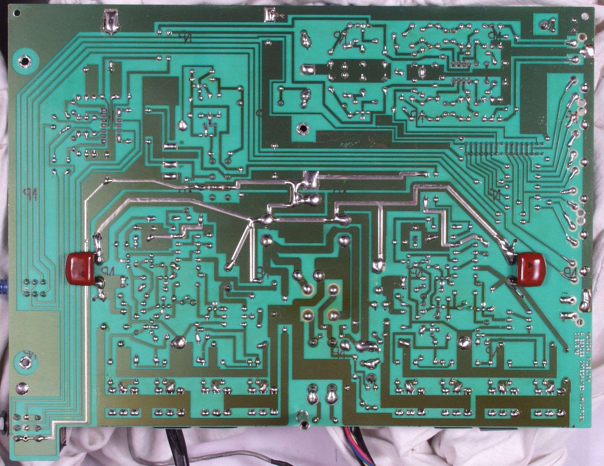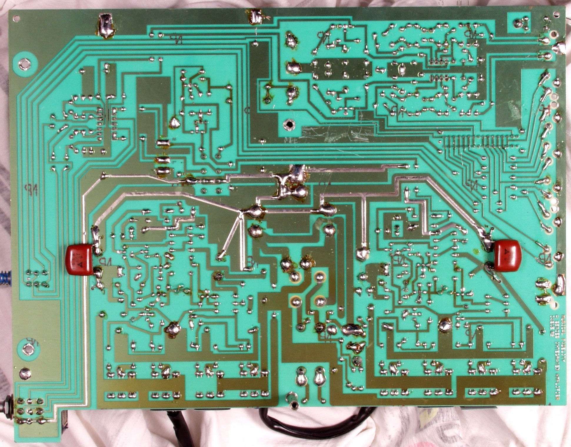 | C2D. 修理(半田補正)後 AMP基板裏、 半田を全部やり直す。 ジャンパー線や引き出し線は、基板の為に、表に移動 | ||||||||||||||||||||||
