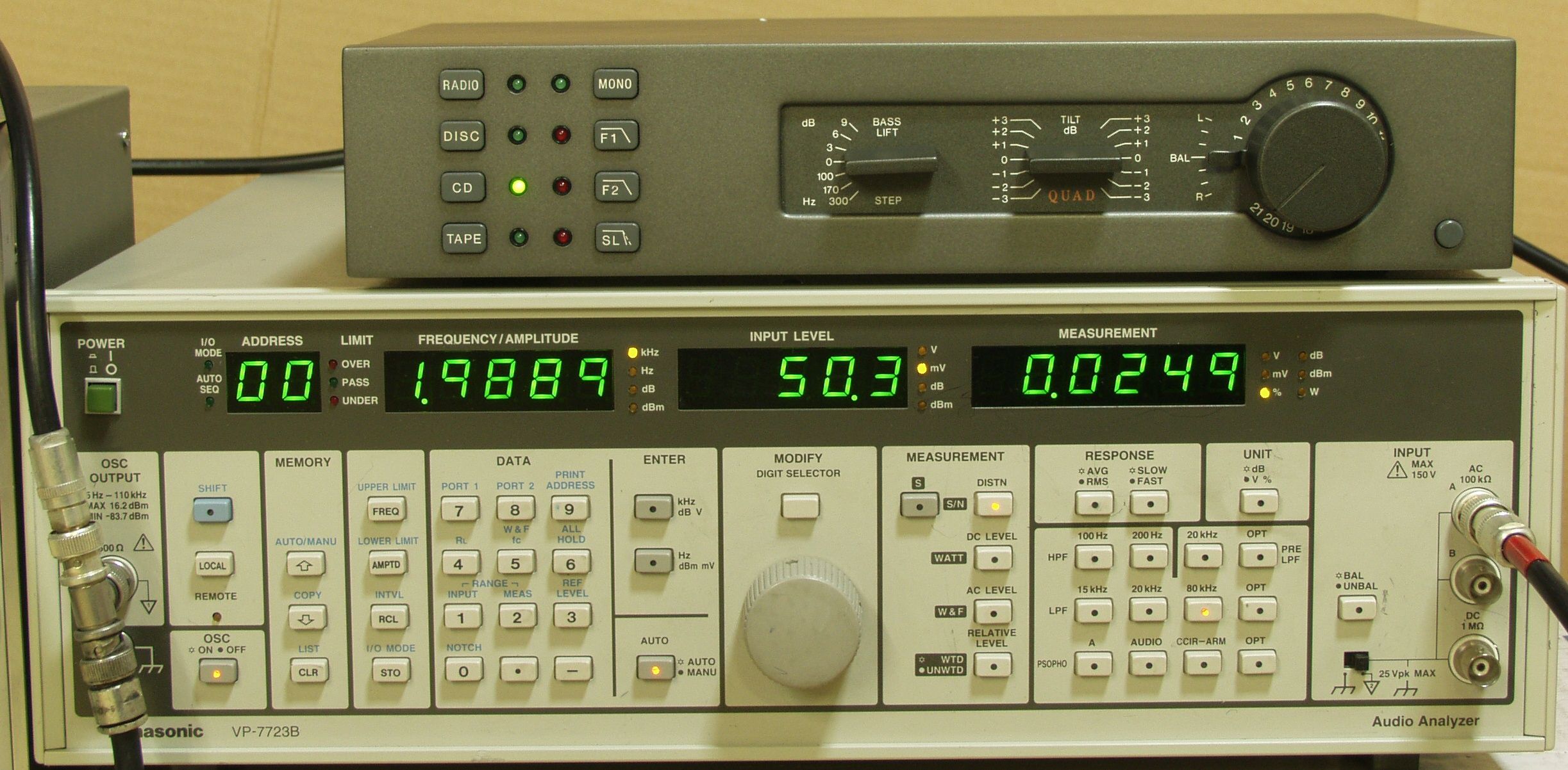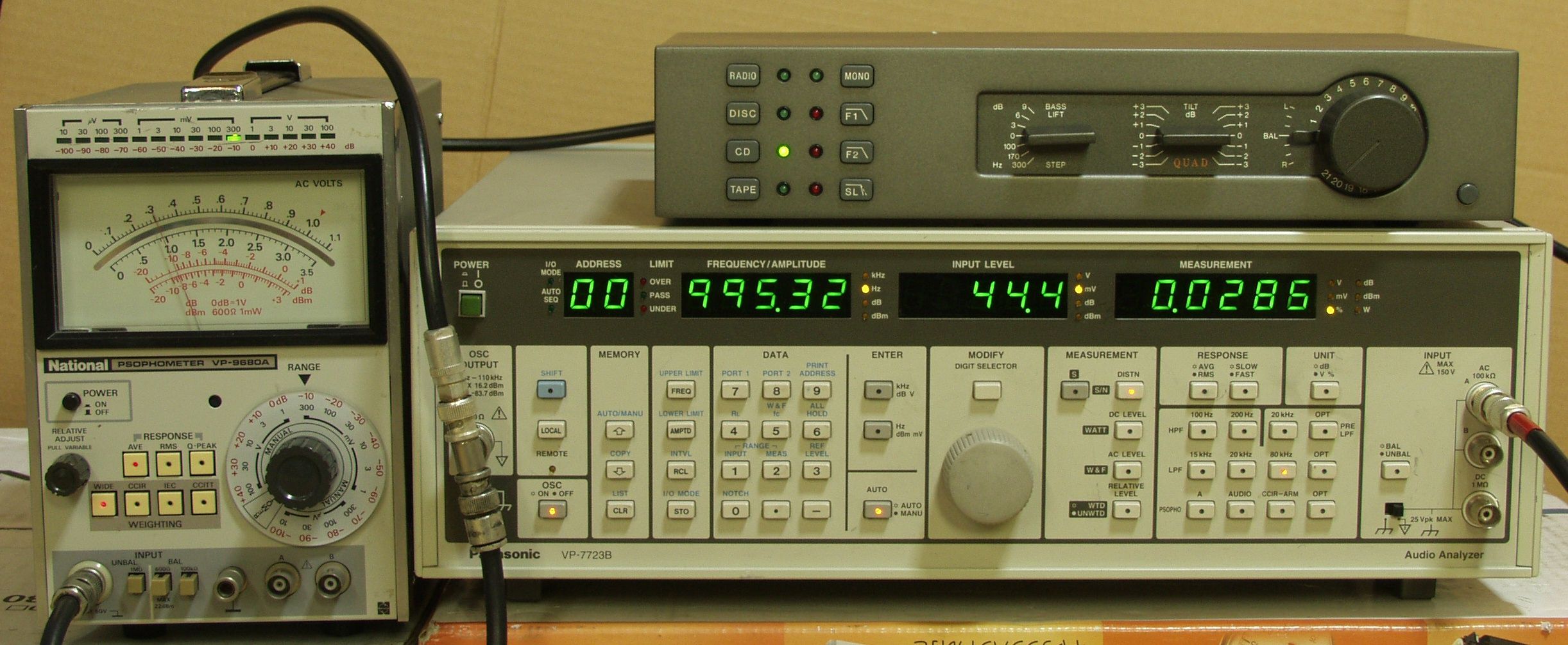 上段中左 歪み率計=出力の歪み率測定 左メータ=L出力、右メータ=R出力