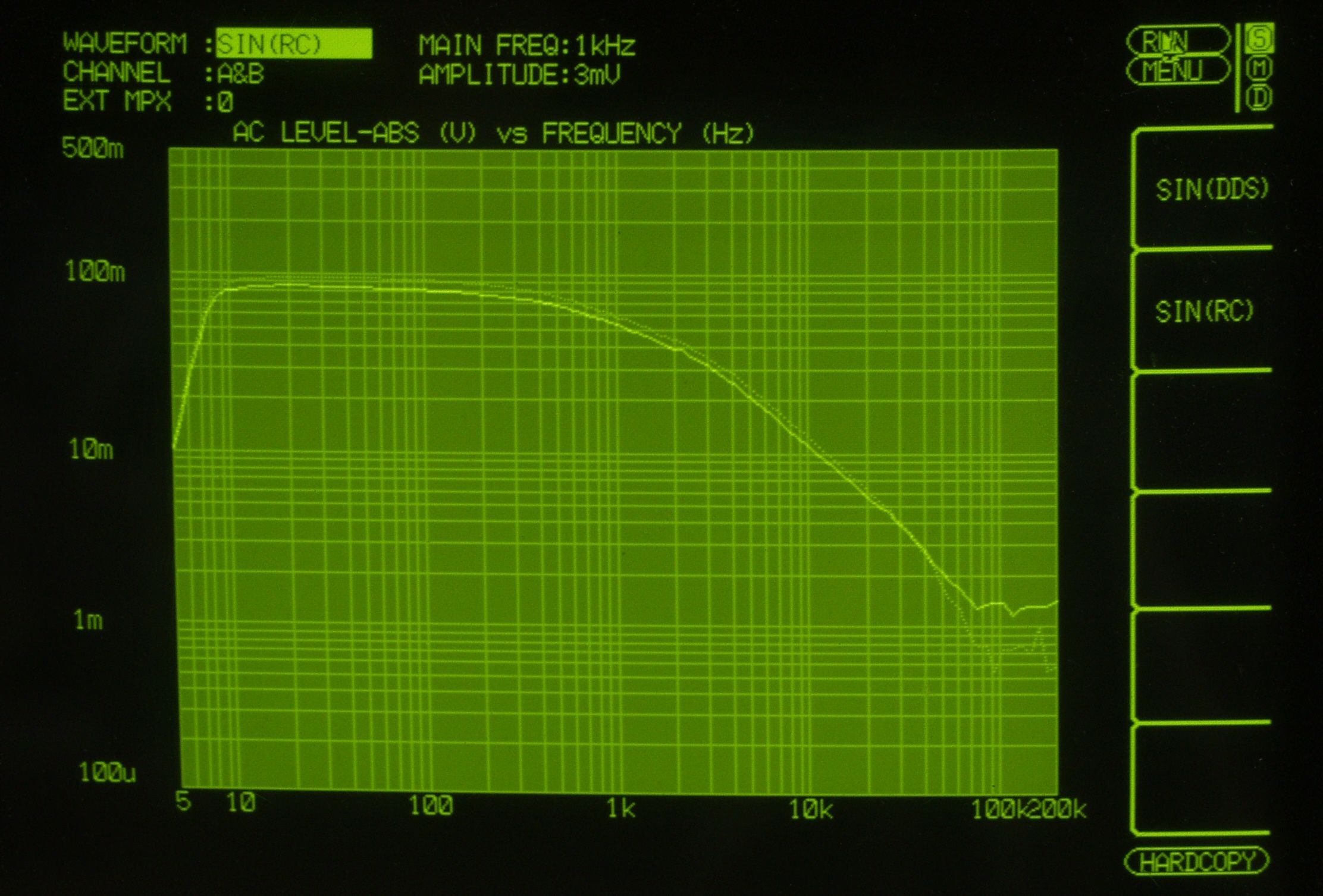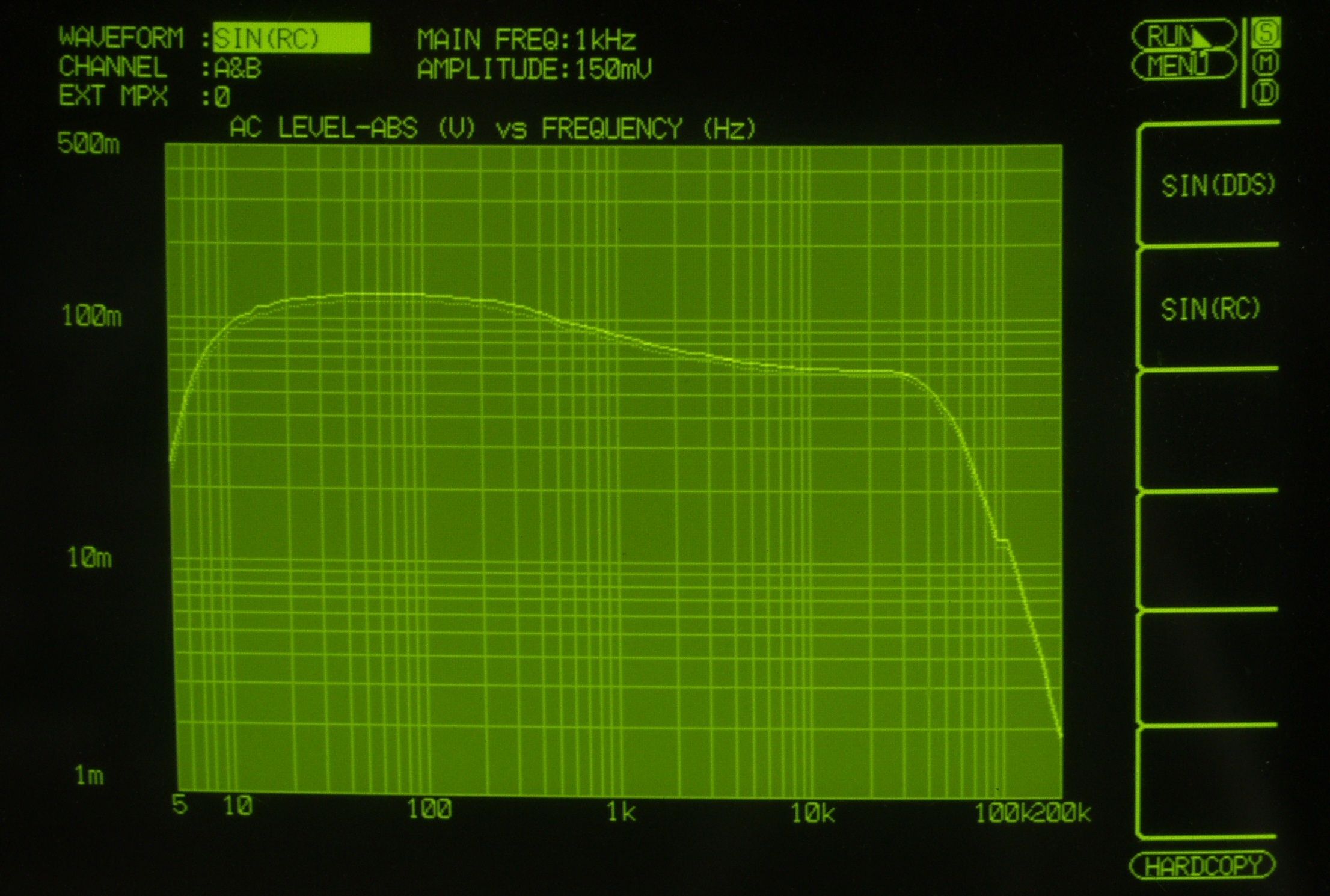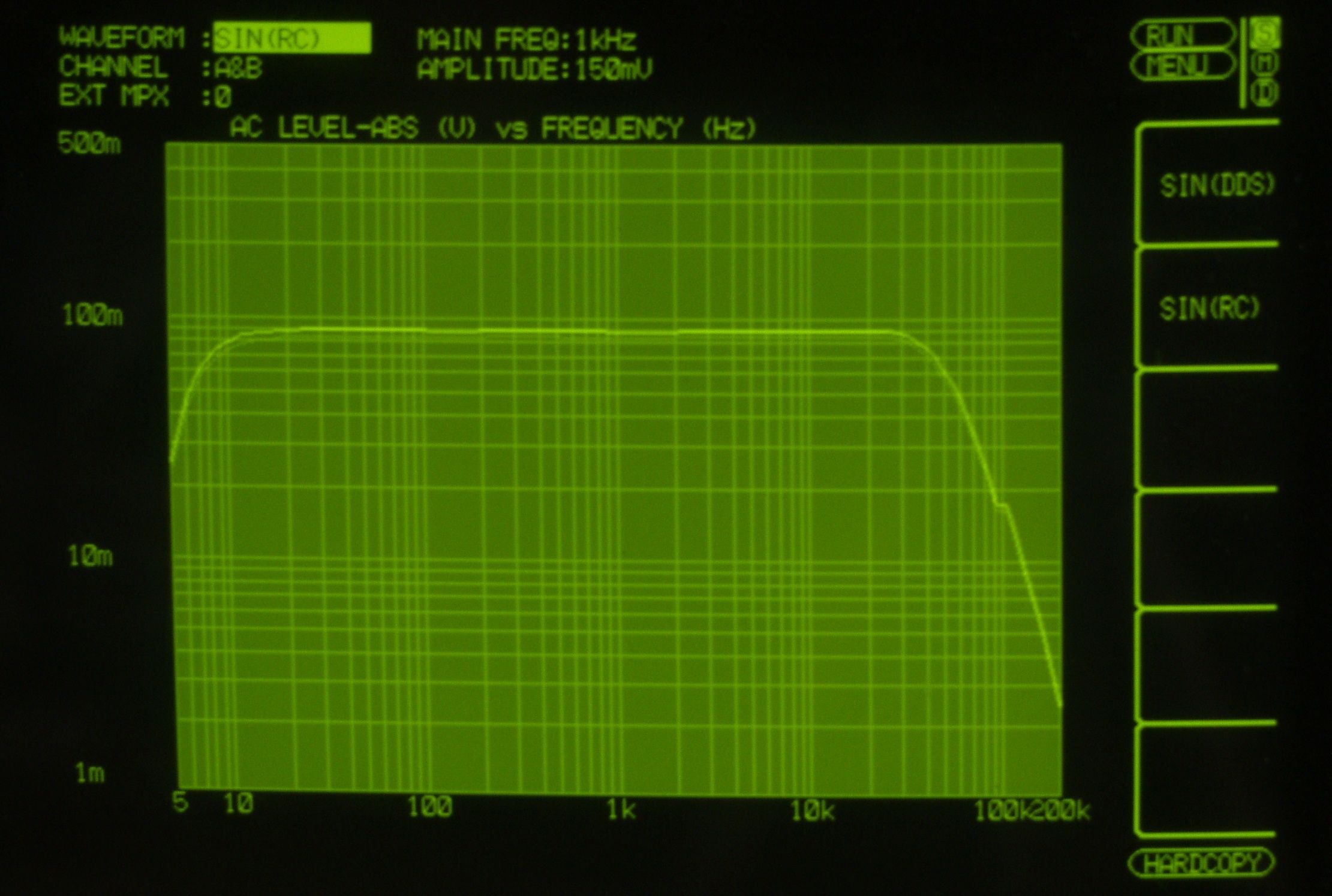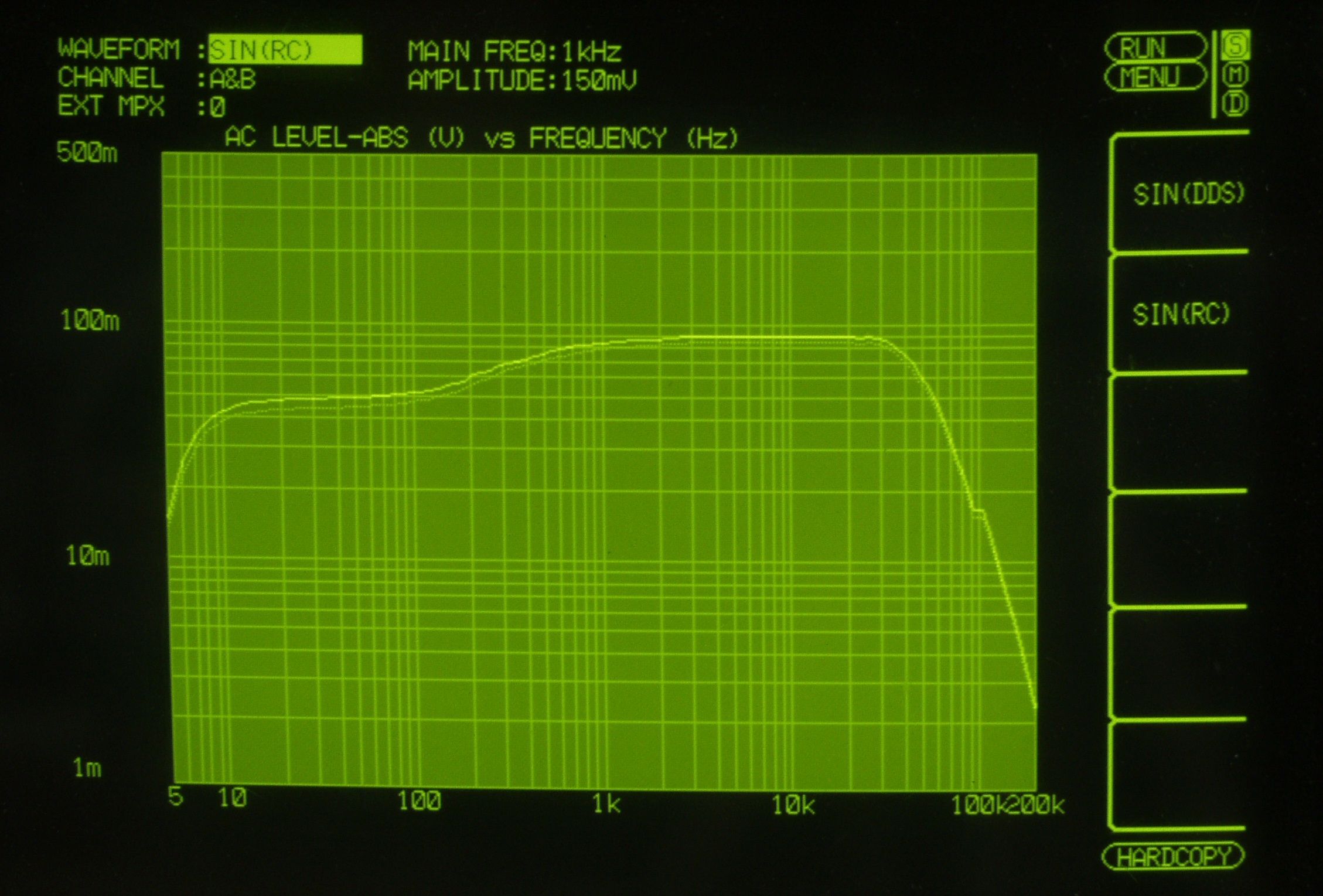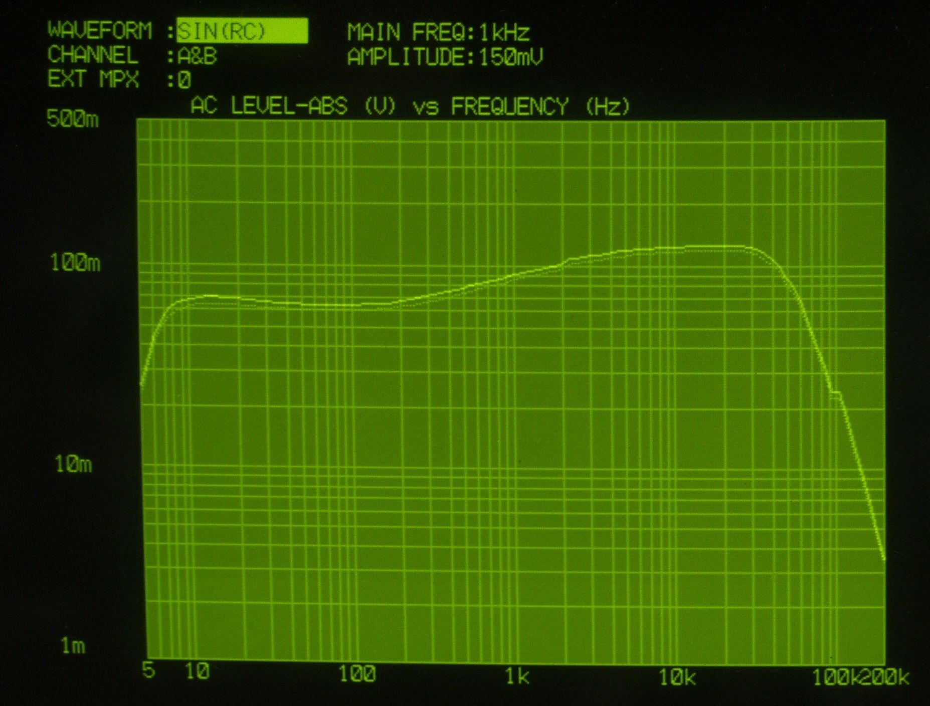 F5. 入出力特性測定(CD入力)。 150mVを入力。 TILT 低域=−3dB、高域=+3dB。 VRはMax位置。