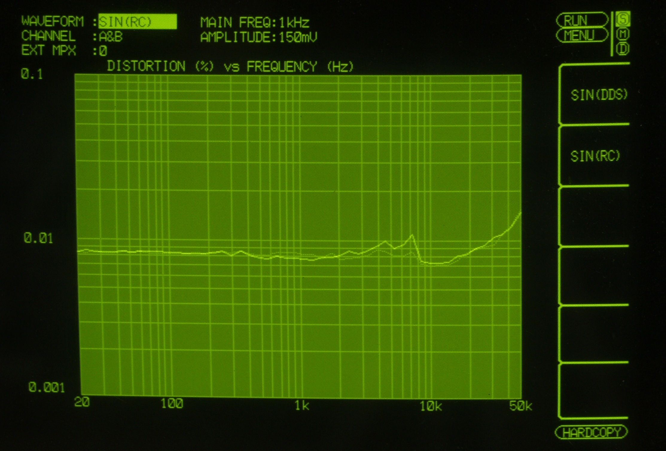 F2. 入出力歪み測定。CD入力端子に150mVを入力。 VRはMax位置。