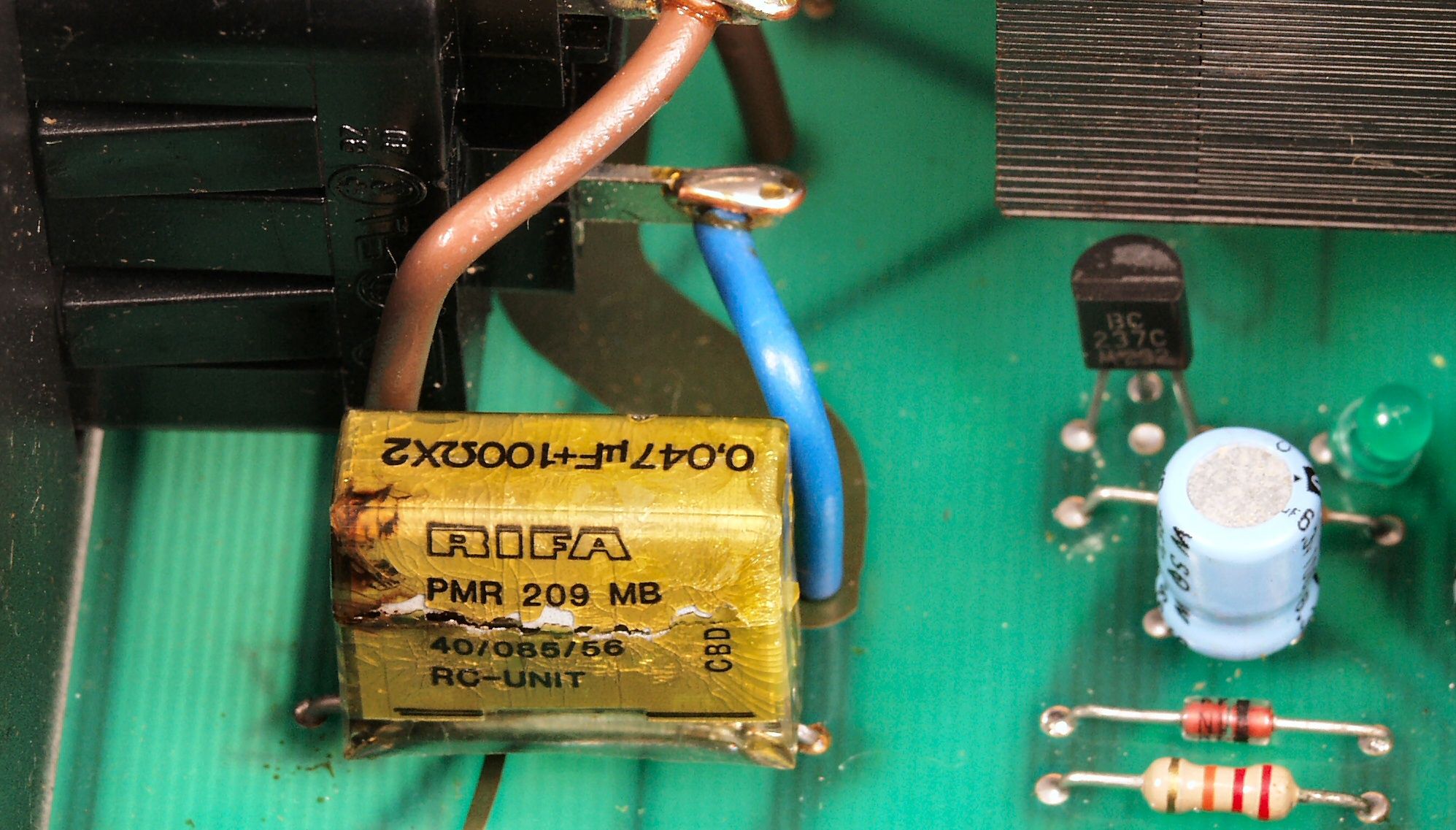 A3. 点検中 膨らみ、ヒビの入った雑音防止コンデンサー