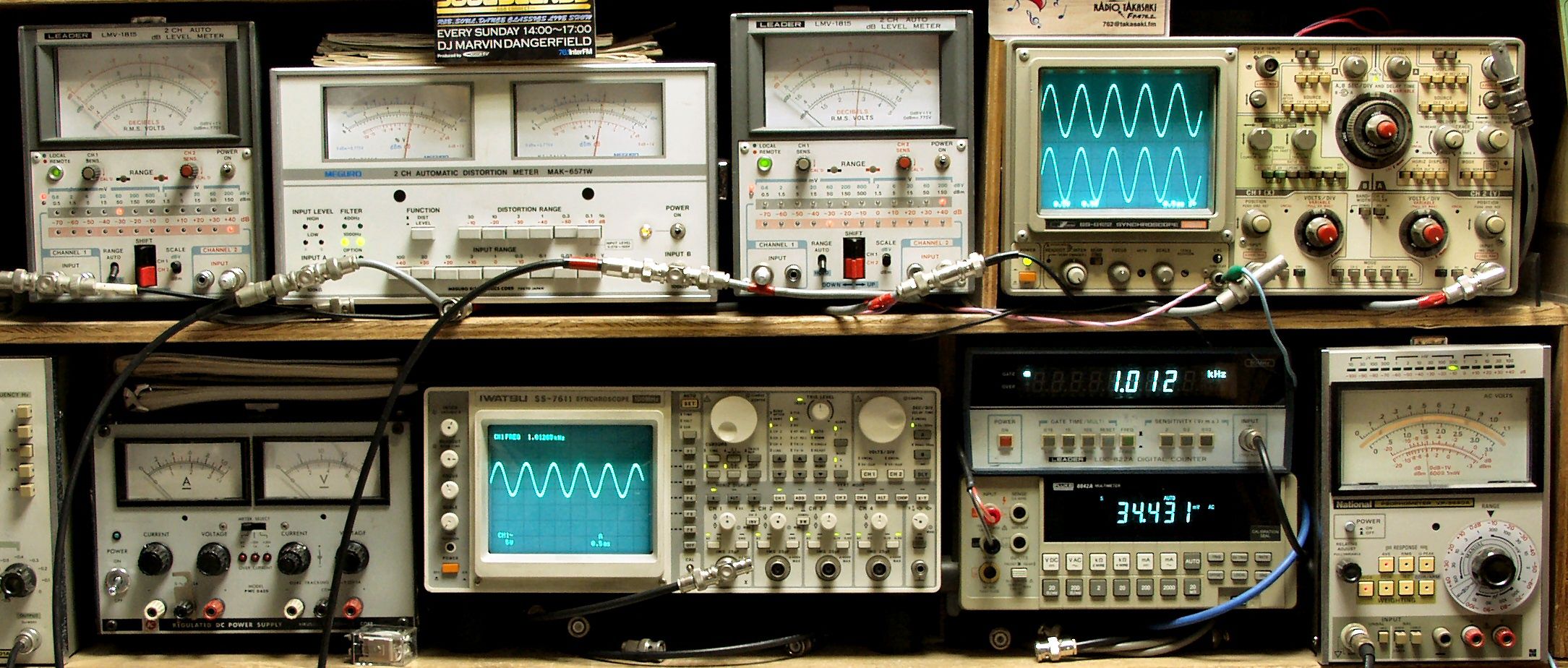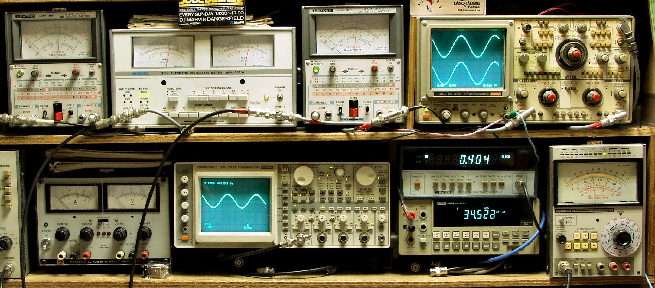 下段左端 オーディオ発振器より400HZ・1KHZの信号を出し(歪み率=約0.003%)これをAMPに入力し、出力を測定