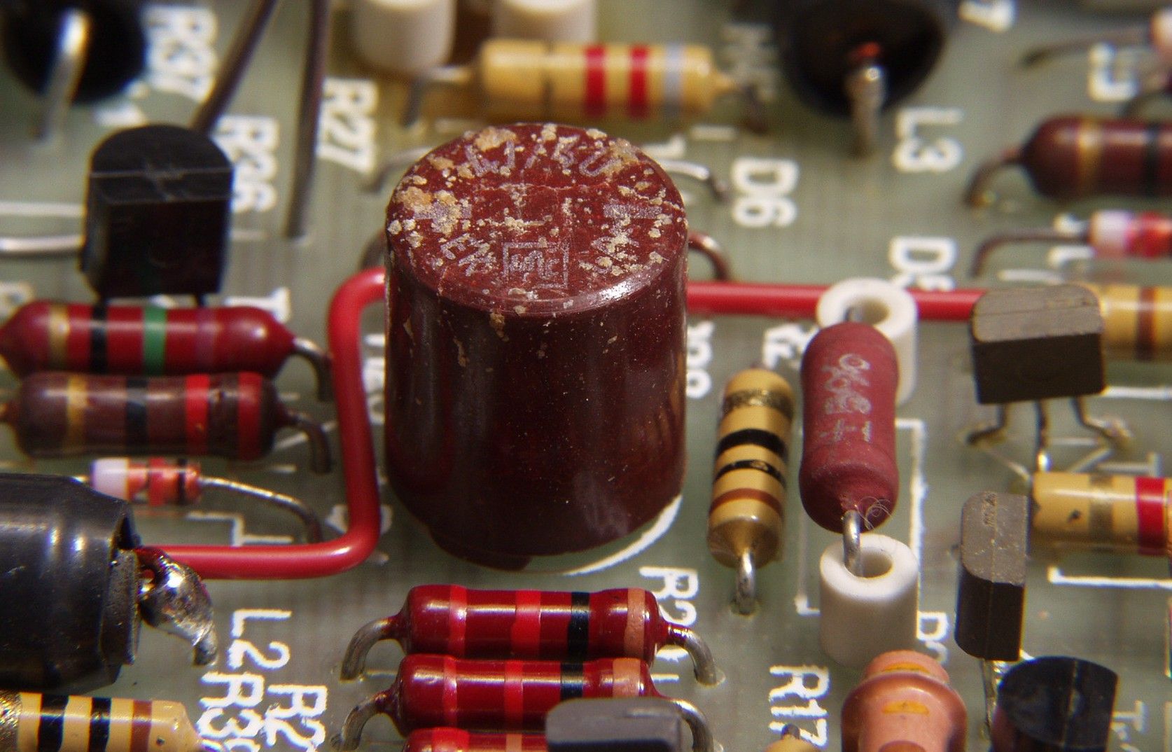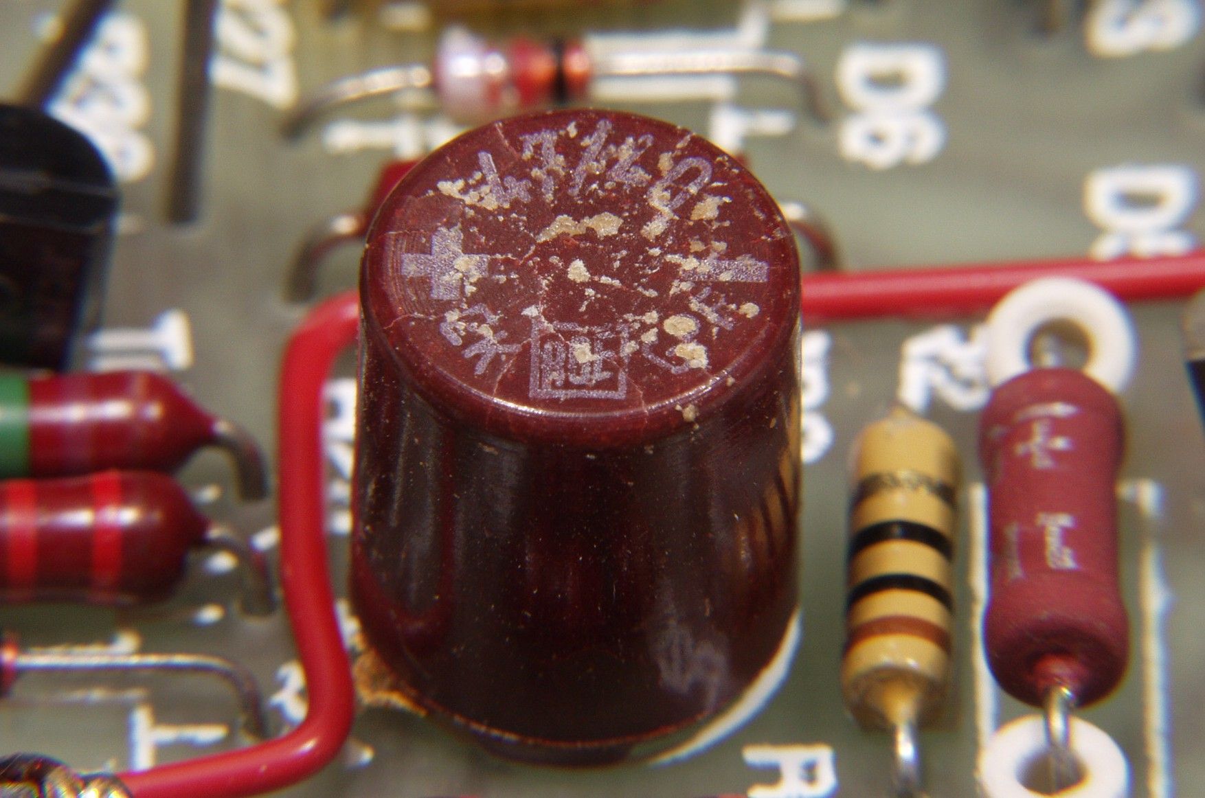 | C1A1. 修理前 R側AMP基板のヒビの入った電解コンデンサー | ||||||||||||||||||||||||||||||||||
