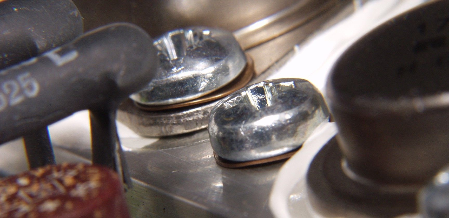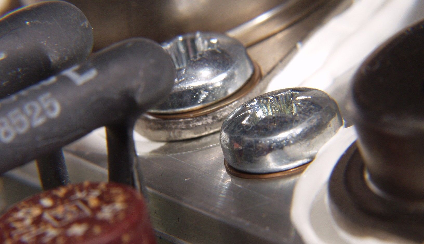 | C2A1. 修理中 L側AMP基板 TR(トランジスター)の止めネジが緩んでいる、ワッシャーの所に隙間がある |