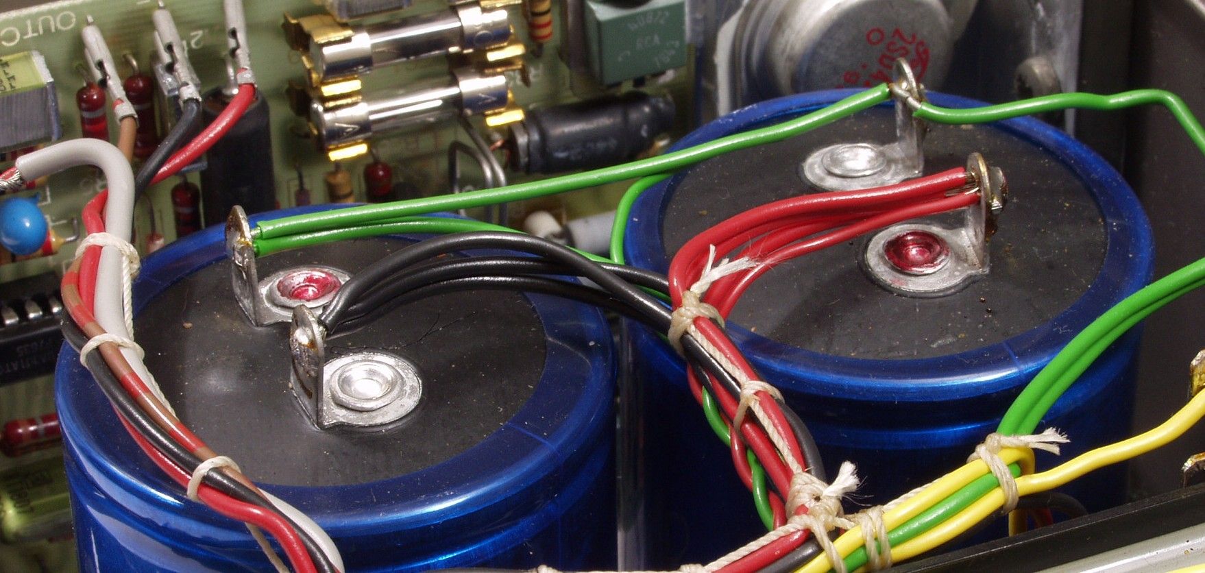 | A2A. 点検中 膨らんだ電解コンデンサー、奥にはR−AMPの安全フューズが溶断している | ||||||||||||||||||||||||||||||||||