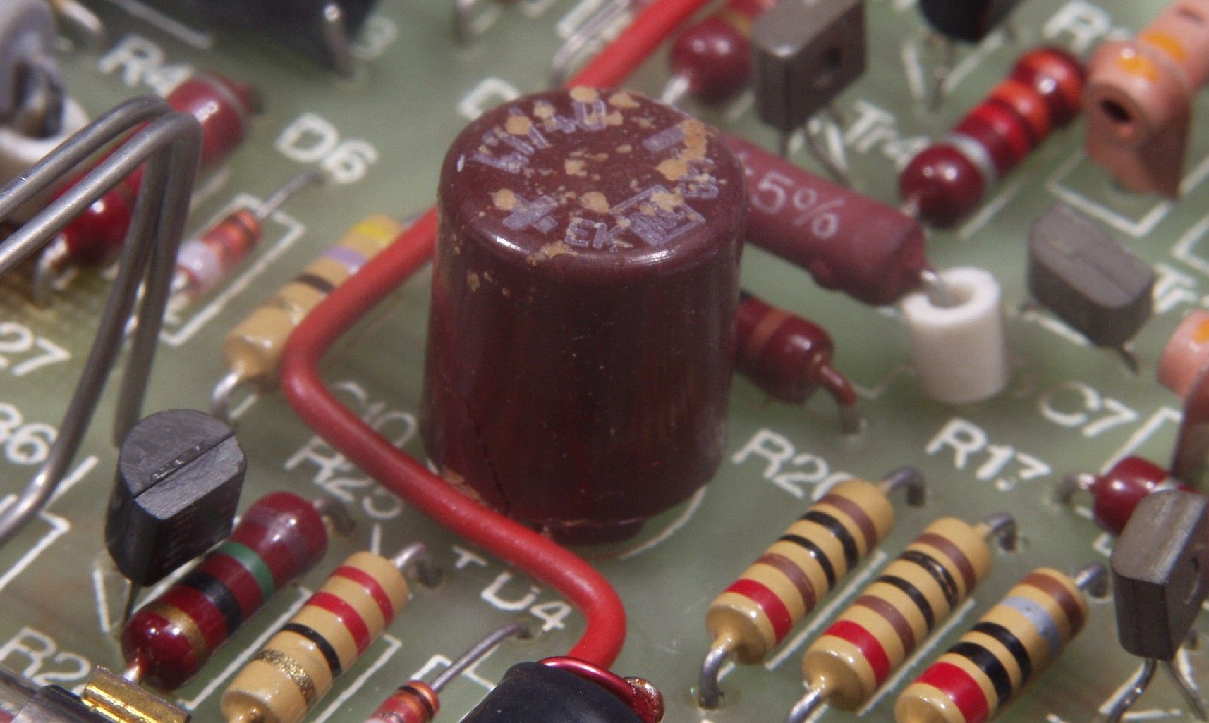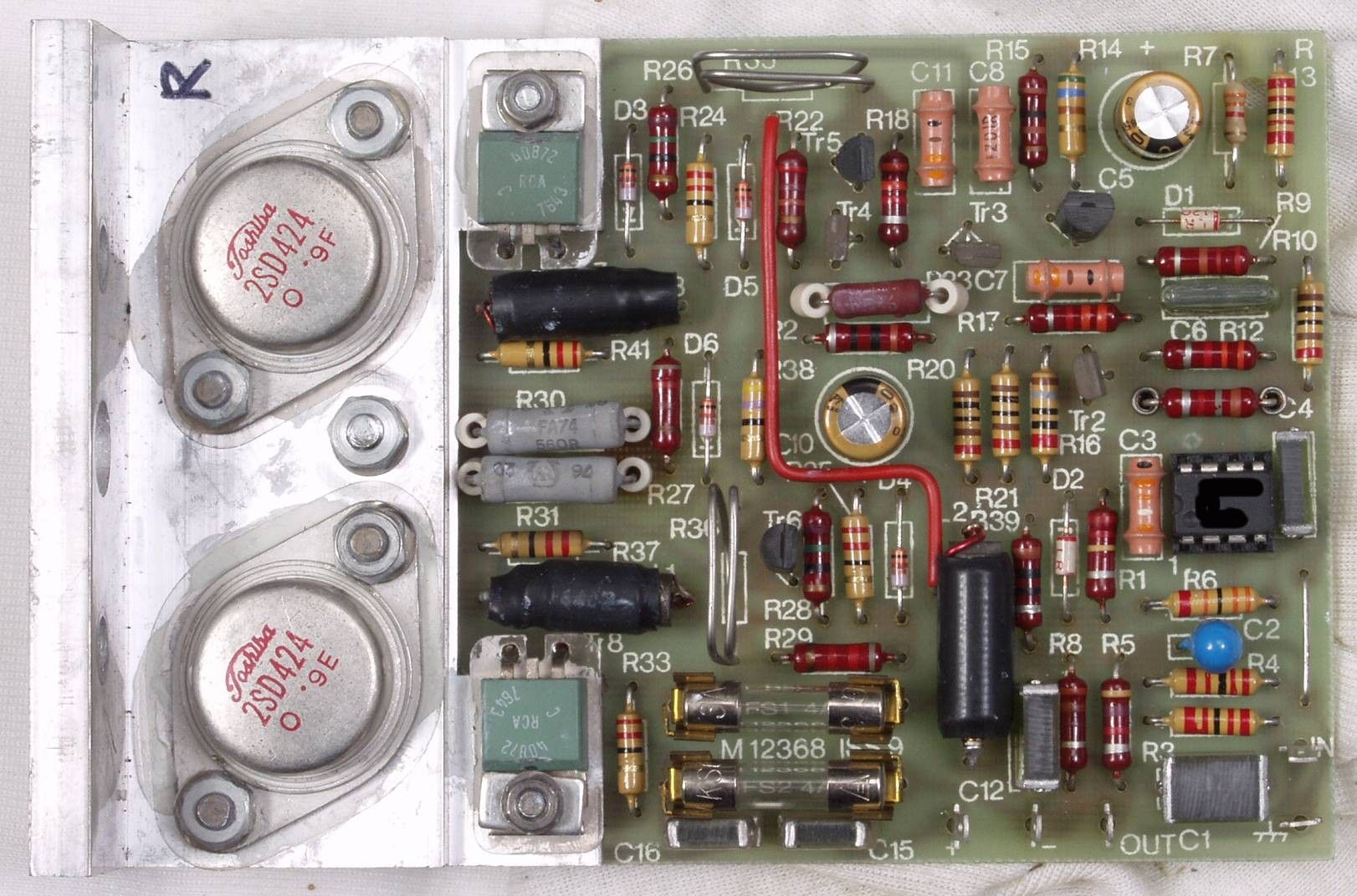 | C1A2. 修理前 R側AMP基板のヒビの入った電解コンデンサー | ||||||||||||||||||||||||||||||||||