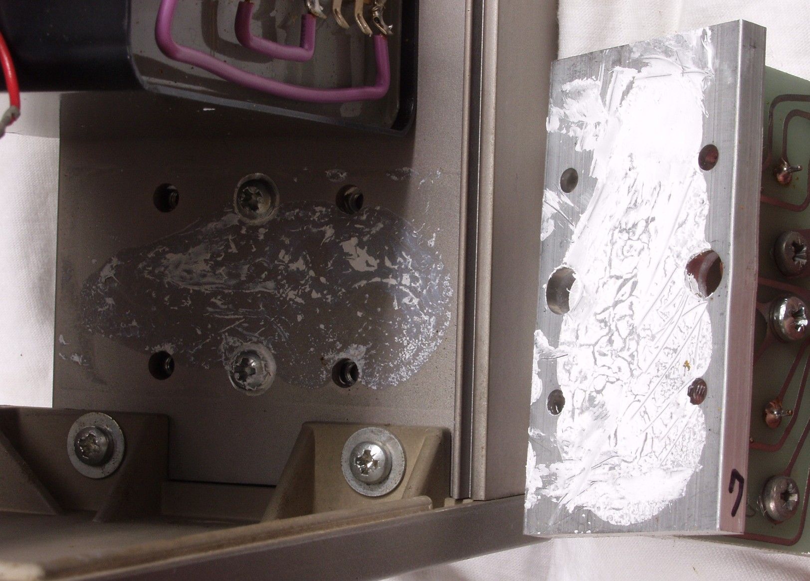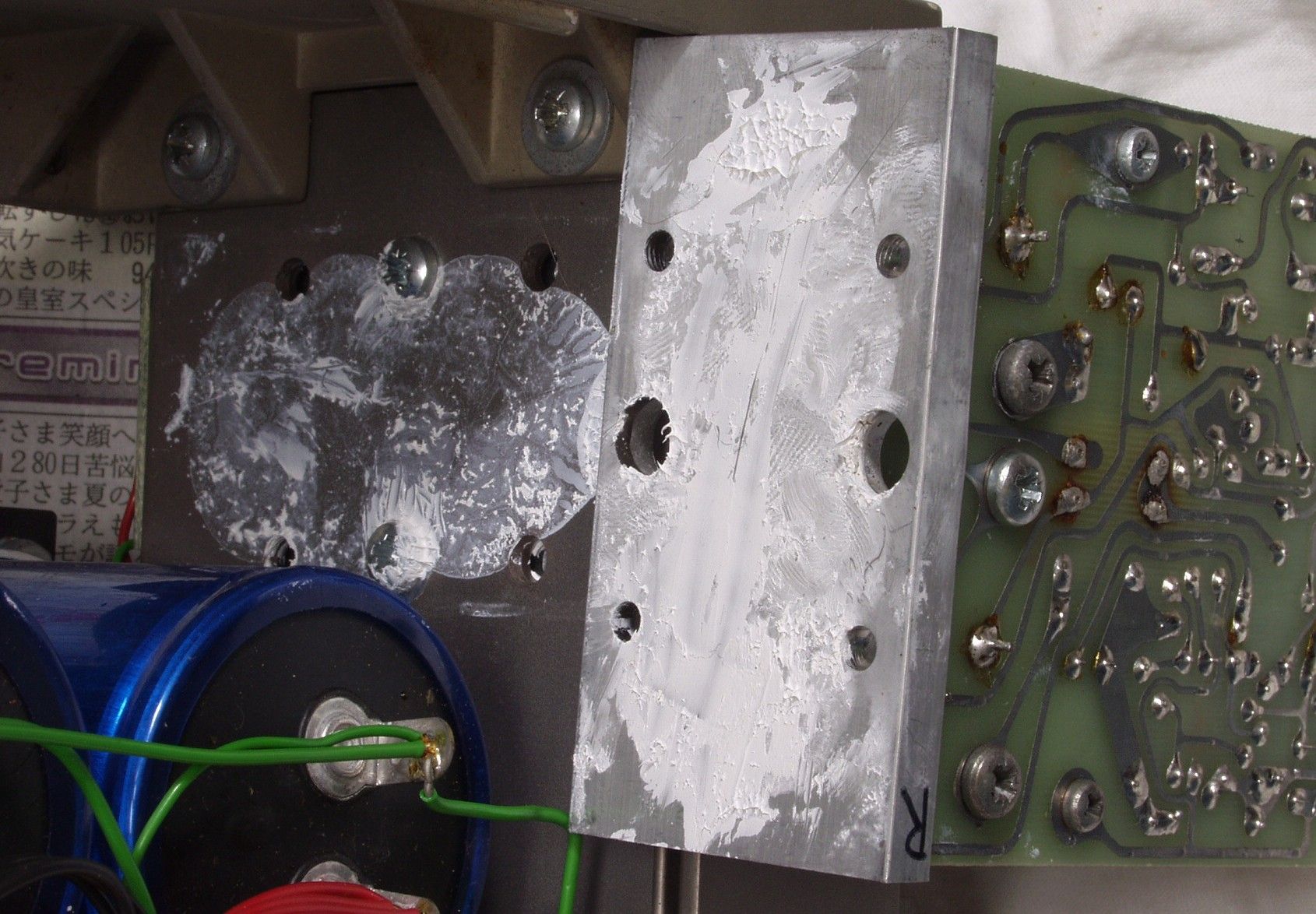 | A6. 修理中 R−AMP放熱器のTR(トランジスタ−)取り付け部 もう少しシリコングリスが欲しい | ||||||||||||||||||||||||||||||||||