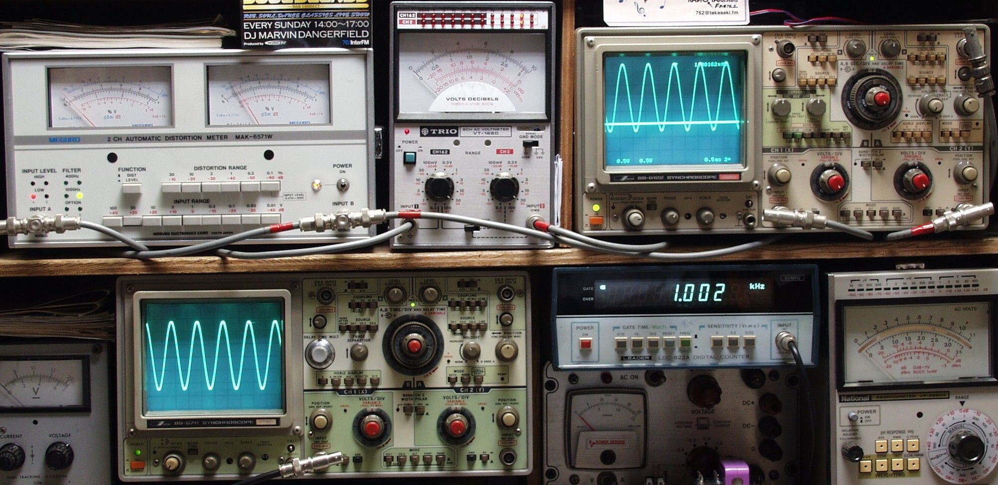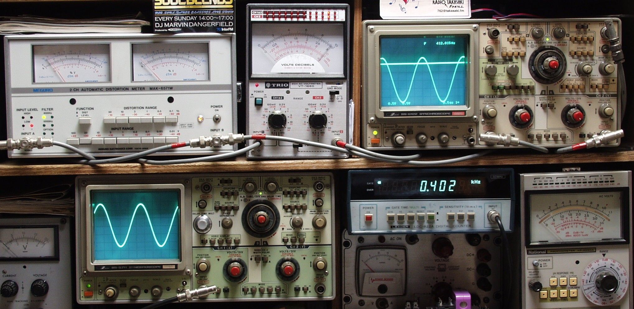 | E. 調整・測定 E1. 出力、歪み調整・測定 電源電圧は100Vにて測定 <見方> 下左のオーディオ発振器より400HZ & 1KHZの信号を出す(歪み率=約0.003%) 下中の測定器−−入力波形(オーディオ発振器のTTLレベル) 下右の測定器−−周波数計 上左の測定器−−SP出力の歪み率測定。 左メータ=Left出力。 右メータ=Right出力 上中の測定器−−SP出力電圧測定器。 赤針=Right出力。 黒針=Left出力 上右の測定器−−SP出力波形オシロ。 上=Right出力。 下=Left出力(出力電圧測定器の出力) |
