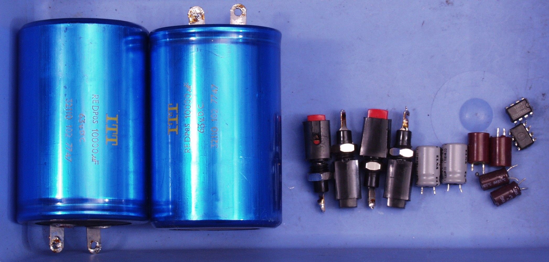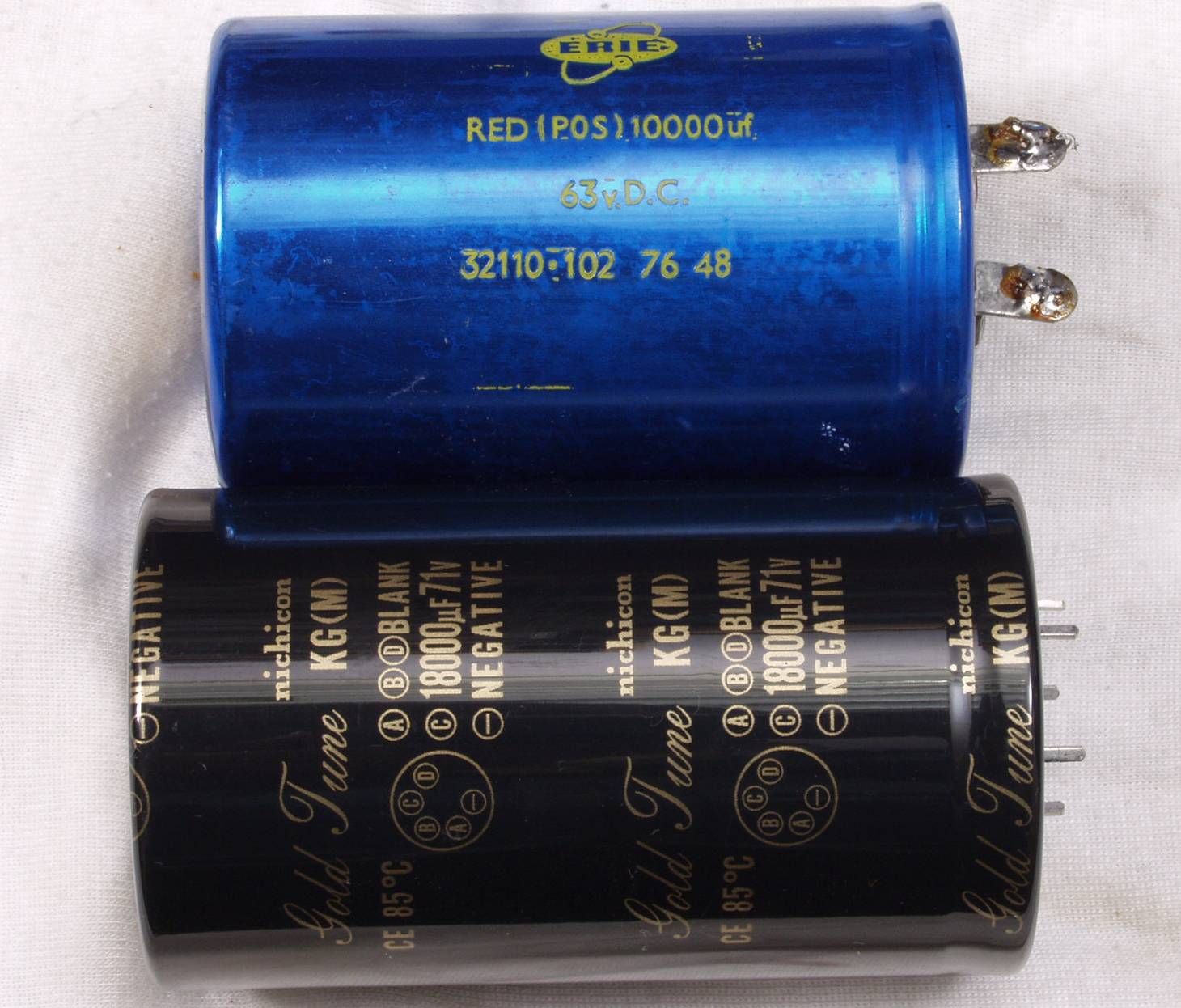| A4. 点検中 電解コンデンサー比較 古いのは63V/10000μ 使用するのは71V/18000μ | ||||||||||||||||||||||||||||||||||