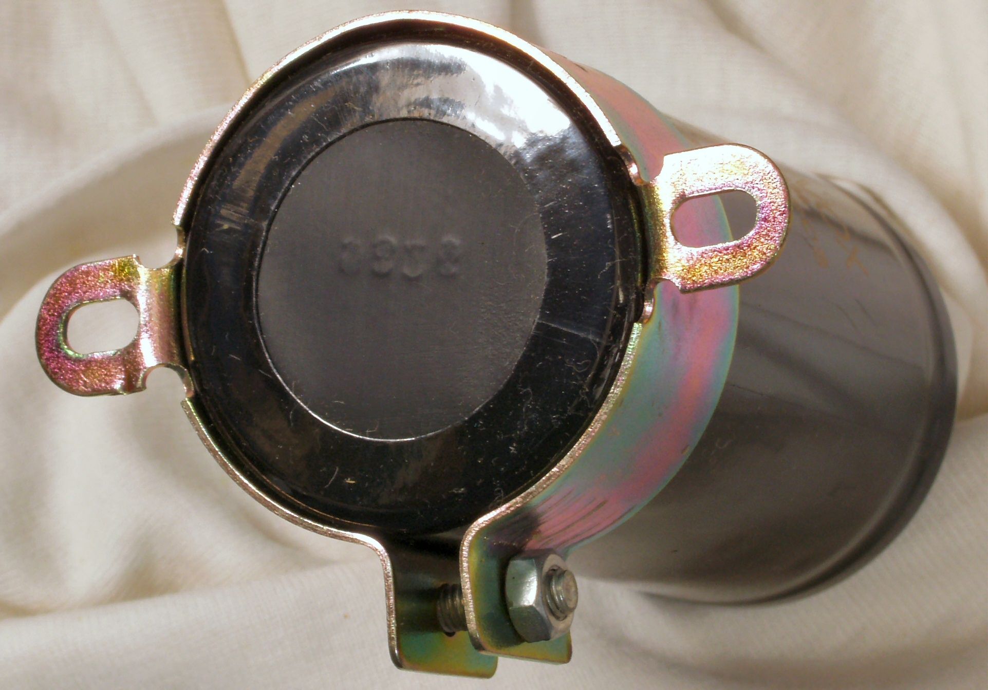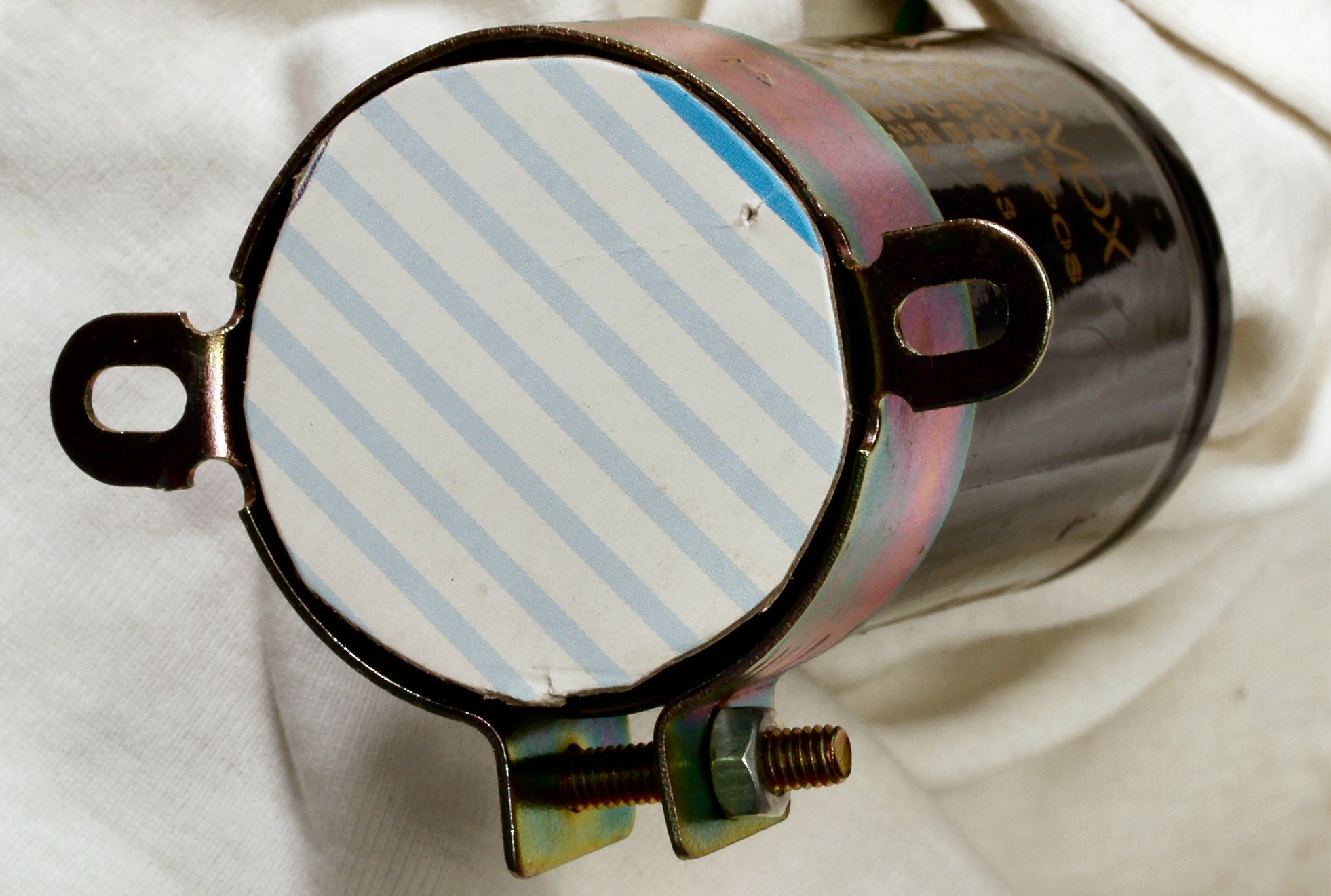 C63. 修理中 マイナス側の電解コンデンサー、下から見る。