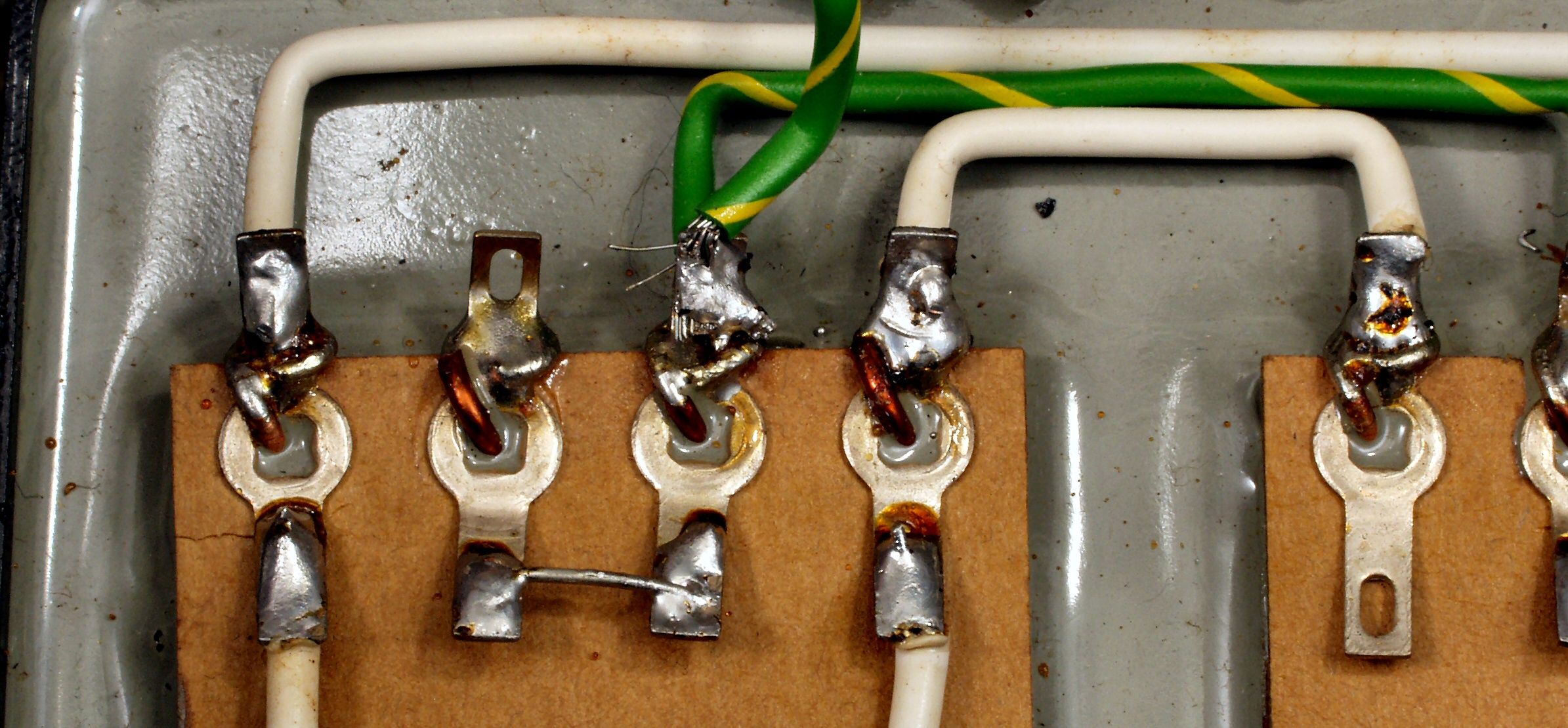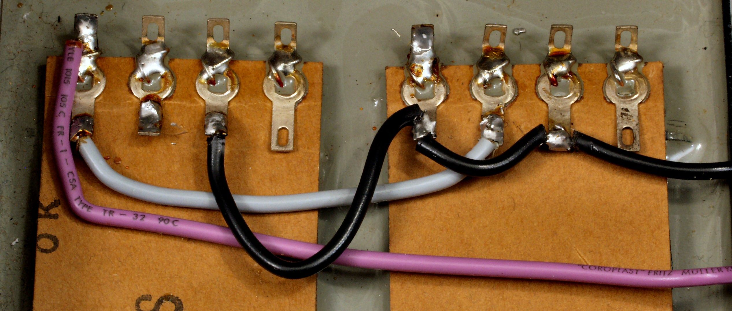 A33. 点検中 電源トランス1次側配線。 100Vに改造したのだが!! トランスが焼けなくて、不幸中の幸い。