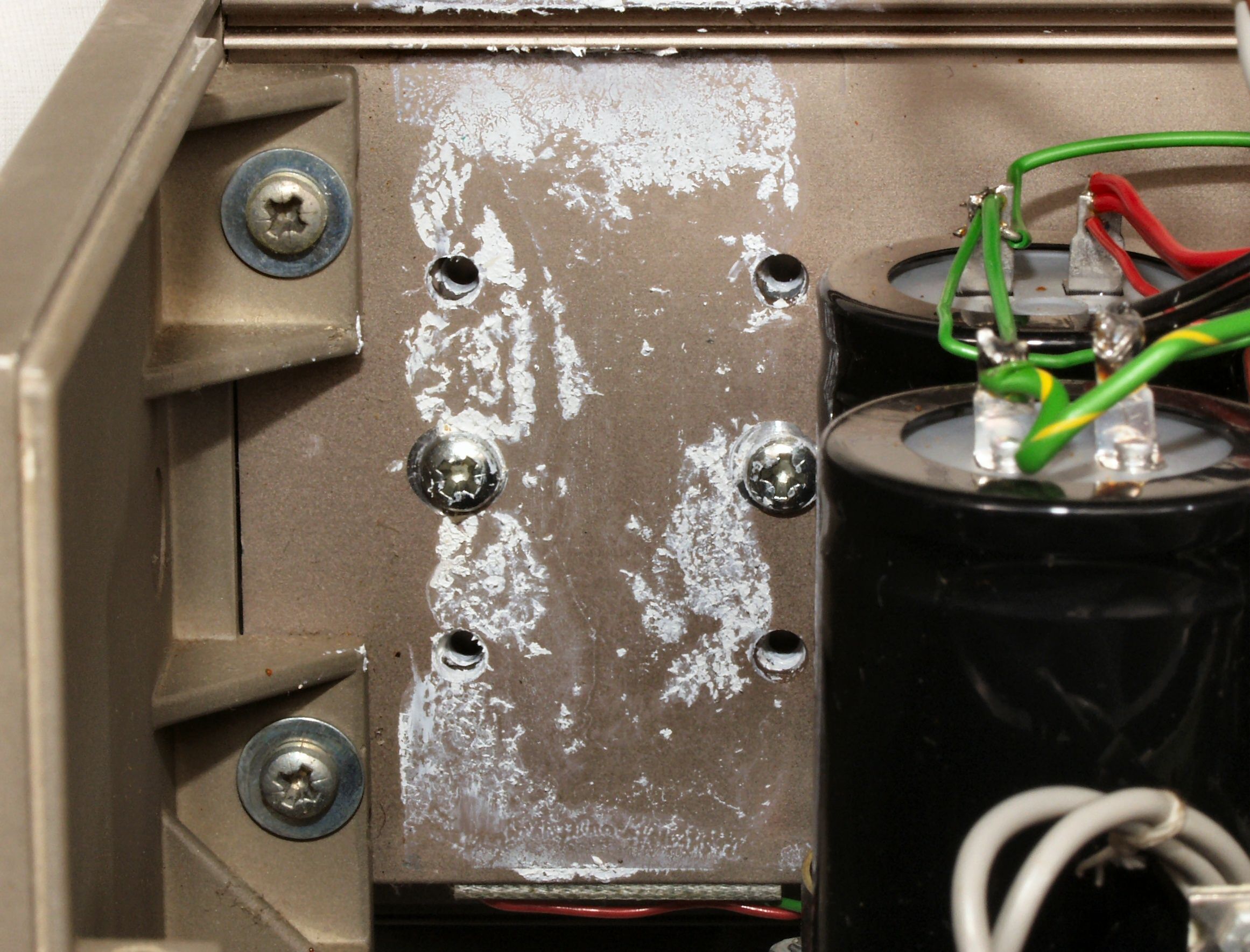 A24. 点検中 上下ケースを取り、下から見る。 このトランス止めネジが下蓋を押した。