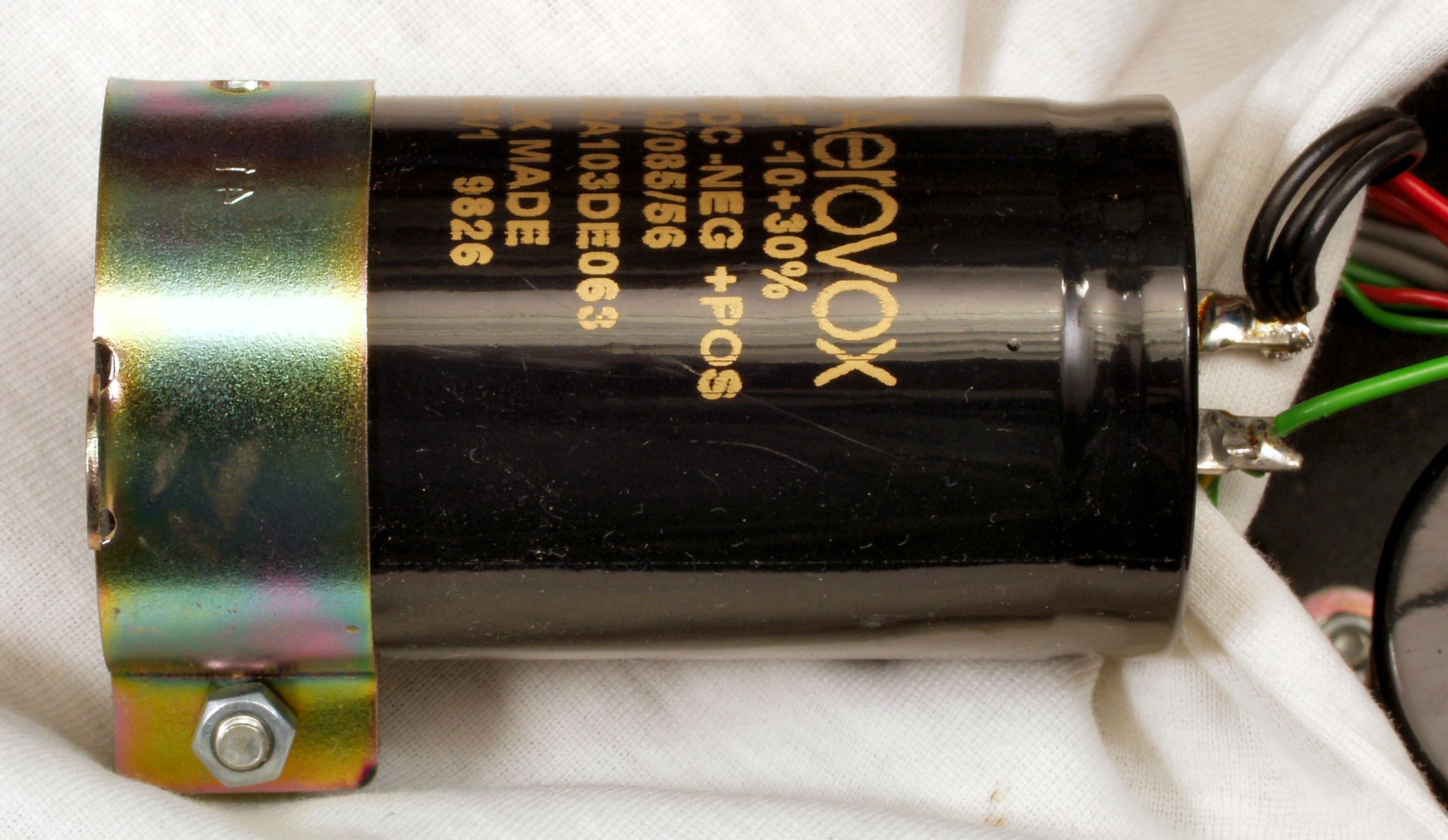 C62. 修理後 マイナス側の電解コンデンサー、横から見る。