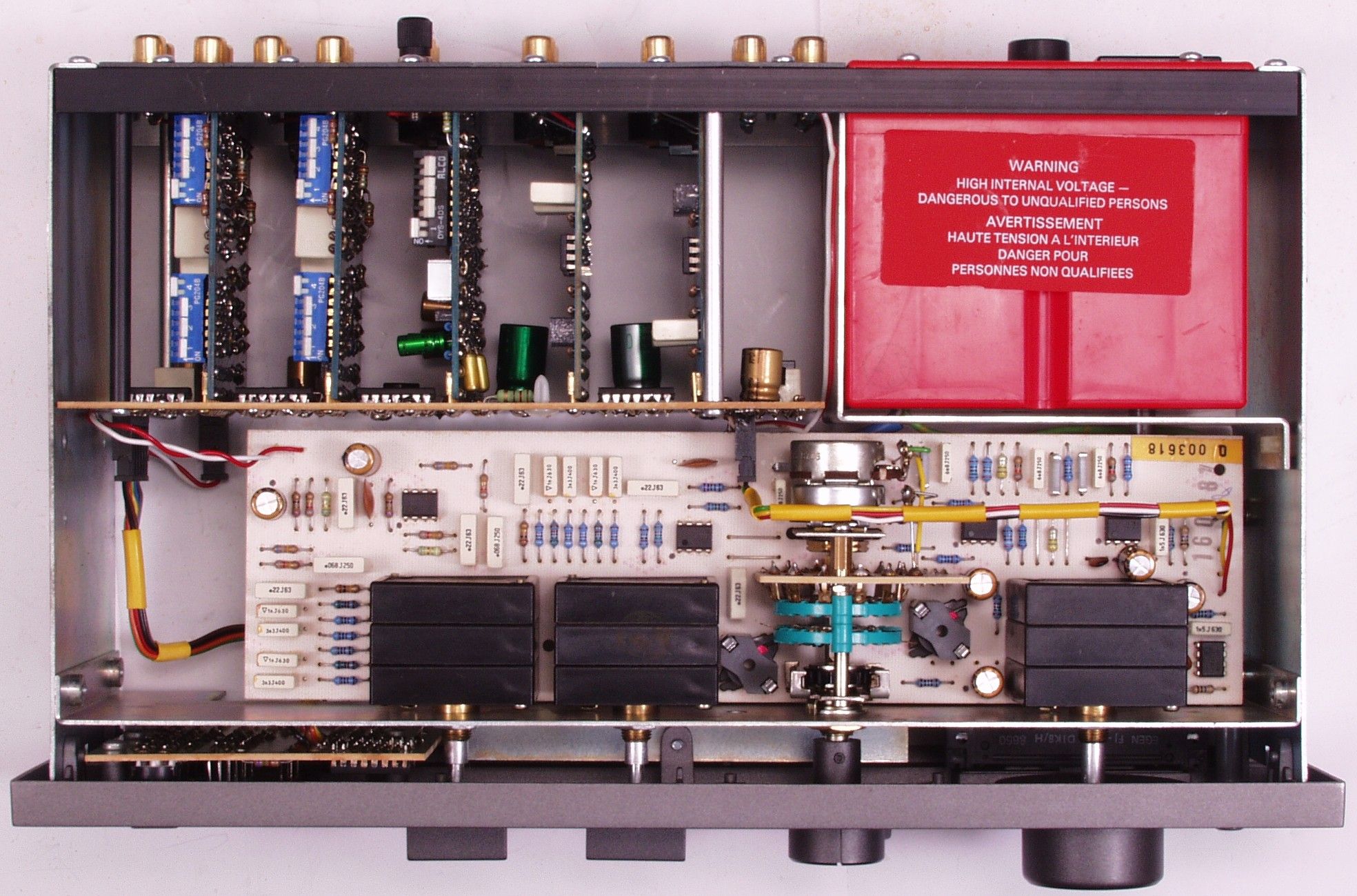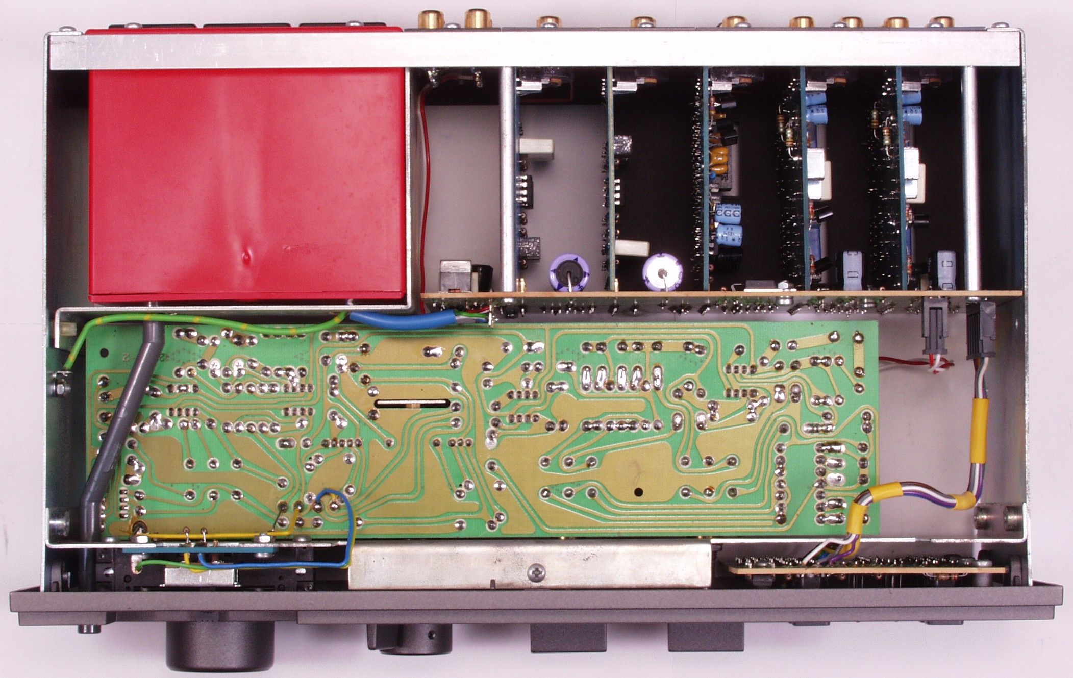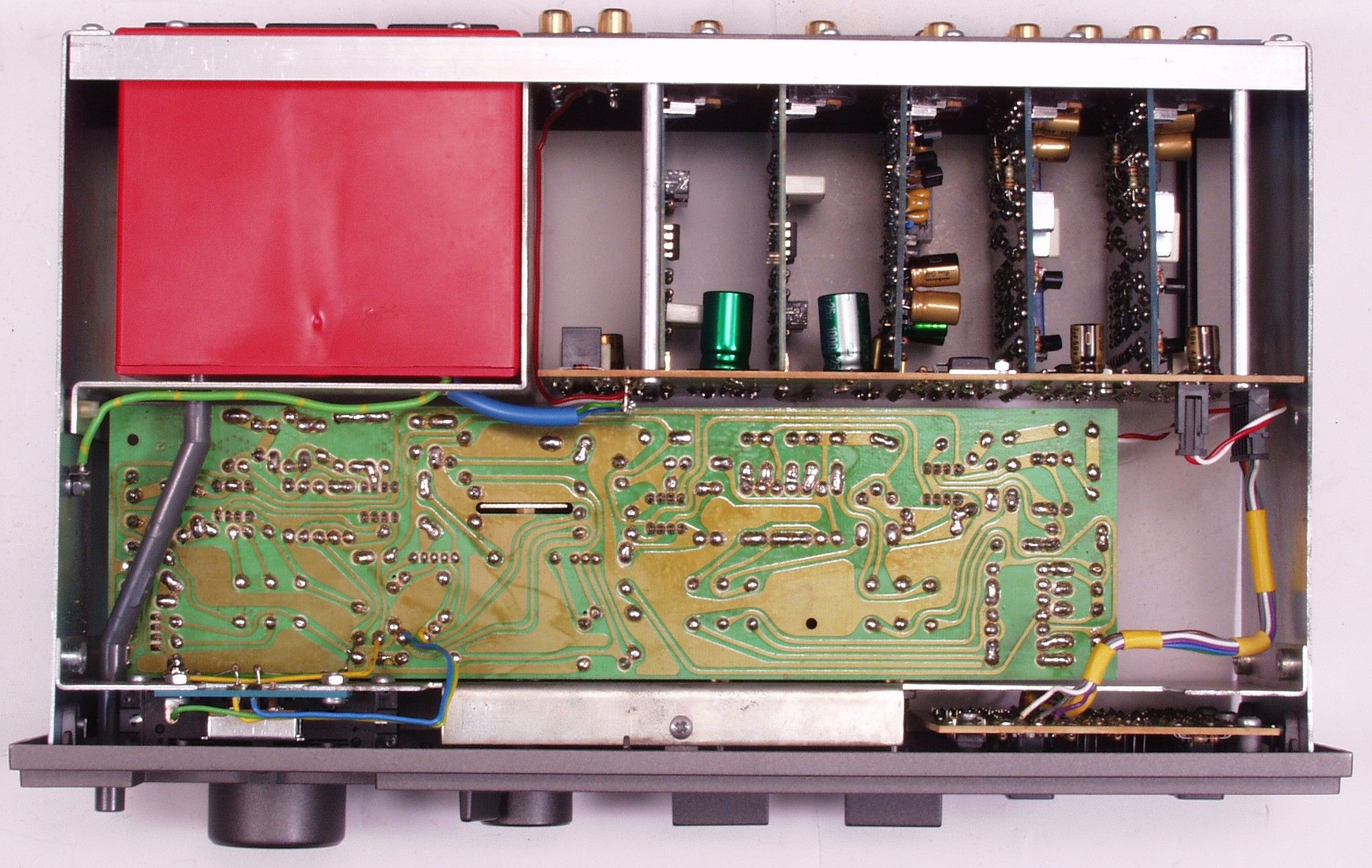 | C. 修理状況 C1A. 修理前 TAPE1入力基板 下のデイップSWはPlayとRecordのレベル調整 |