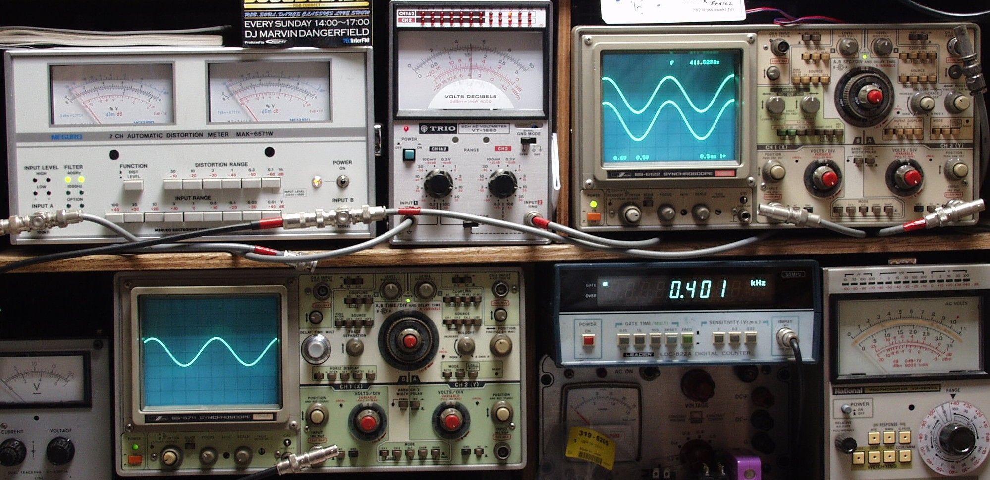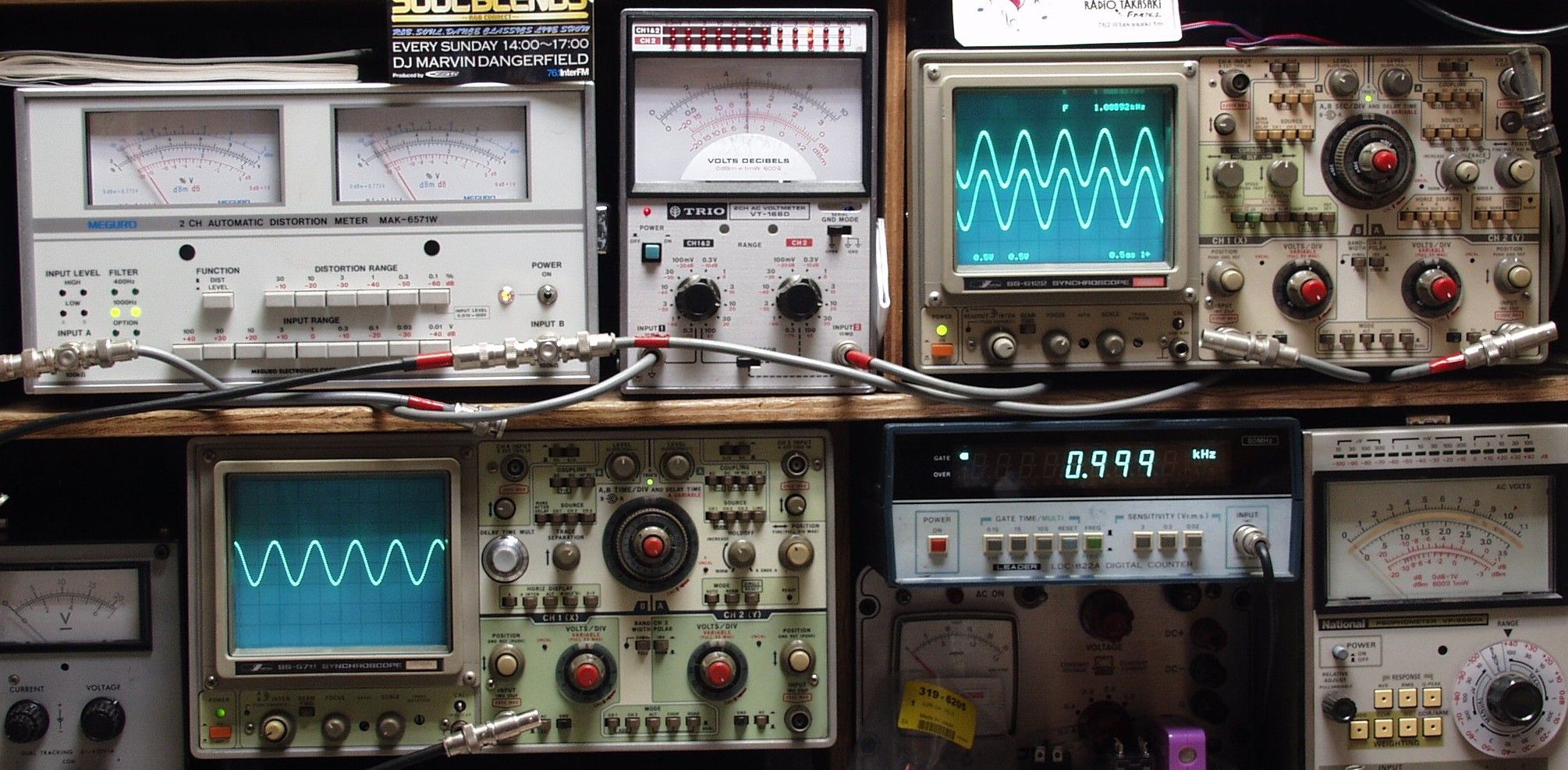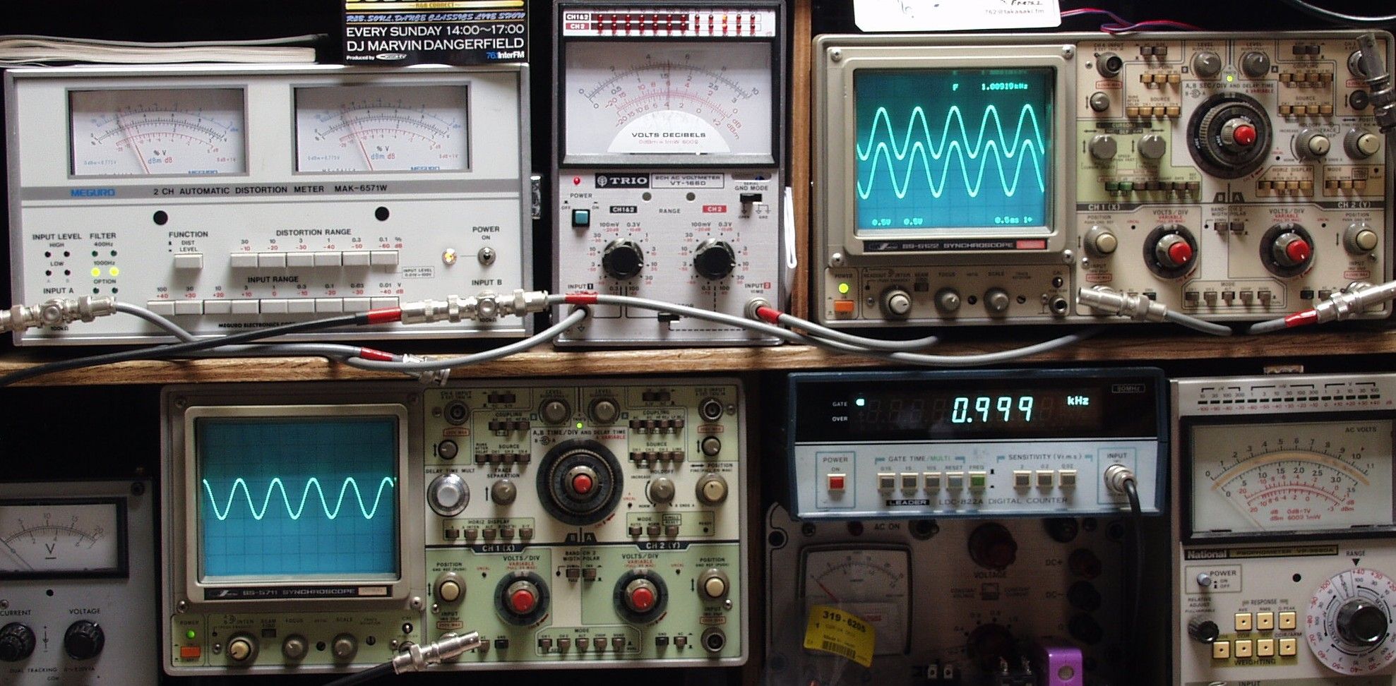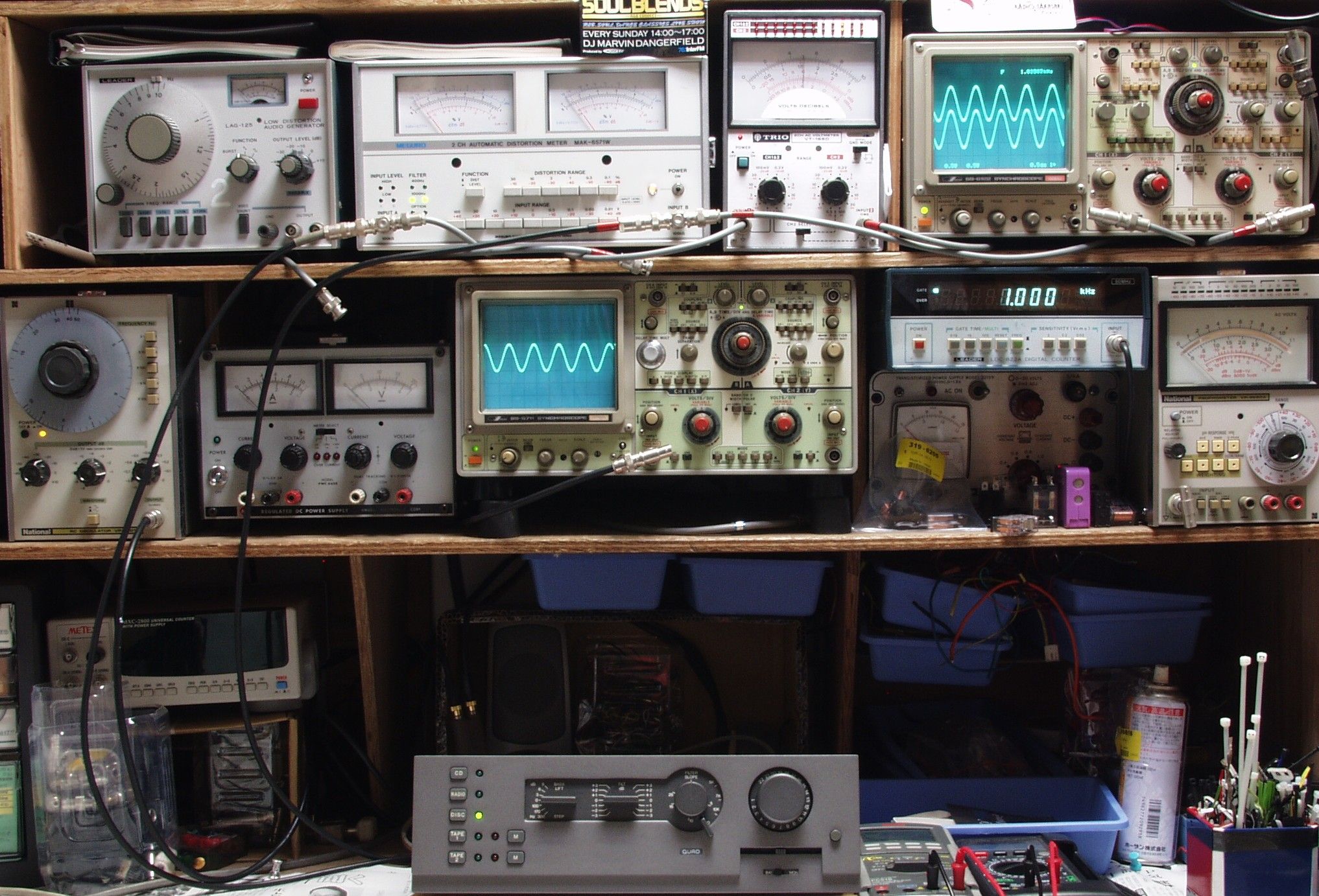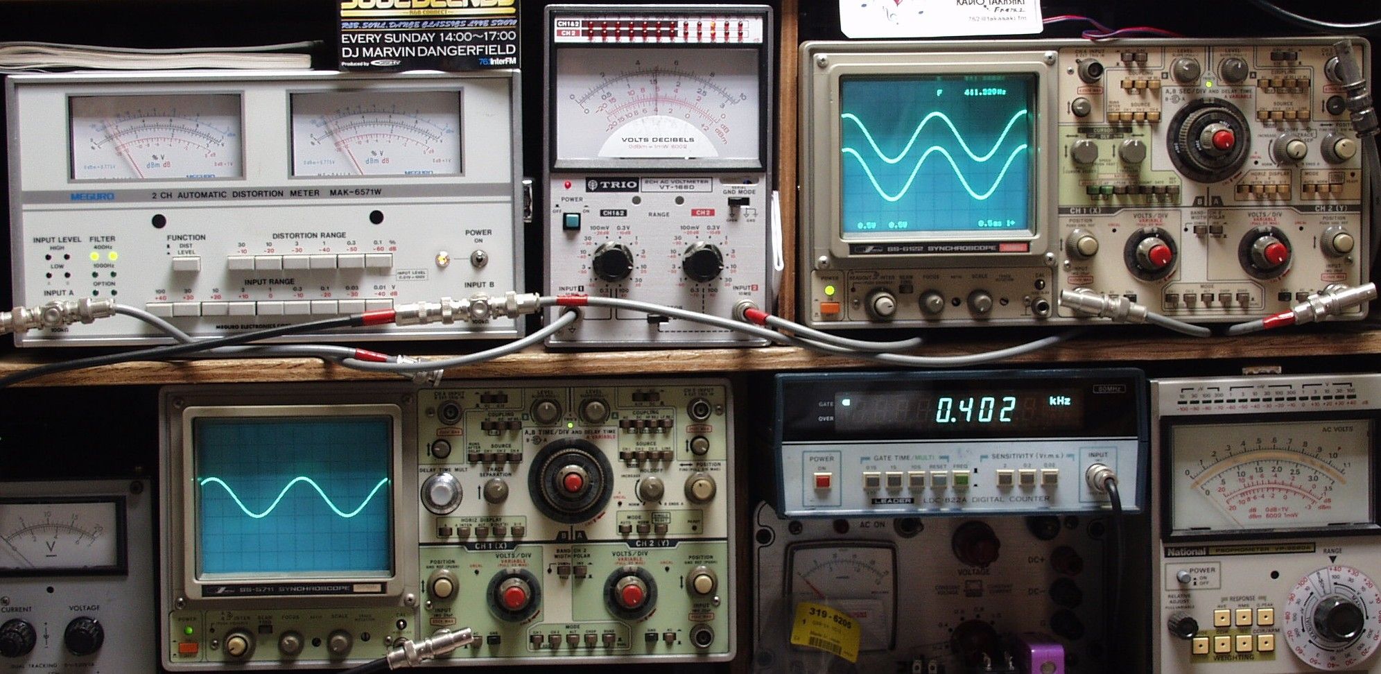 | E. 調整・測定 E1. 出力、歪み調整・測定 <見方> 下左オーディオ発振器より400HZ・1KHZの信号を出す(歪み率=約0.003%) 下中測定器−−入力波形(オーディオ発振器のTTLレベル) 下右測定器−−周波数計 上左測定器−−SP出力の歪み率測定。 左メータ=L出力。 右メータ=R出力 上中測定器−−SP出力電圧測定器。 赤針=R出力。 黒針=L出力 上右測定器−−SP出力波形オシロ。 上=R出力。 下=L出力(出力電圧測定器の出力) |