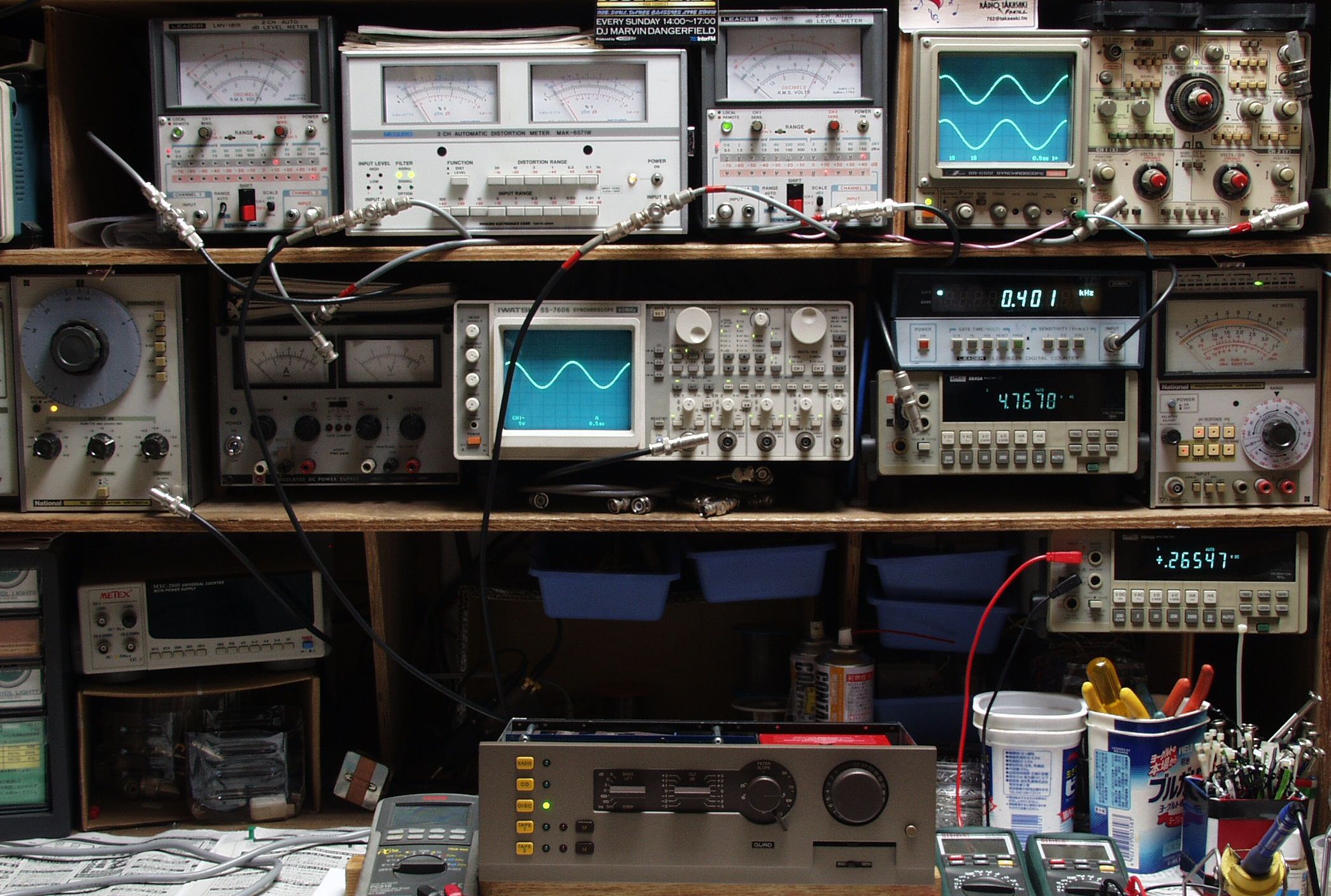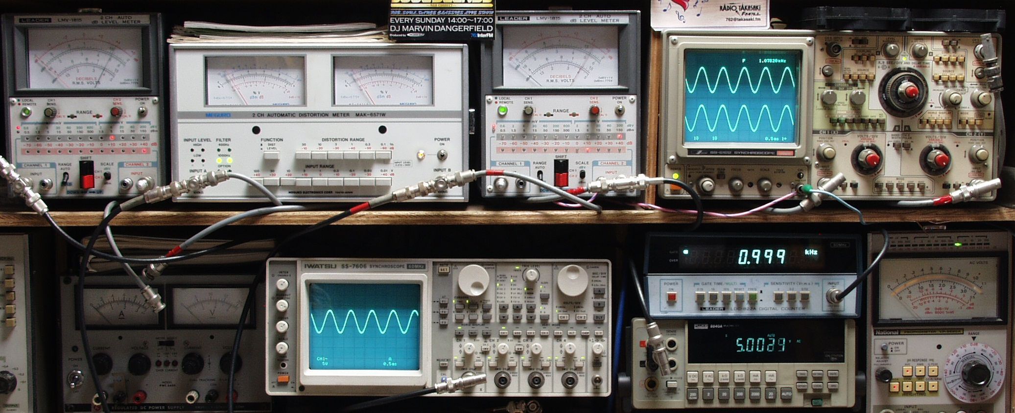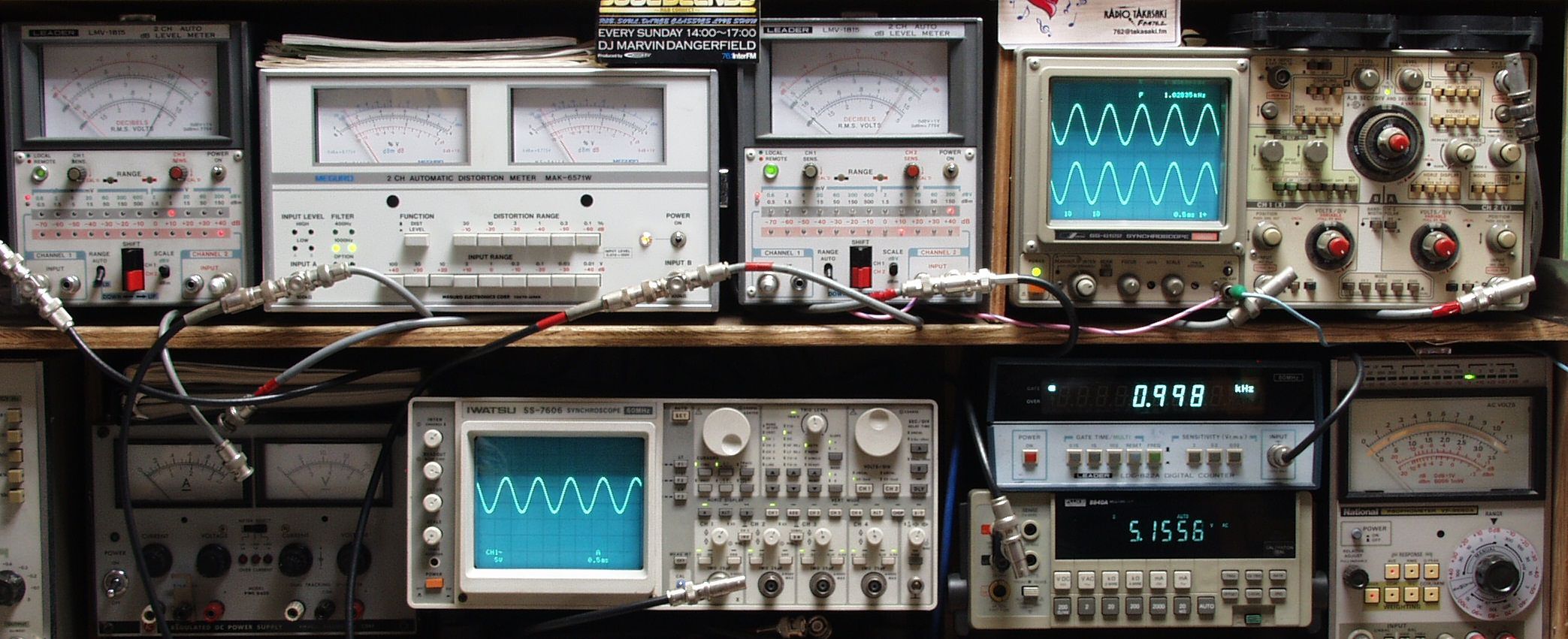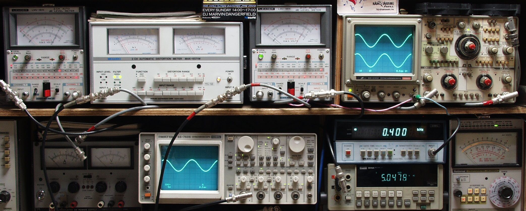 下左オーディオ発振器より400HZ・1KHZの信号を出し(歪み率=約0.003%)これをAMPに入力し、SPからの出力を測定   下中オシロ=入力波形(オーディオ発振器のTTLレベル)