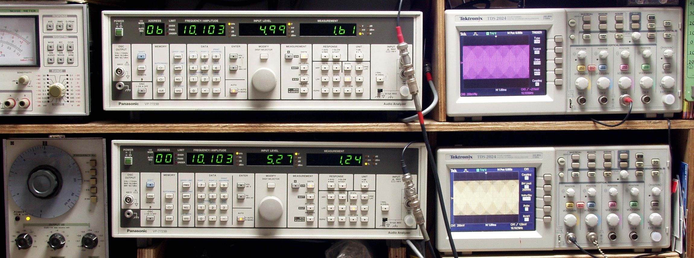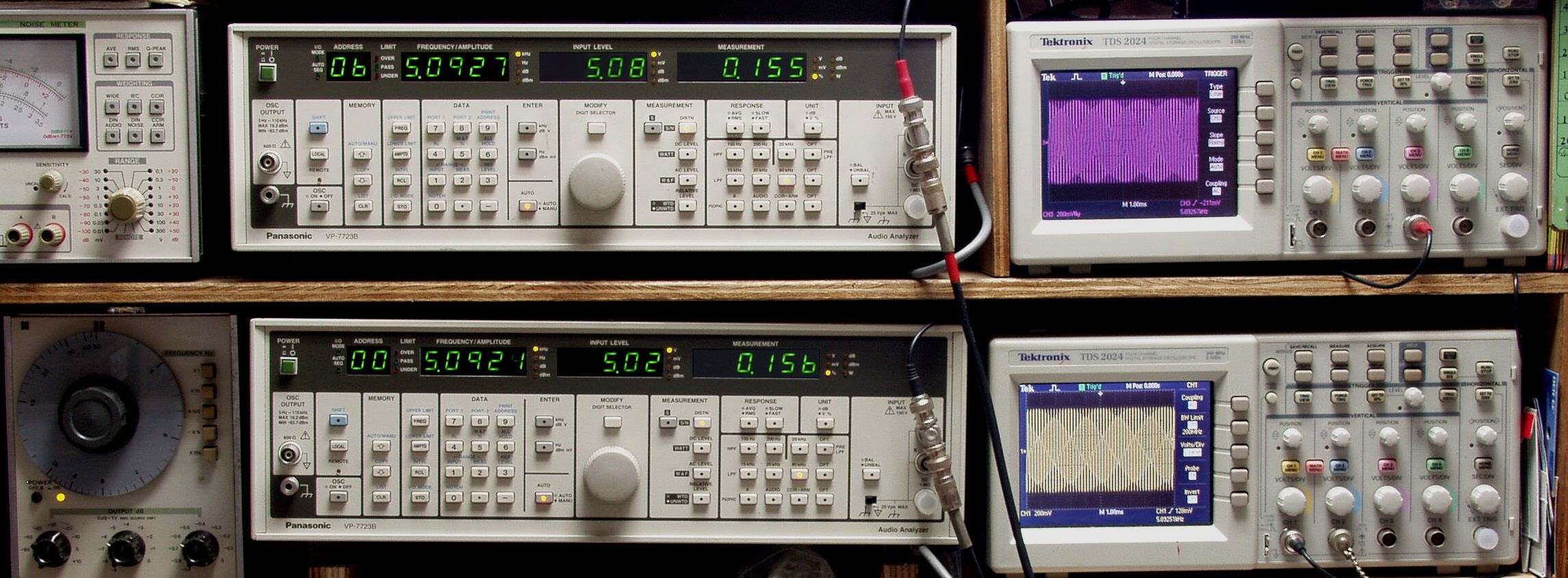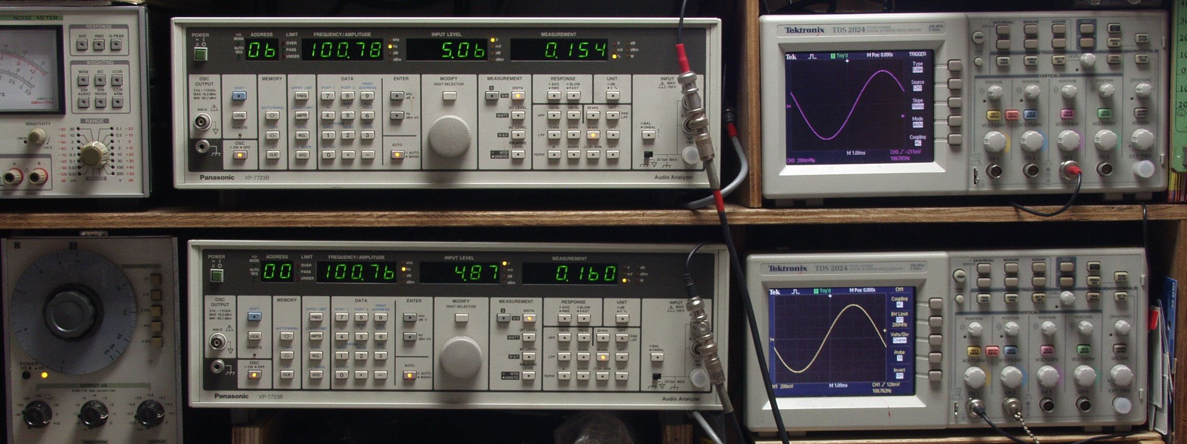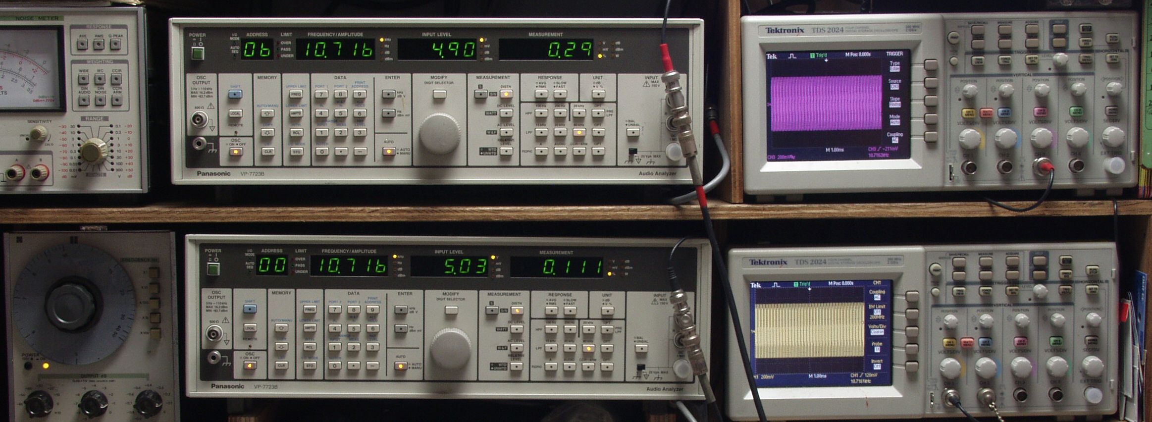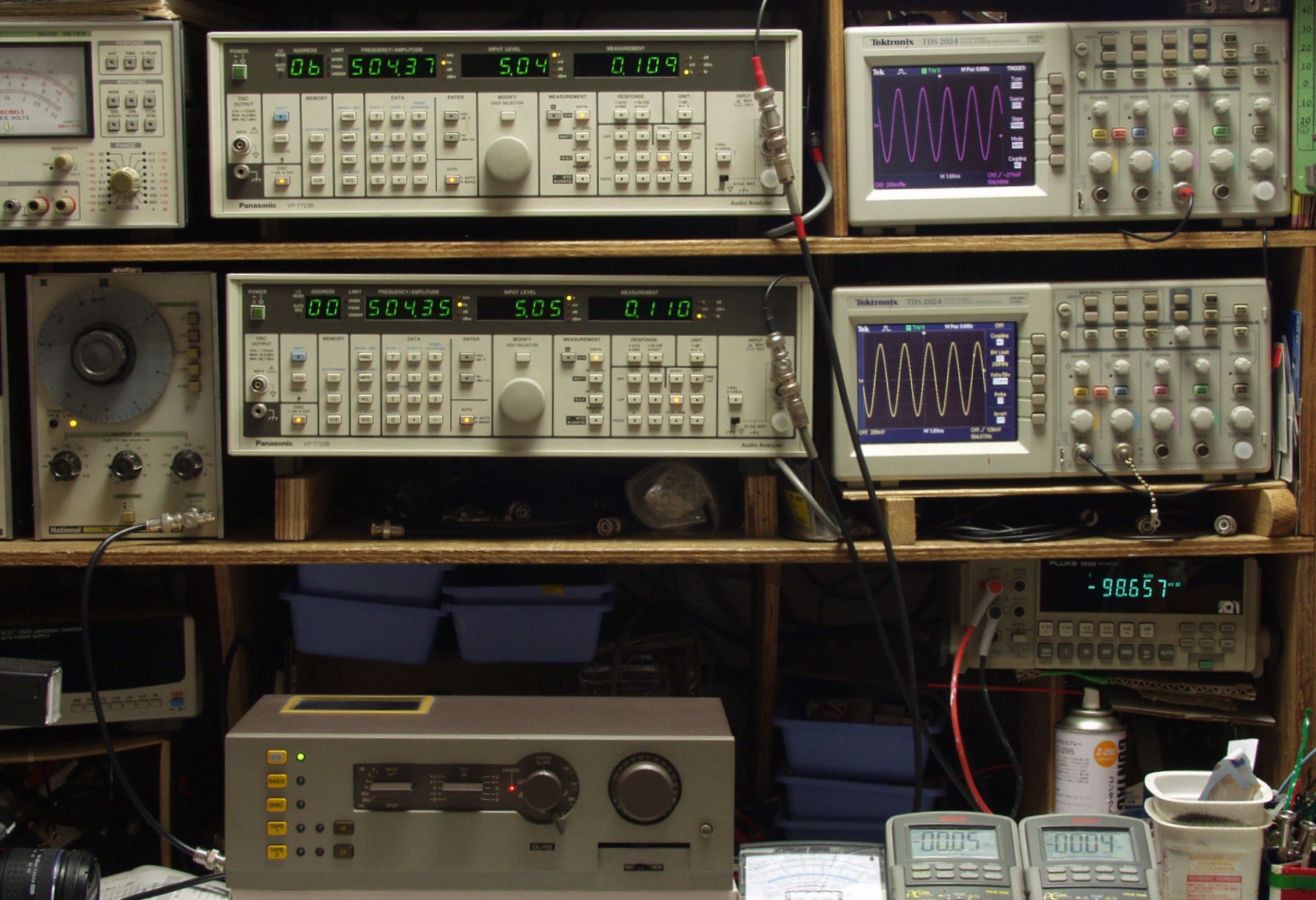 上段中央オーディオアナライザ VP−7723B=R側測定。LED表示は右から、「歪み率」、「SP出力電圧」、「周波数」。