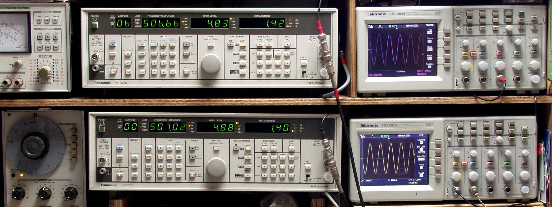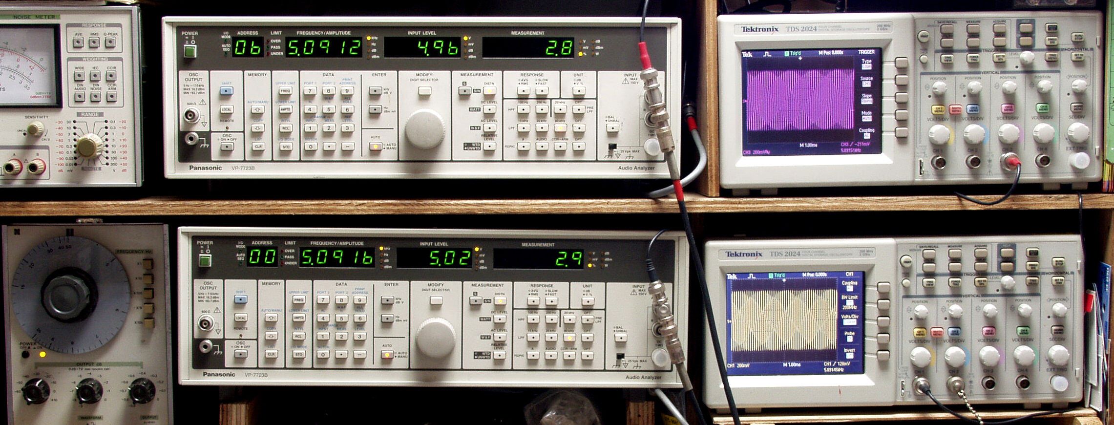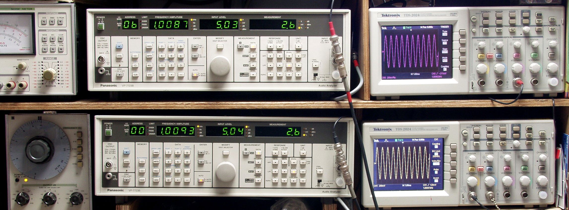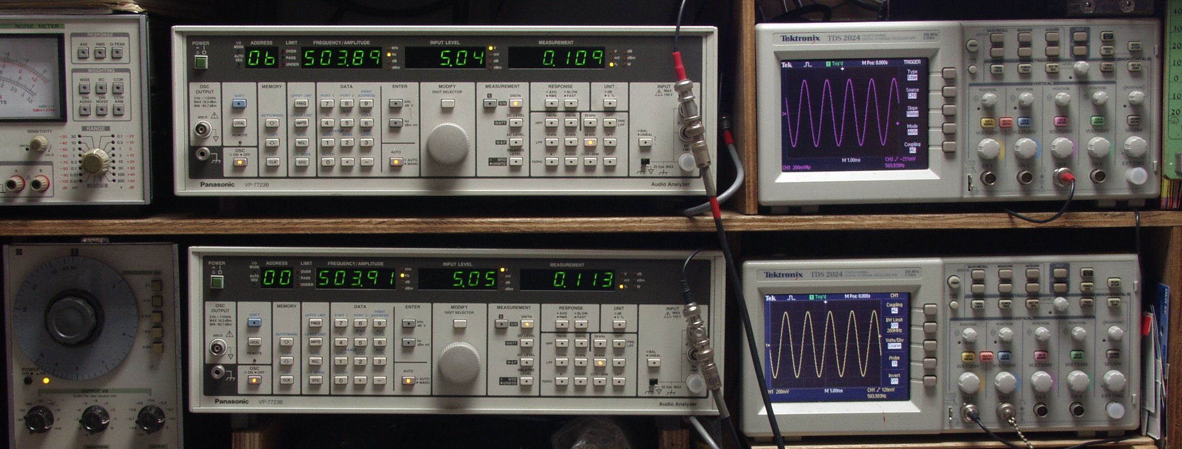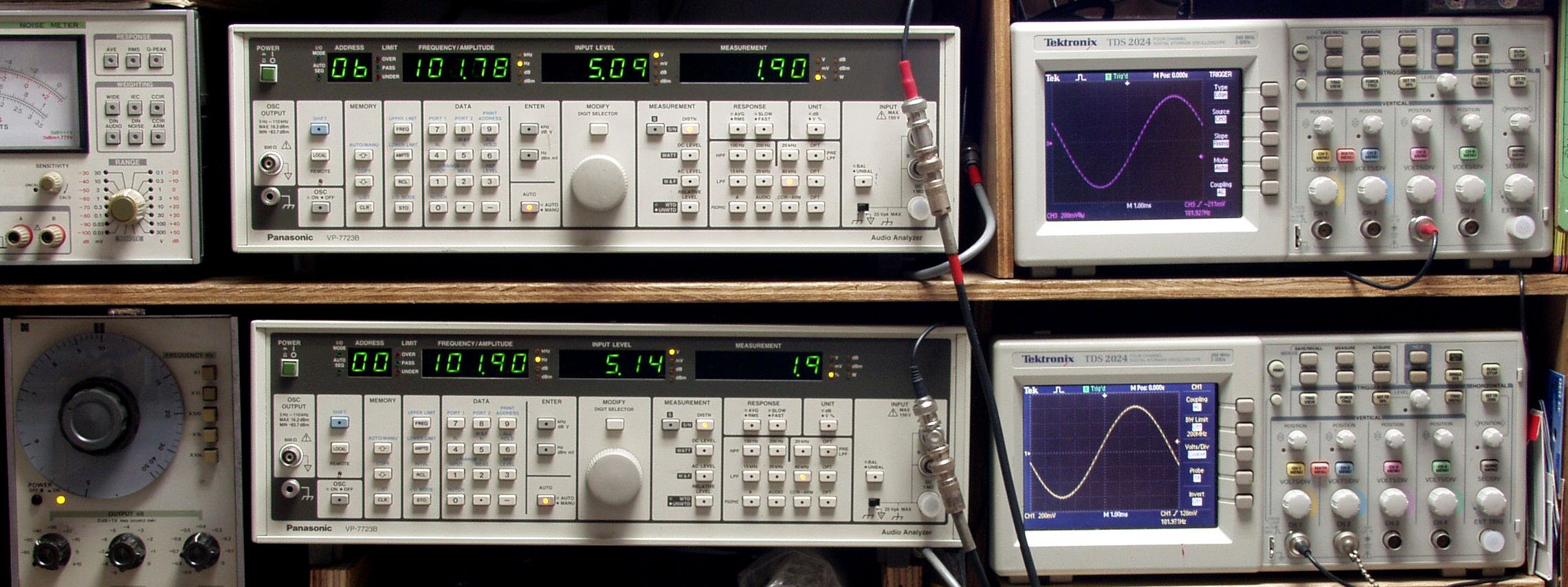 上段中央オーディオアナライザ VP−7723B=R側測定。LED表示は右から、「歪み率」、「SP出力電圧」、「周波数」。