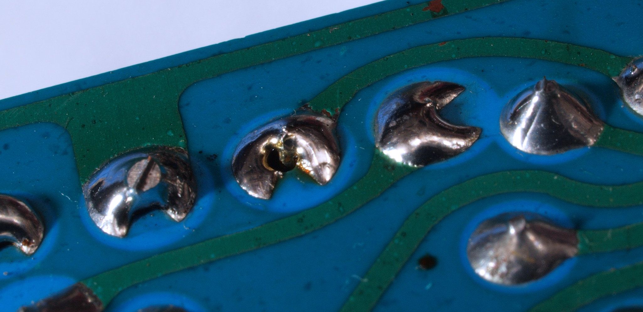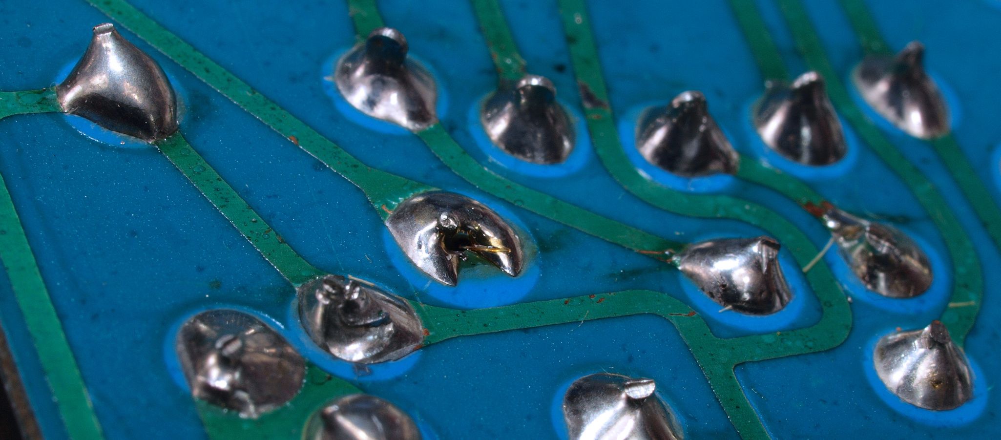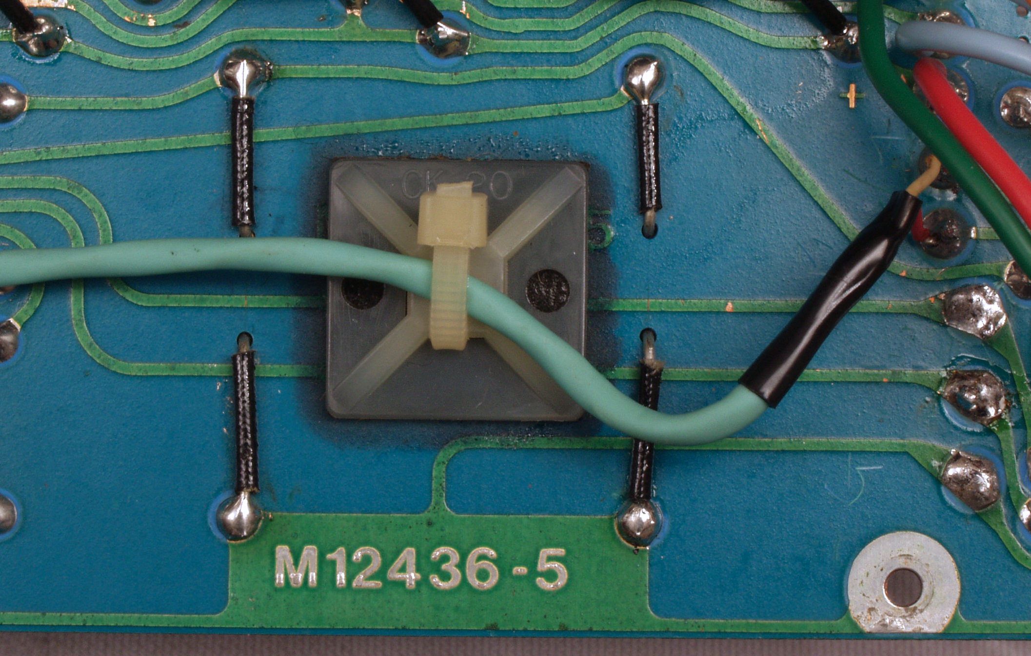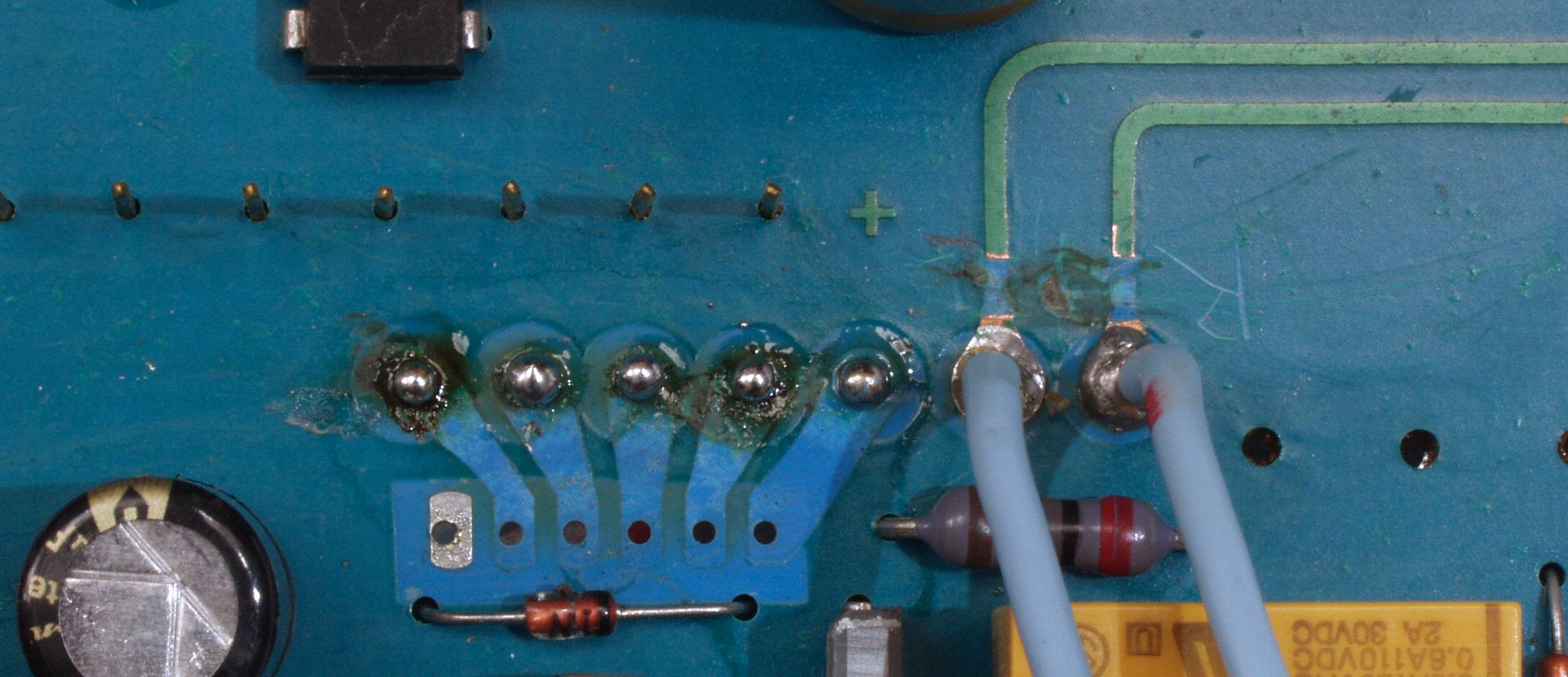 A41. 点検中 メイン基板裏に取り付けられた配線固定、接着材で銅箔腐食が始まっている。