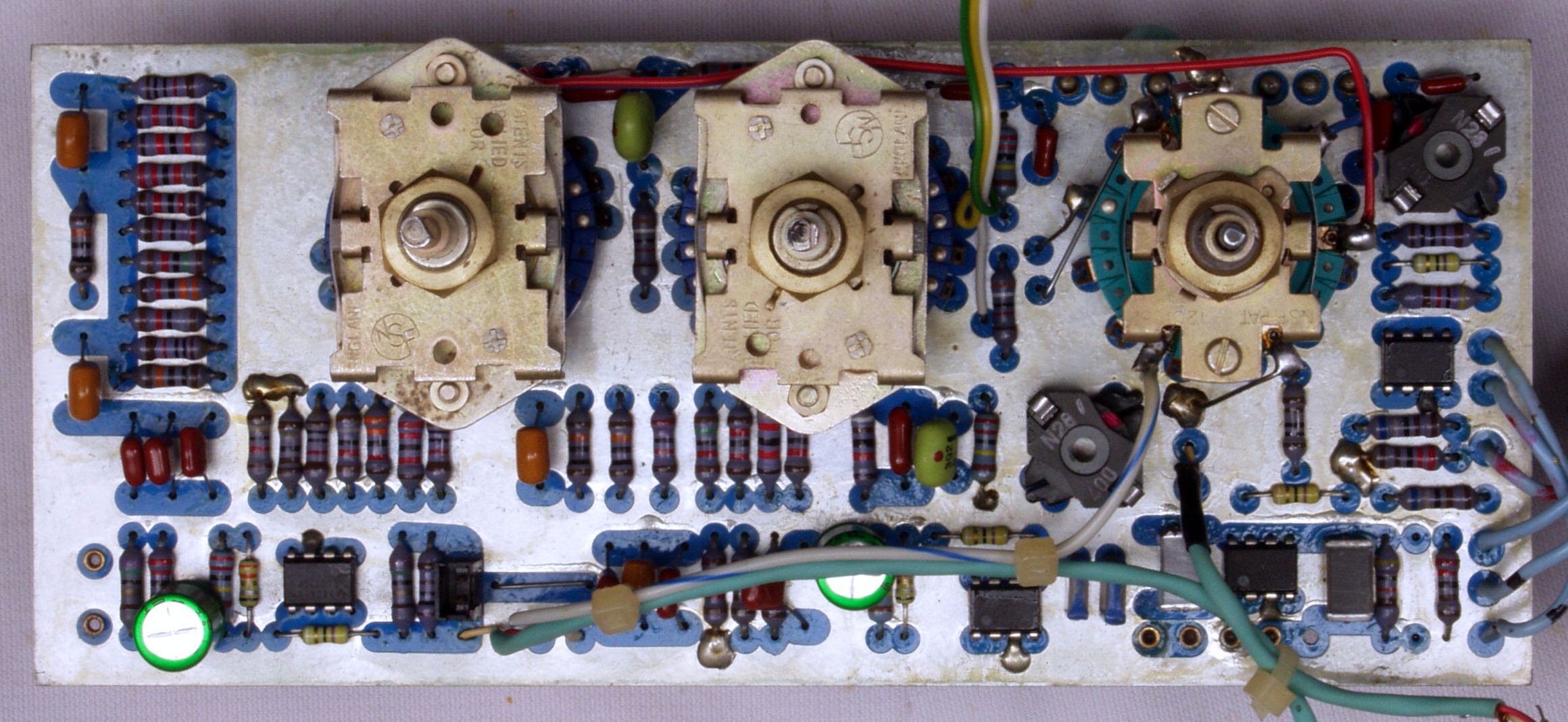 歪みが多いので修理する、コンデンサー6個、OP−AMP2個、TR(トランジスター)4個交換。。