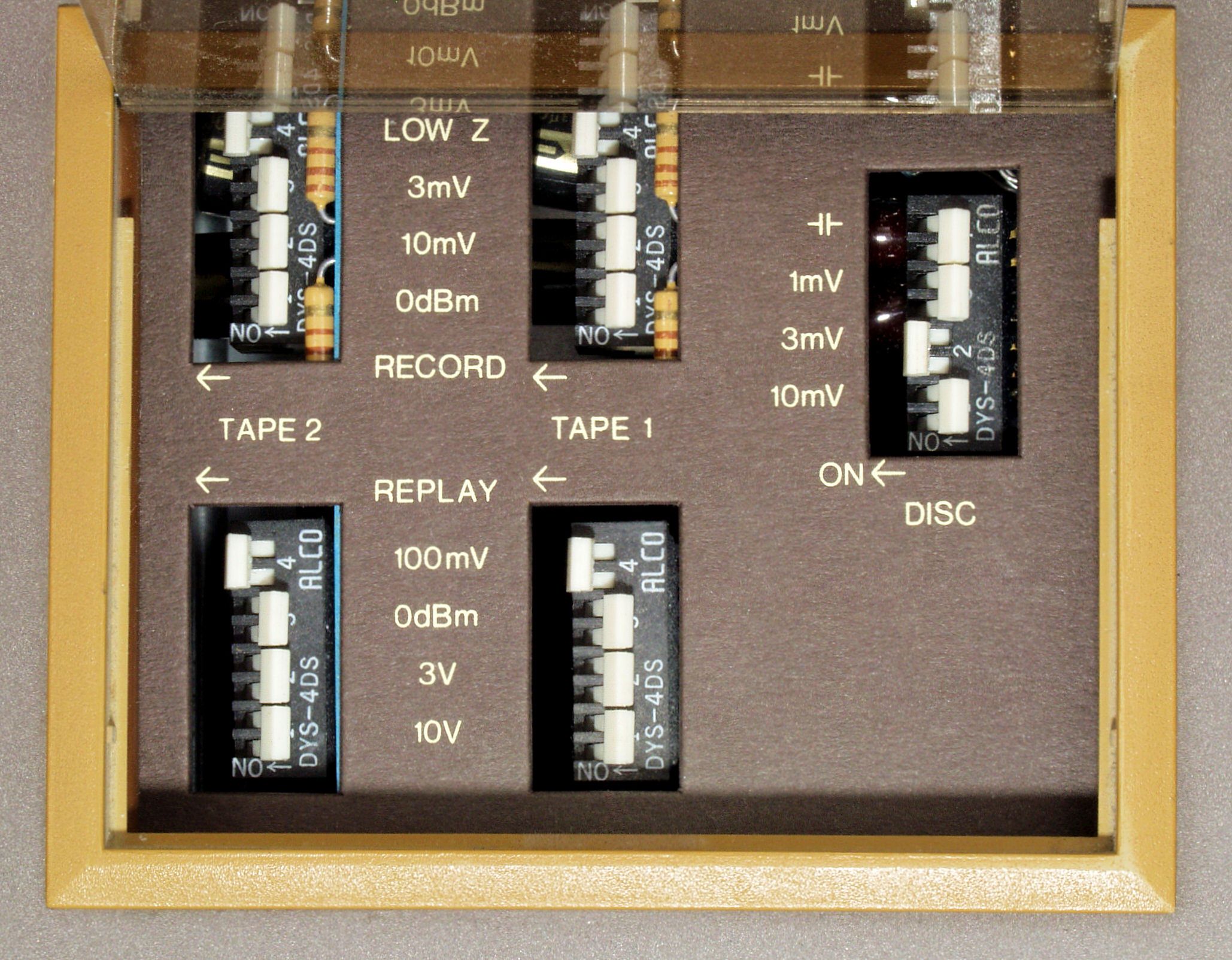 C11. 修理前 TAPE1入力基板 上のデイップSWはPlayとRecordのレベル調整