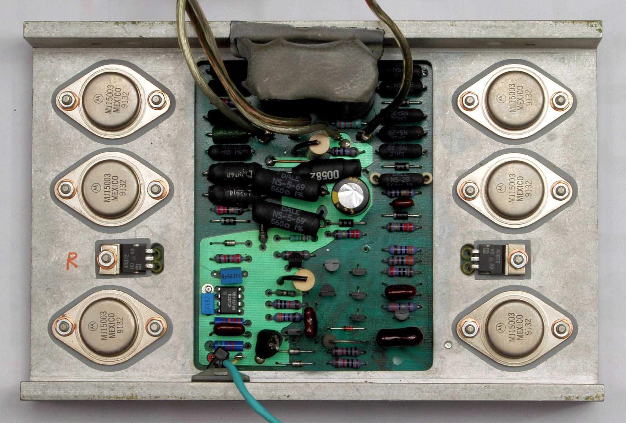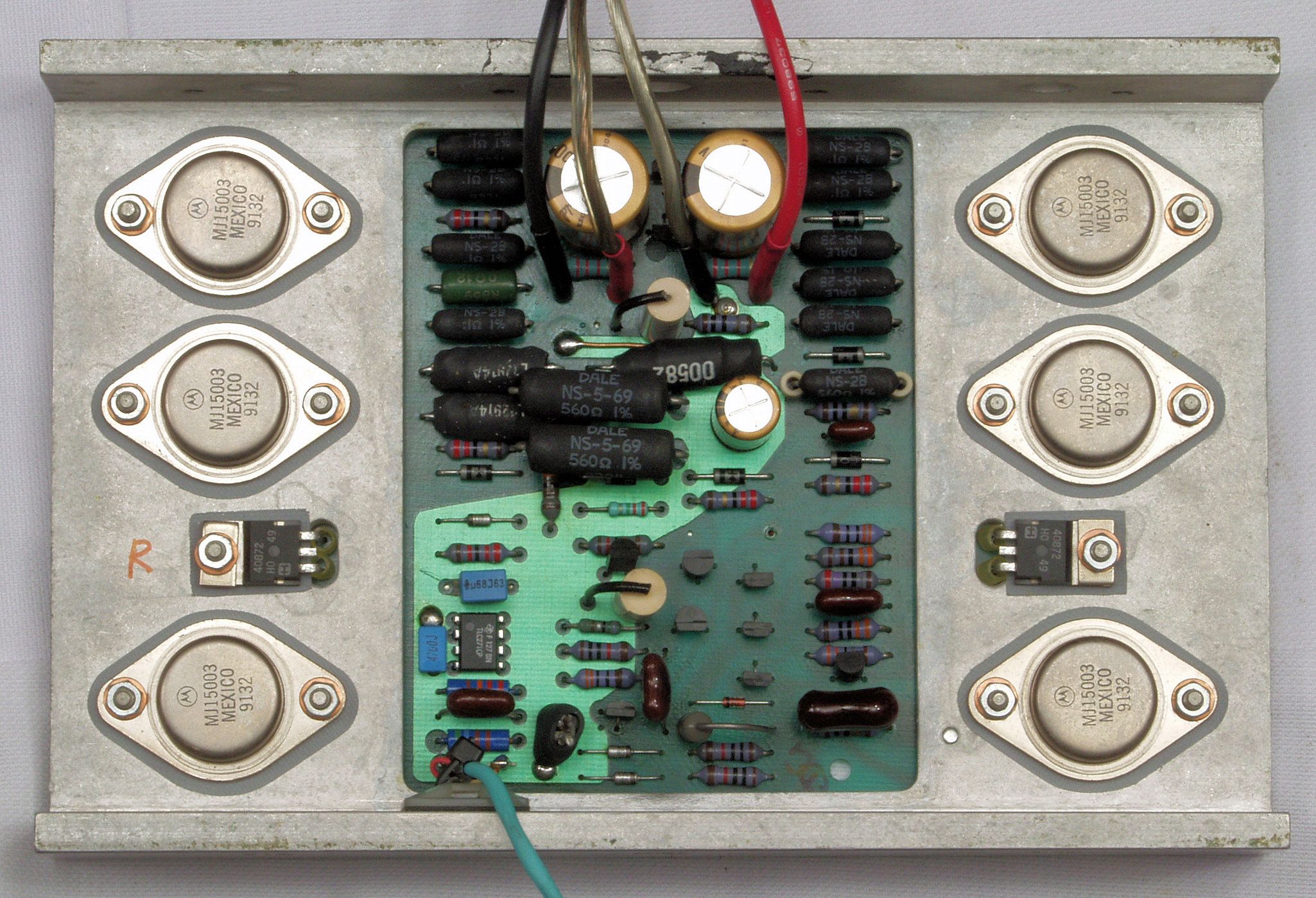 | C112. 修理前 R側AMP基板引きだし配線、エミッター抵抗も交換されている。電源・SP出力端子は引出し線を半田付け。 | ||||||||||||||||||||||||||||