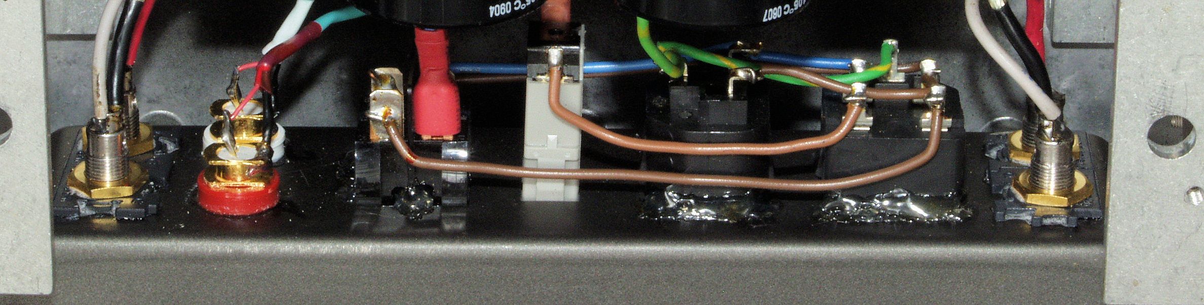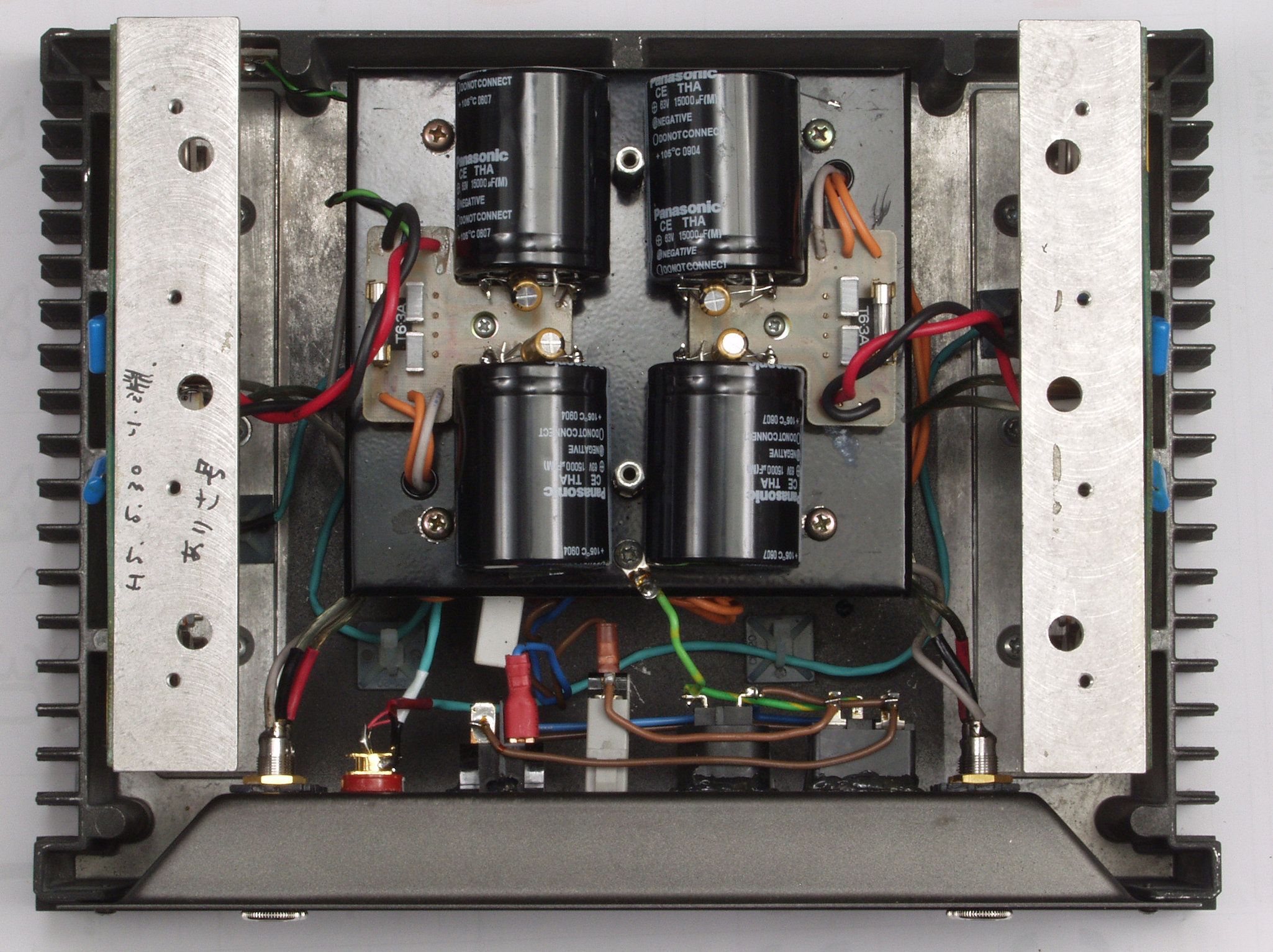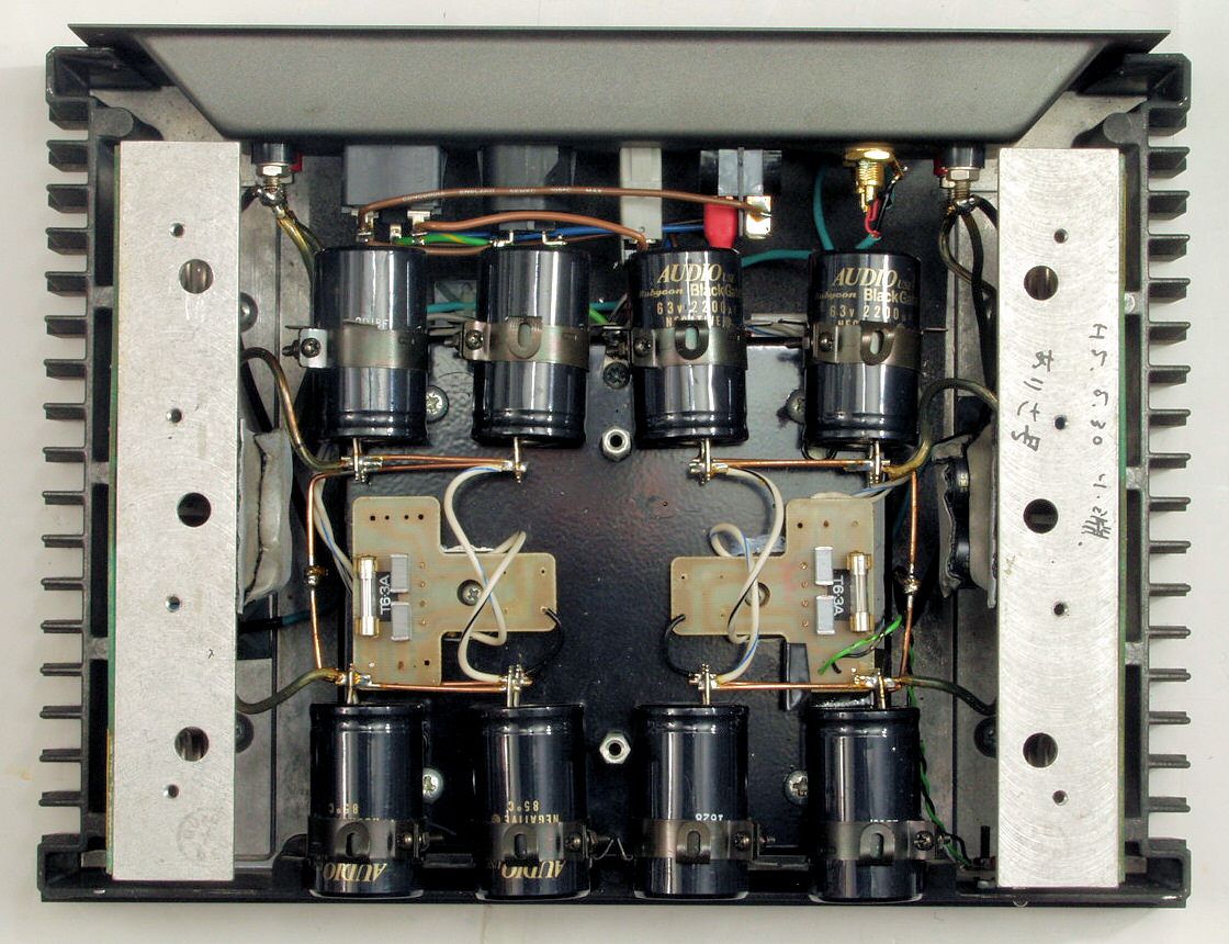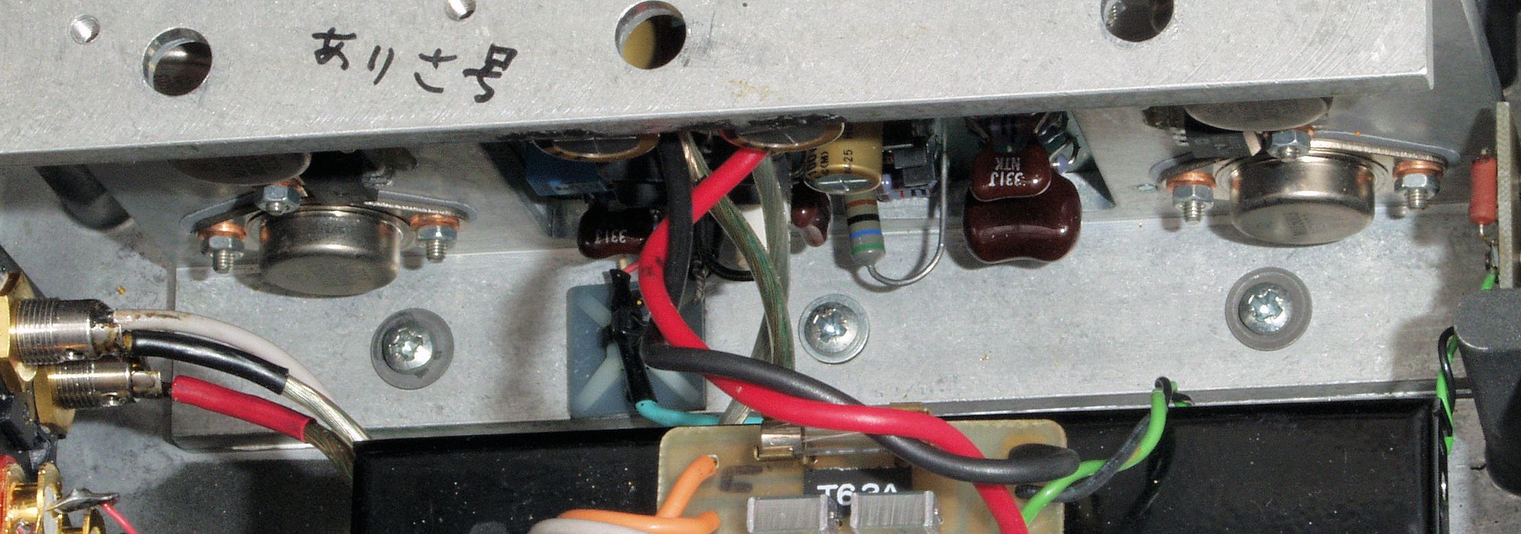 | C212. 修理前 L側AMP基板引きだし配線、エミッター抵抗も交換されている。電源・SP出力端子は引出し線を半田付け。 | ||||||||||||||||||||||||||||