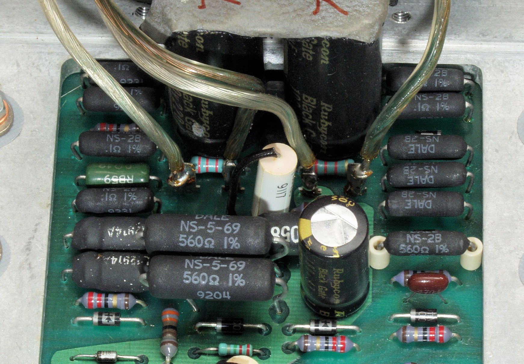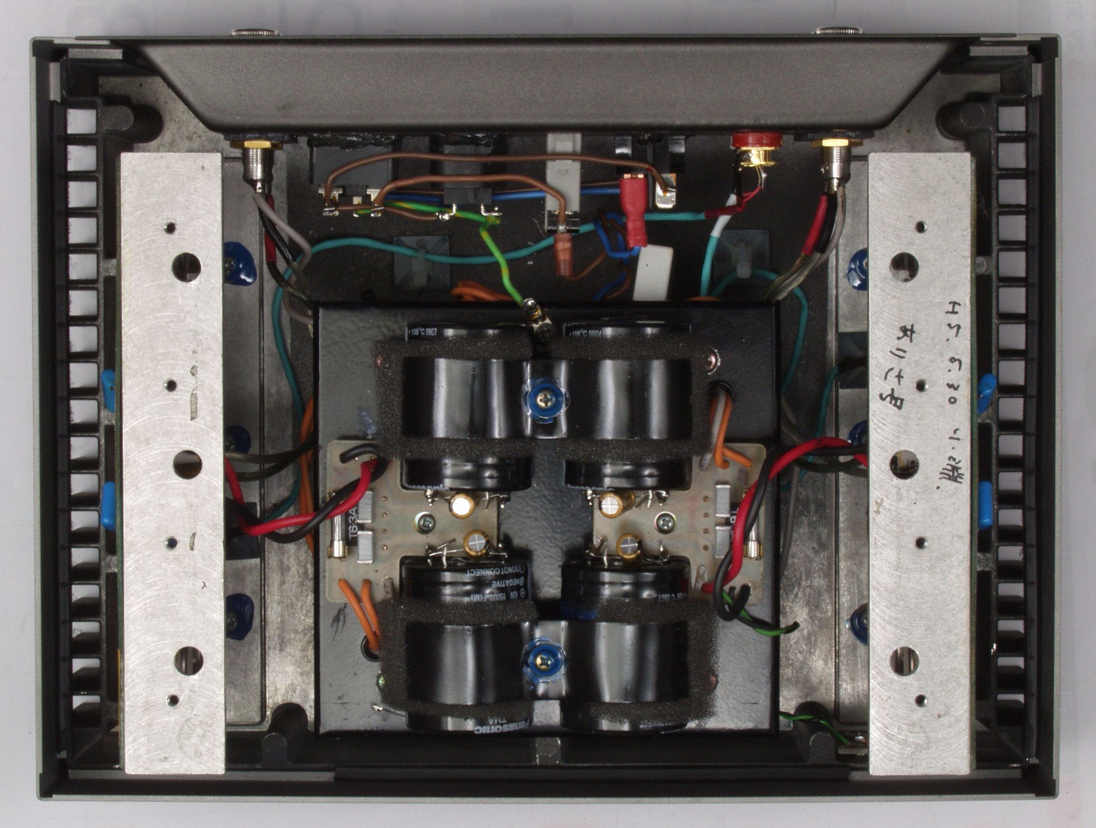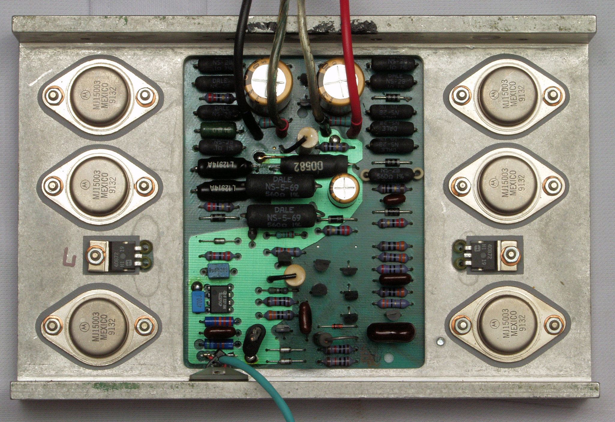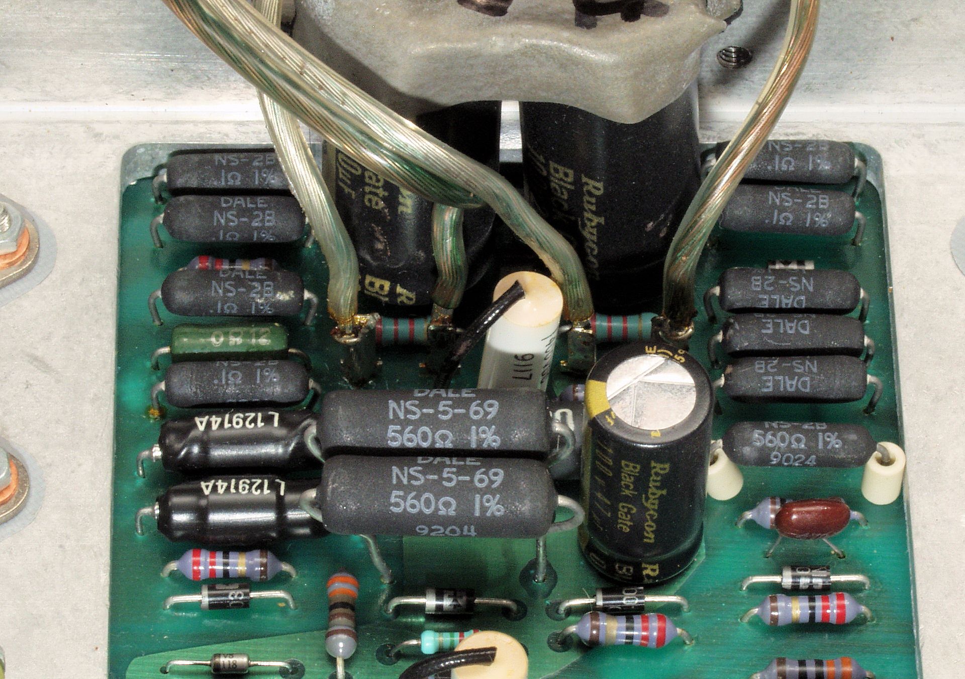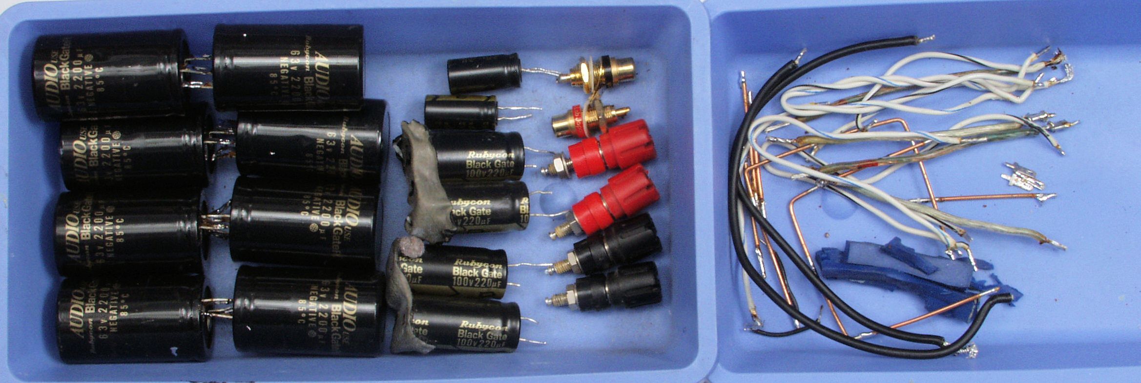 | C212. 修理前 L側AMP基板引きだし配線、エミッター抵抗も交換されている。電源・SP出力端子は引出し線を半田付け。 | ||||||||||||||||||||||||||||