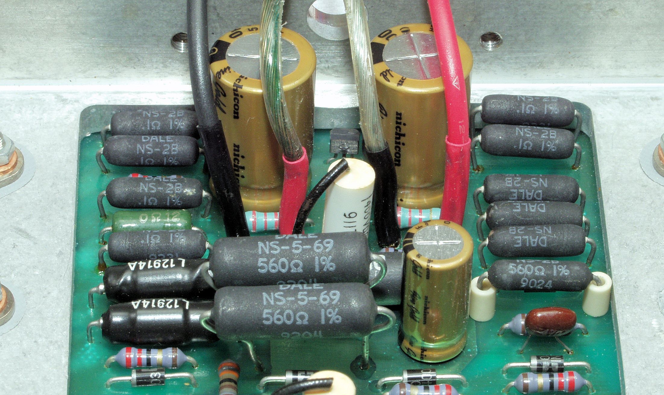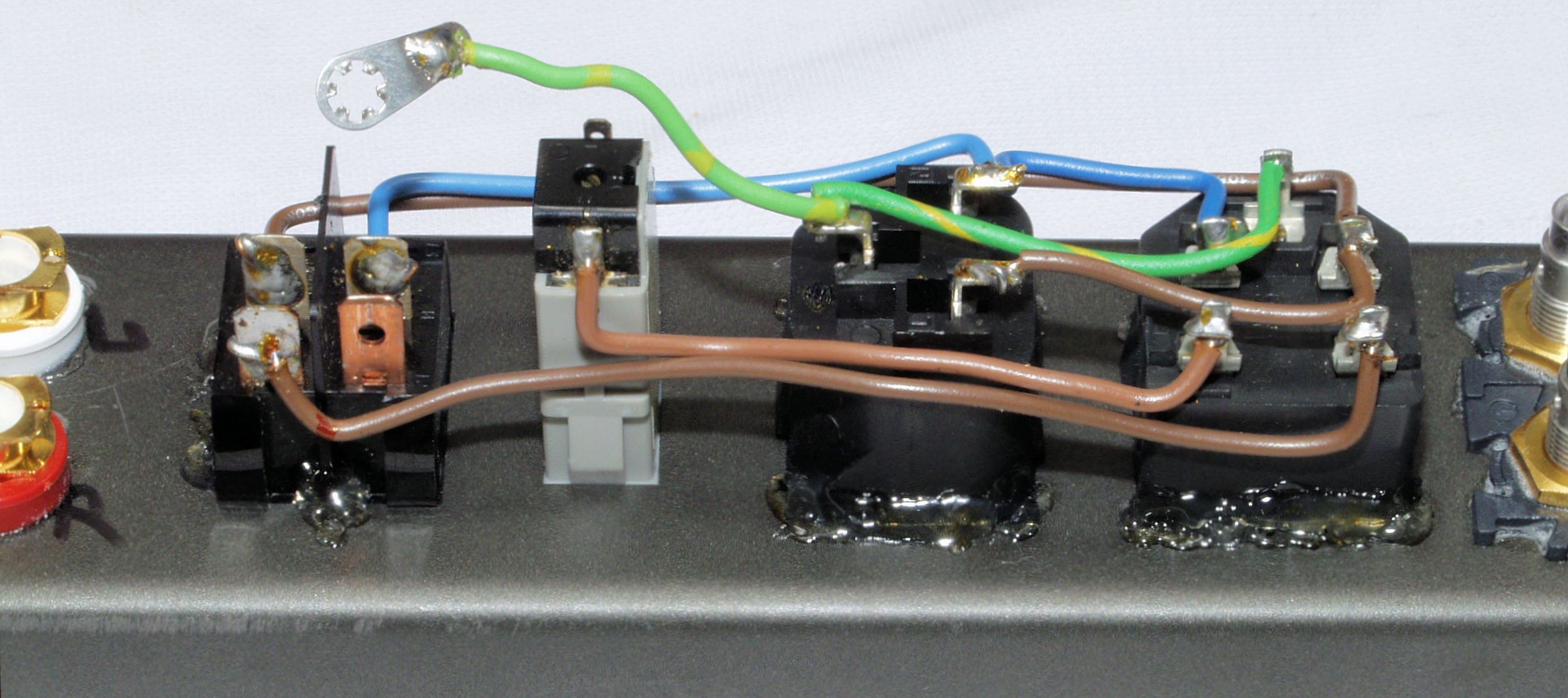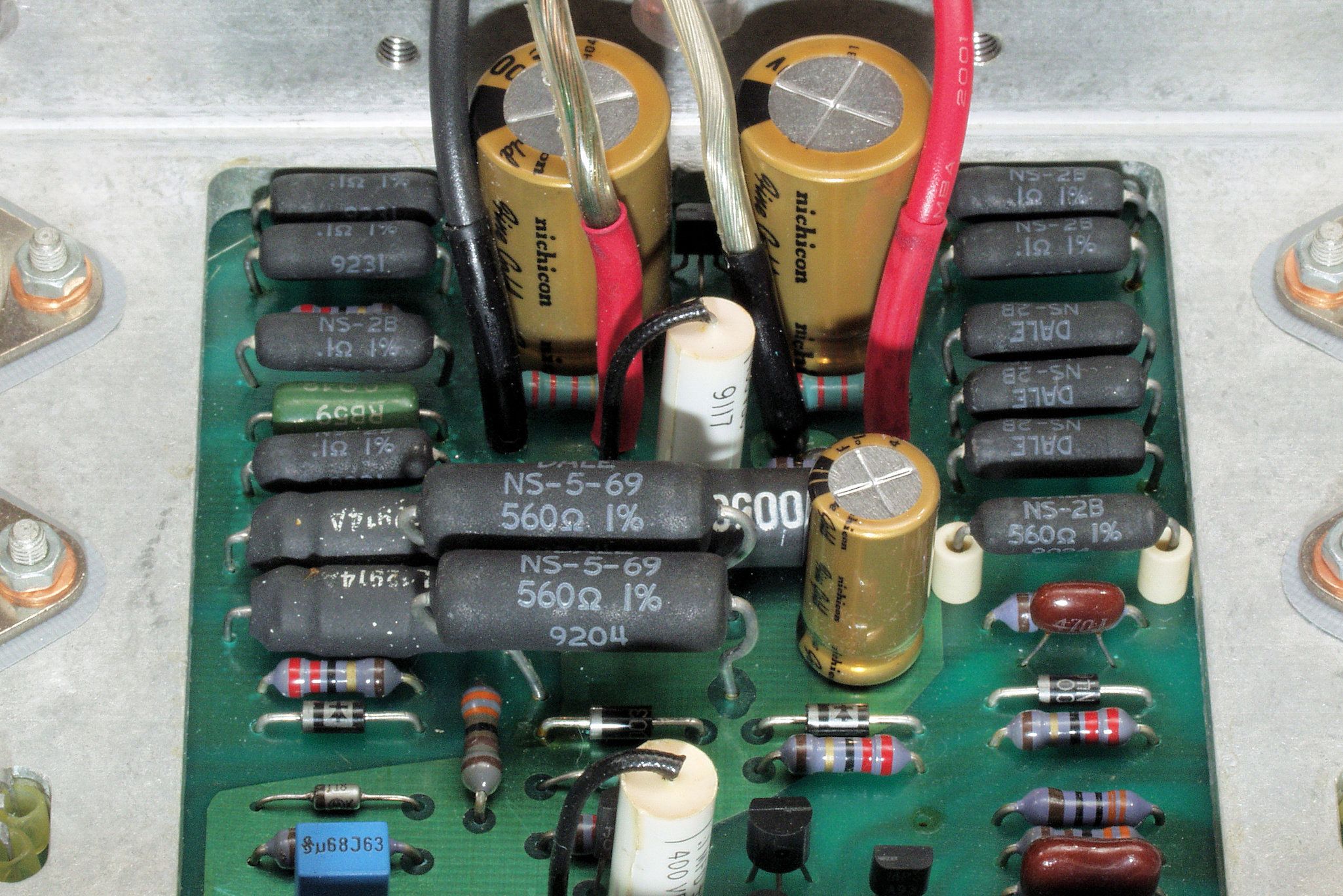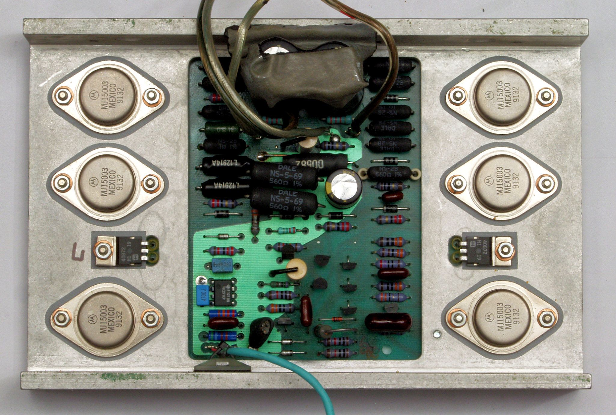 | C212. 修理前 L側AMP基板引きだし配線、エミッター抵抗も交換されている。電源・SP出力端子は引出し線を半田付け。 | ||||||||||||||||||||||||||||
