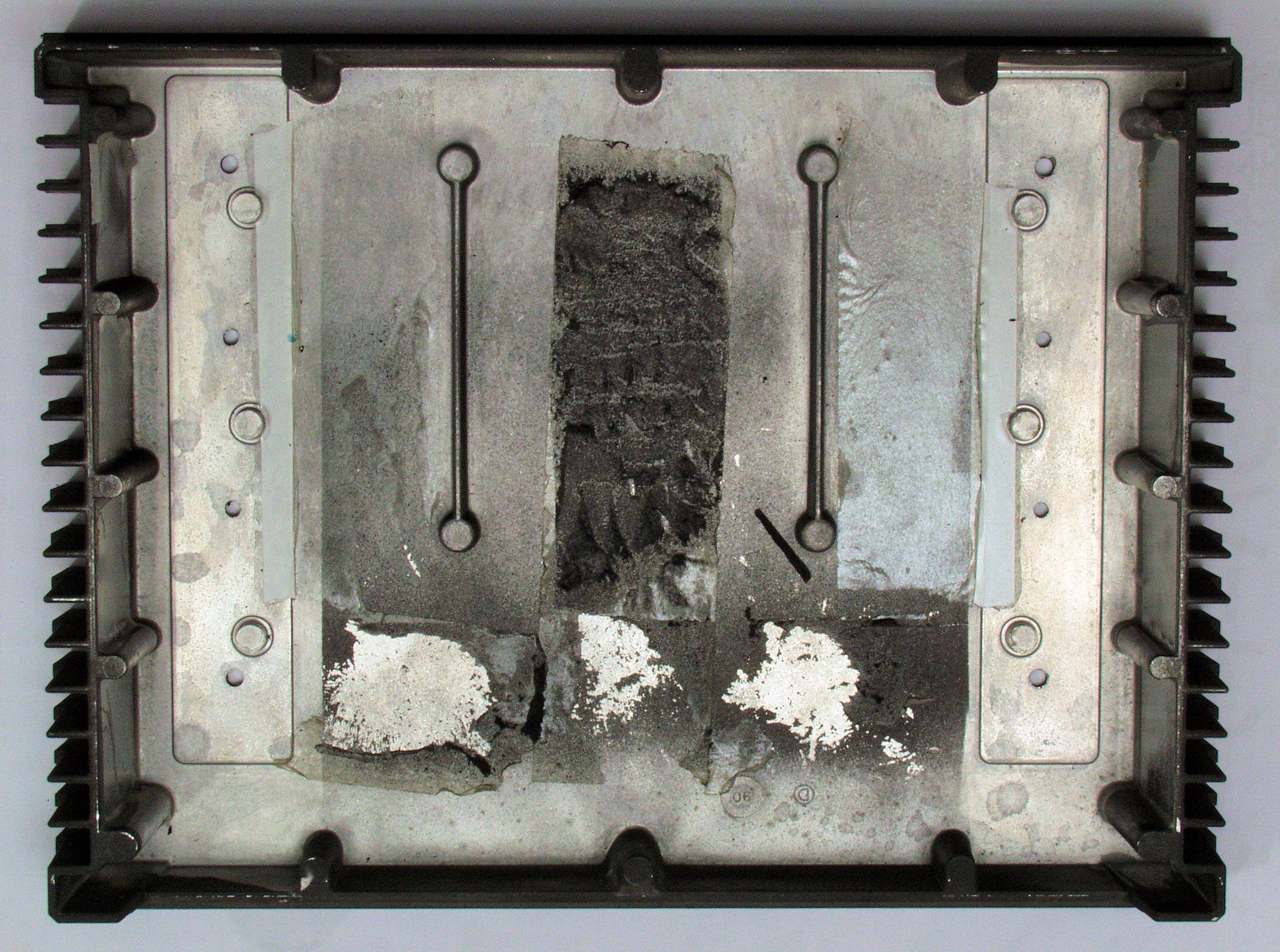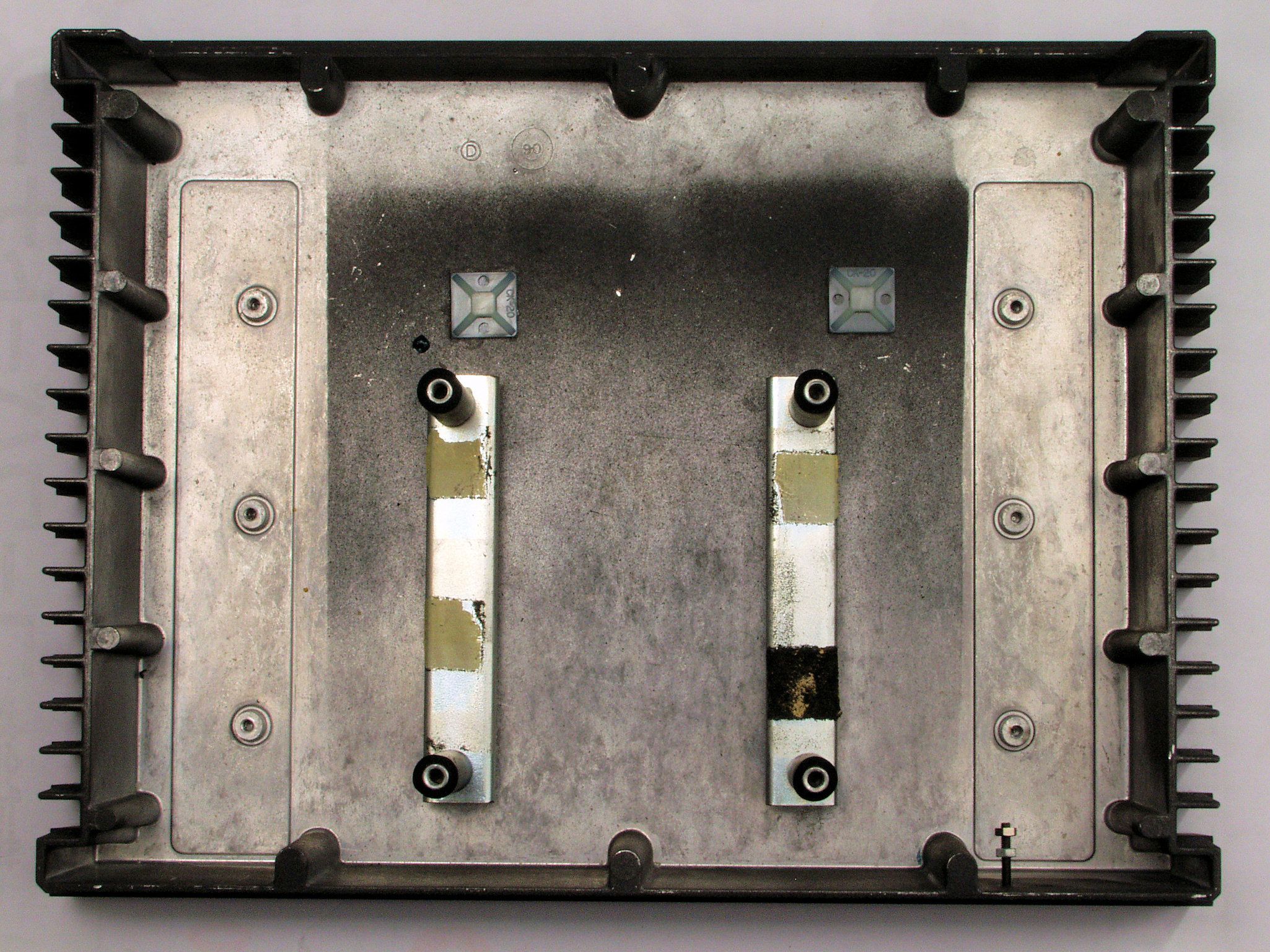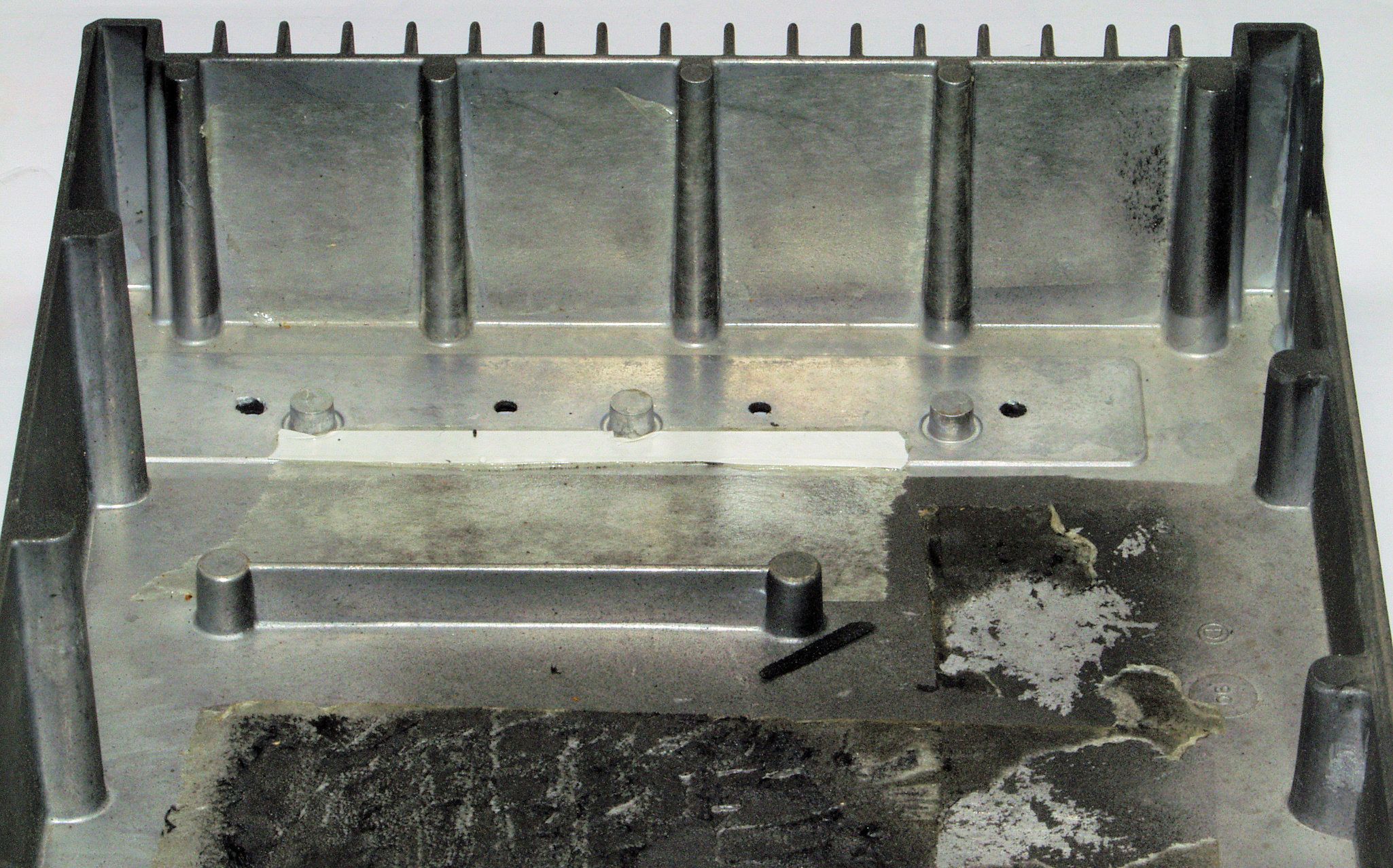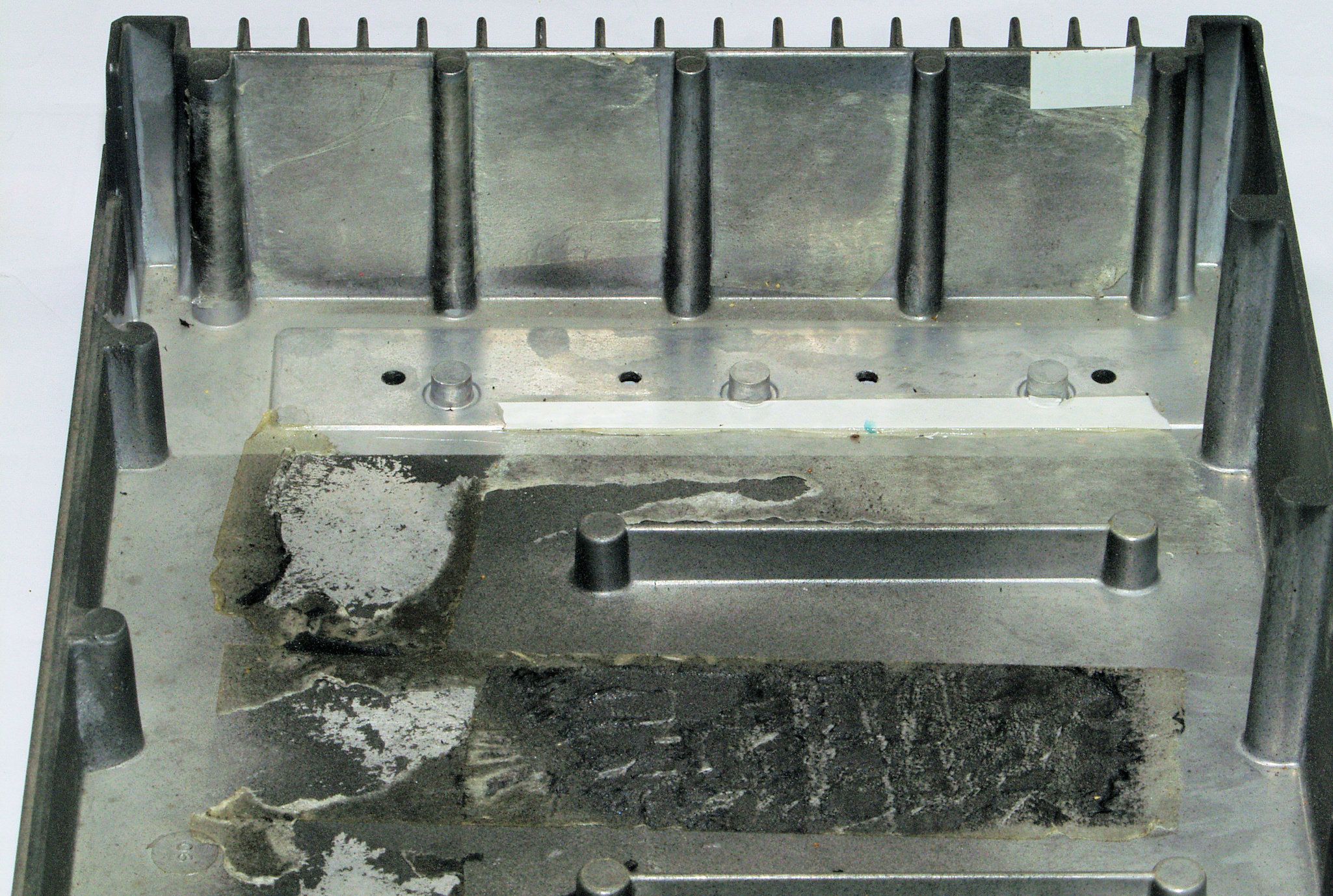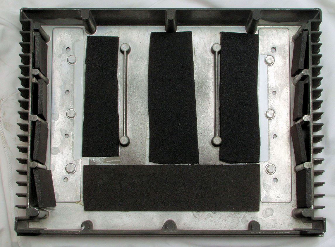 | A64. 点検中 騒音防止が目的? 下蓋(放熱器)裏に貼られた、スポンジ、熱による経年劣化で剥げている。 | ||||||||||||||||||||||||||||