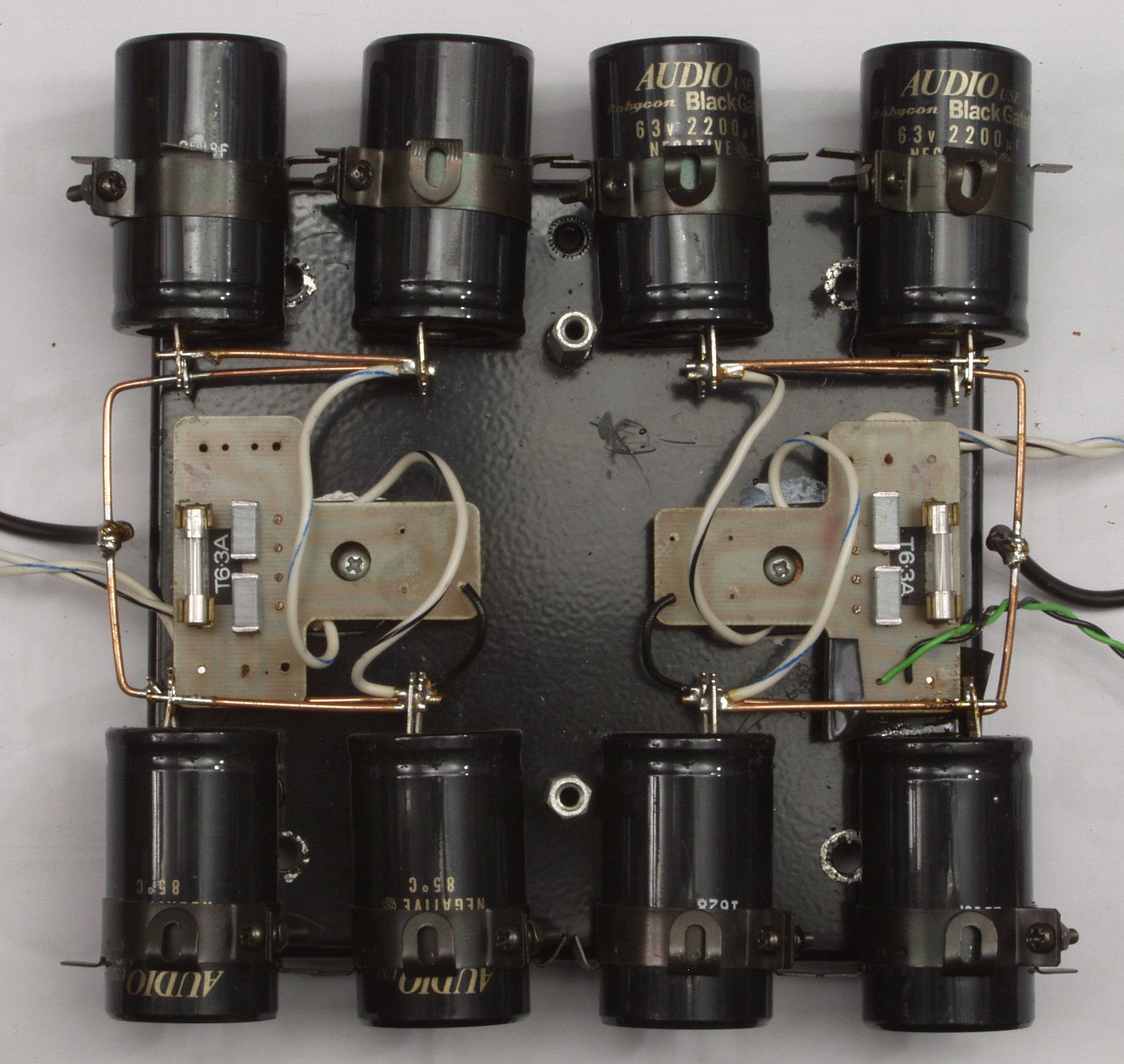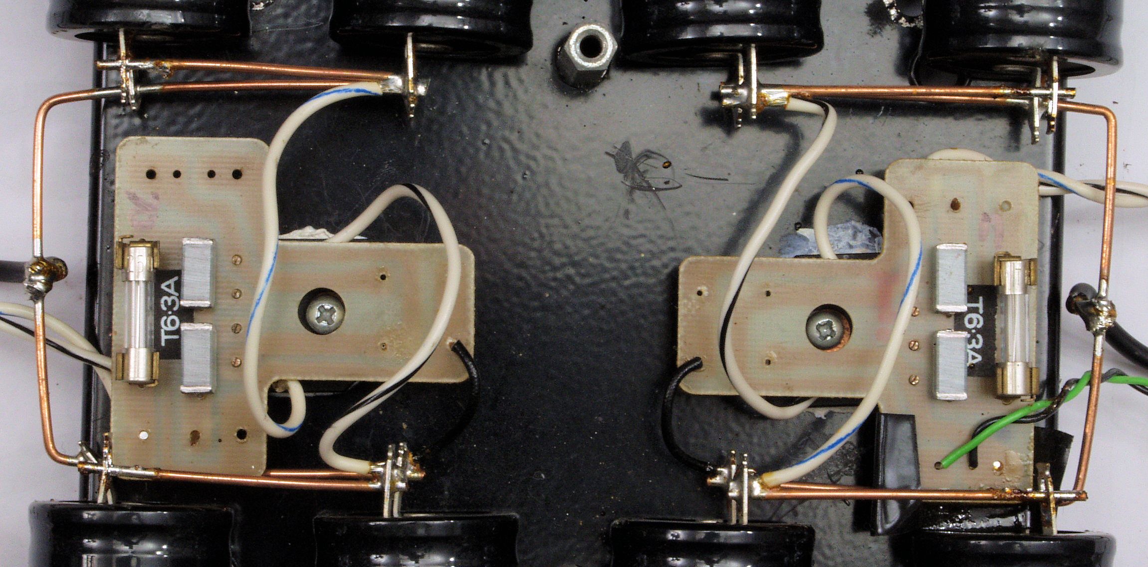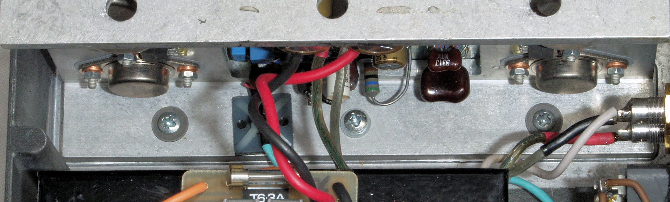 | C32. 修理前 配置が悪く、電源シャーシ、整流器から電解コンデンサーへの配線が長くなっている! 後の修理の操作性を犠牲にして、電源・SP出力端子の引出し線を半田付けしたり、電源配線を太くした、意味が無くなる |