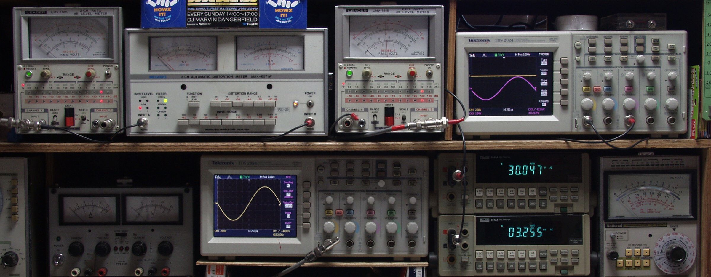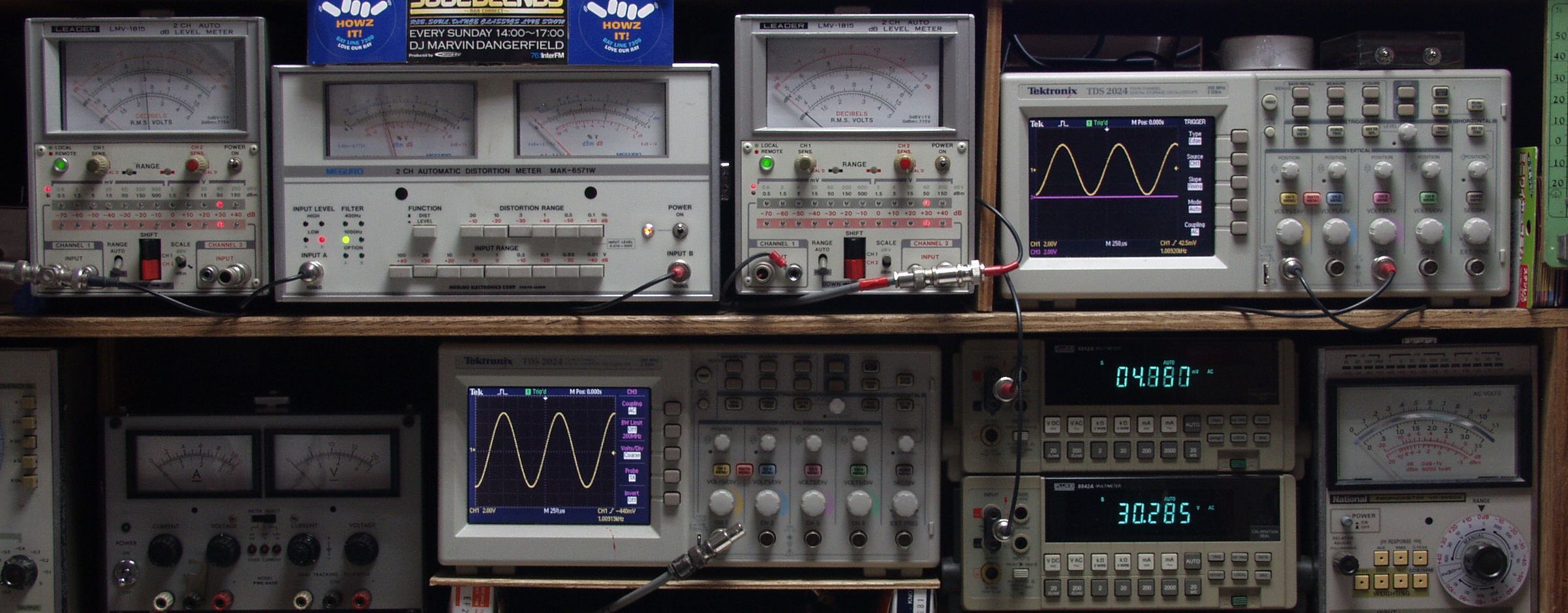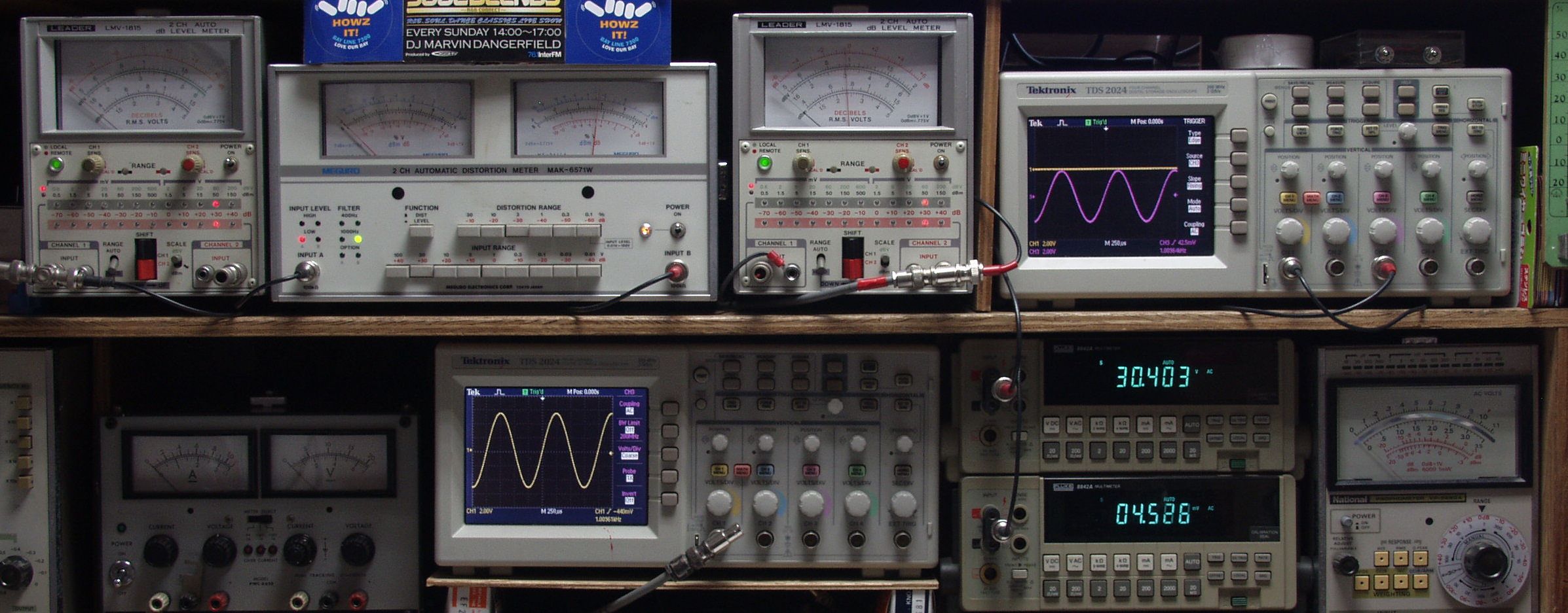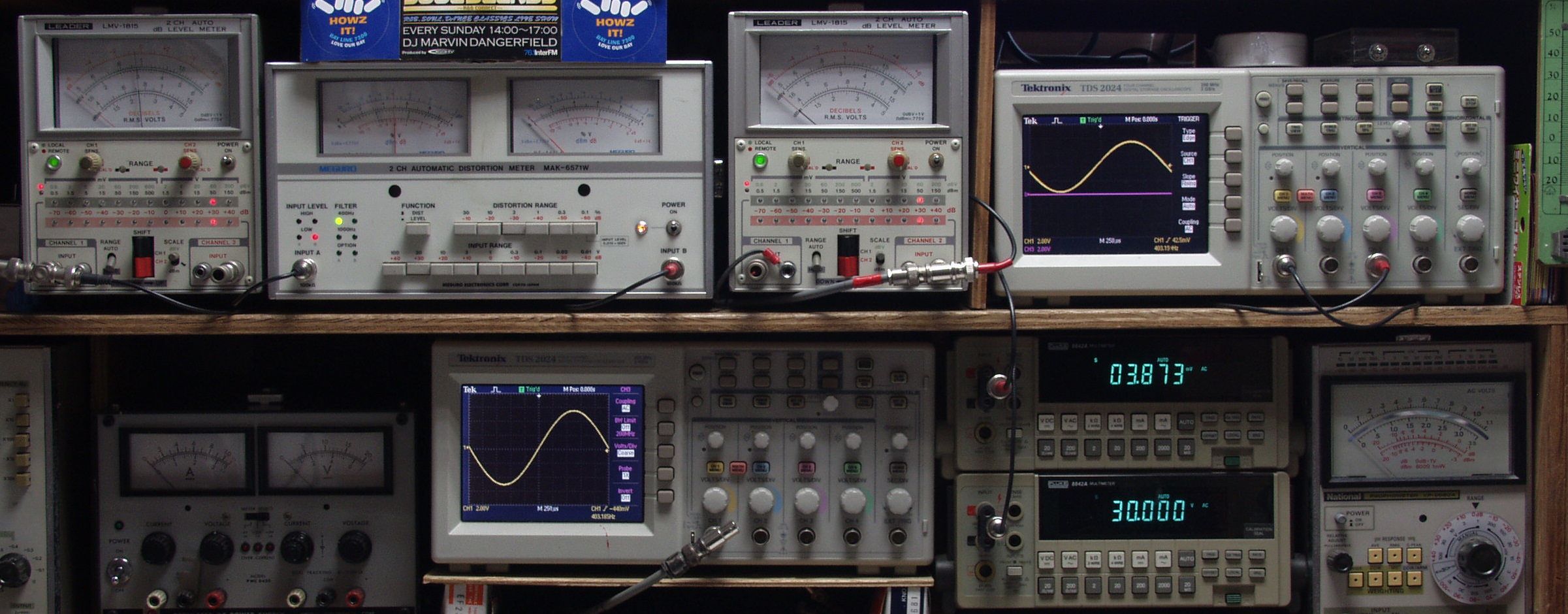 | T. 修理前点検測定 T1. 出力・歪み率測定。 <見方> 下段左端 オーディオ発振器より400HZ・1KHZの信号を出し(歪み率=約0.003%)これをAMPに入力し、出力を測定。 下段中左 オシロ=入力波形(オーディオ発振器のTTLレベル)。 下段中右上=周波数計。 上段左端 電圧計=L側出力電圧測定、黒針のみ使用。 上段中左 歪み率計=出力の歪み率測定。 左メータ=L出力、右メータ=R出力。 上段中右 電圧計=R側出力電圧測定、赤針のみ使用。 上段右端 オシロ=出力波形 上=R出力、下=L出力。(交流電圧が5V以上の場合1/10のATTが入ります)。 下段中右上 デジタル電圧計=R出力電圧測定。 下段中右下 デジタル電圧計=L出力電圧測定。 |