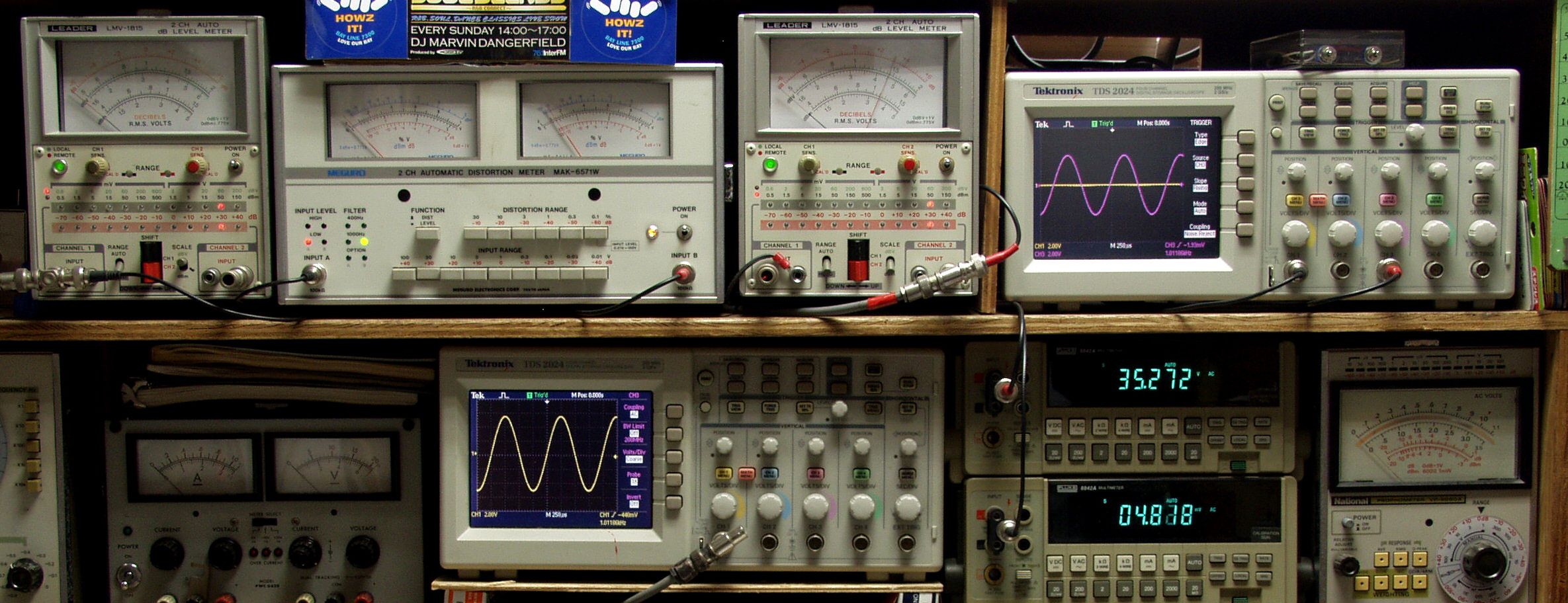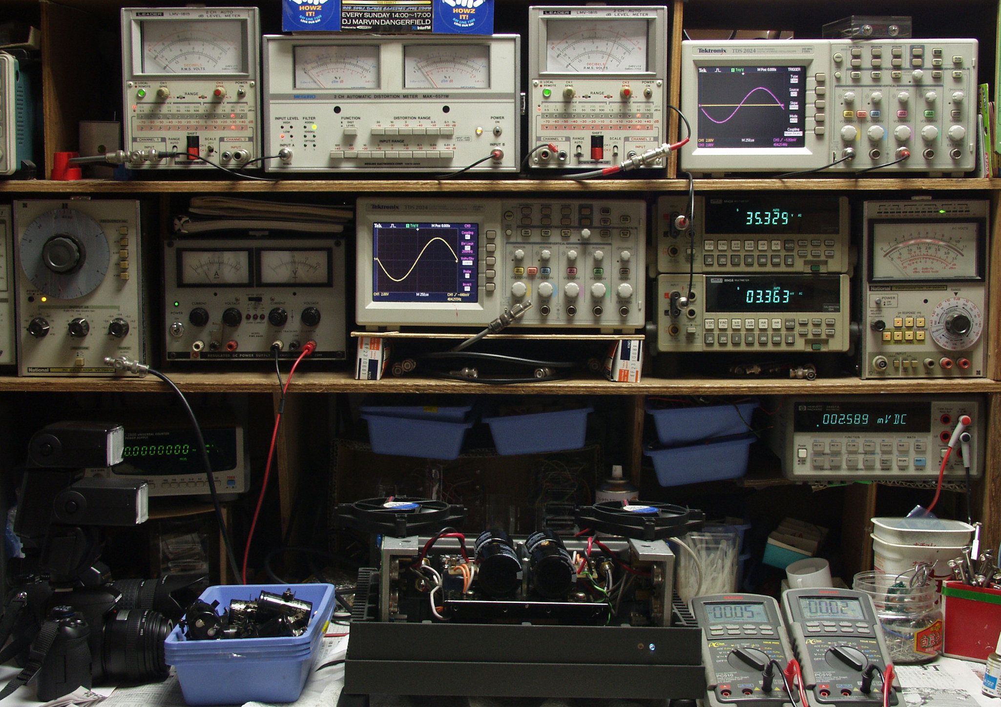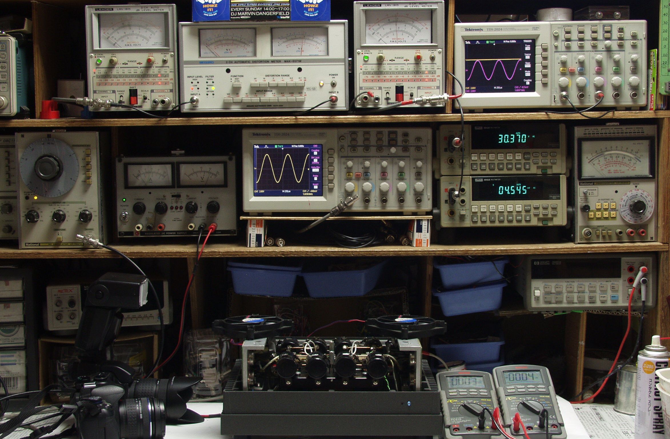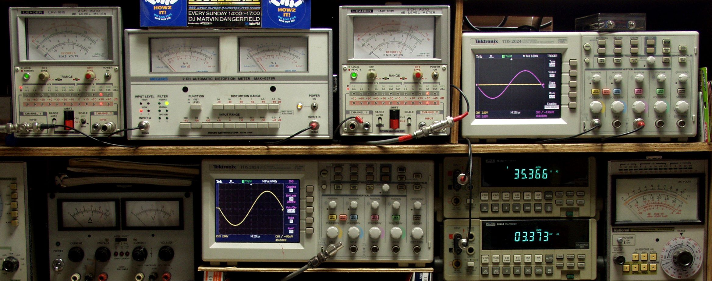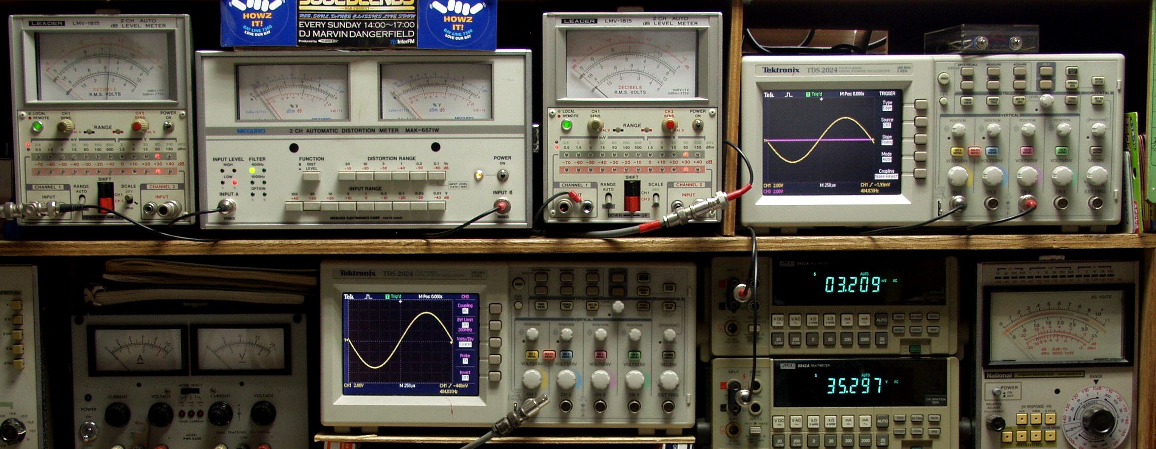 | T. 修理前点検測定 T1. 出力・歪み率測定。 <見方> 下段左端 オーディオ発振器より400HZ・1KHZの信号を出し(歪み率=約0.003%)これをAMPに入力し、出力を測定。 下段中左 オシロ=入力波形(オーディオ発振器のTTLレベル)。 下段中右上=周波数計。 上段左端 電圧計=L側出力電圧測定、黒針のみ使用。 上段中左 歪み率計=出力の歪み率測定。 左メータ=L出力、右メータ=R出力。 上段中右 電圧計=R側出力電圧測定、赤針のみ使用。 上段右端 オシロ=出力波形 上=R出力、下=L出力。(交流電圧が5V以上の場合1/10のATTが入ります)。 下段中右上 デジタル電圧計=R出力電圧測定。 下段中右下 デジタル電圧計=L出力電圧測定。 |