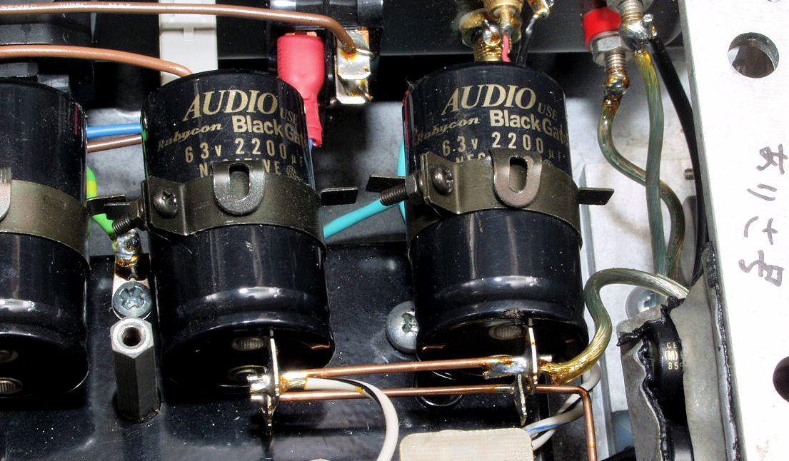 | A52. 点検中 電源ブロック電解コンデンサーが交換されている(2200μF×2=4400μF)、容量が足りない! 正規は最低でも6800μF | ||||||||||||||||||||||||||||