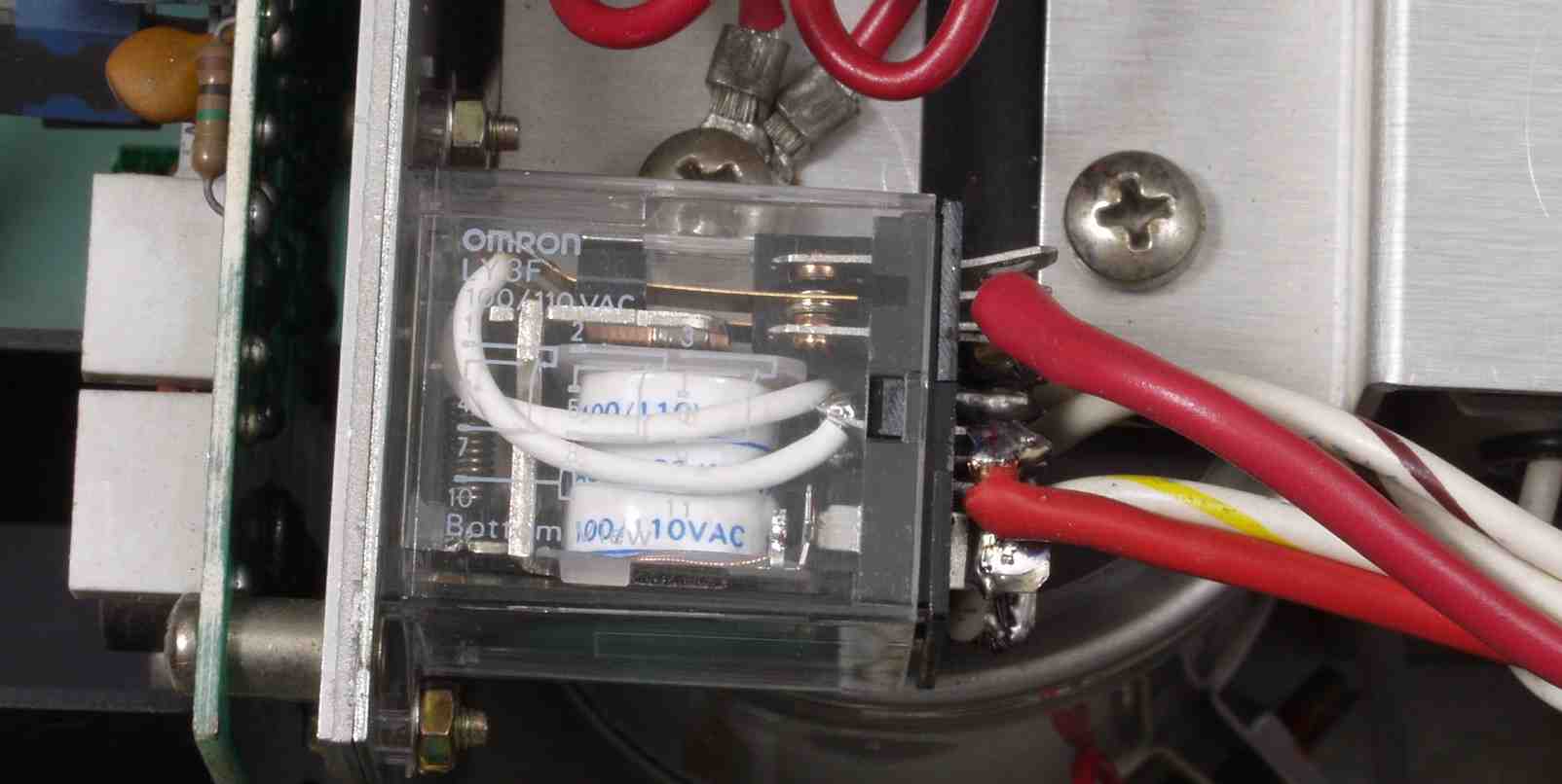 | CF2. 再修理 サーモ交換のついでに、電源投入リレーを新設する、これで電源コード交換の数倍も抵抗が少なくなる しかし、これが原因で本当の再修理となる |