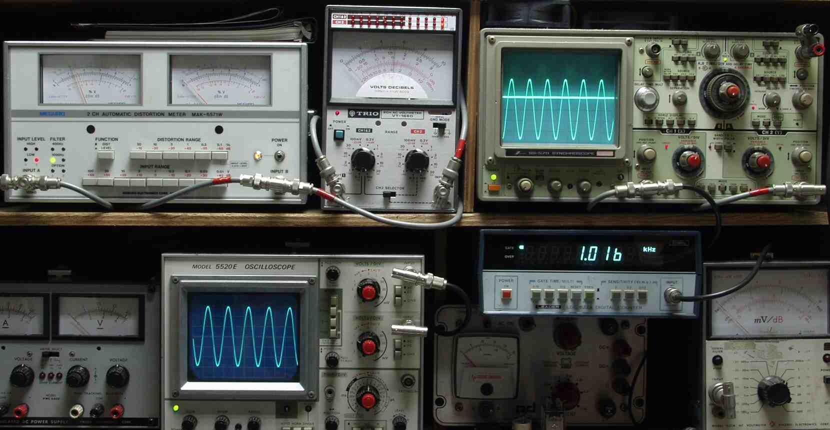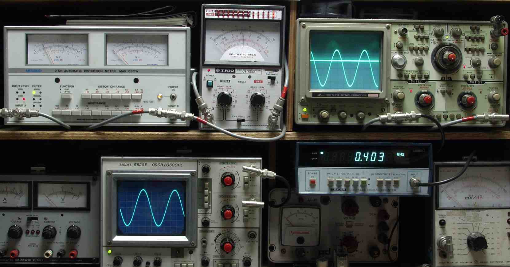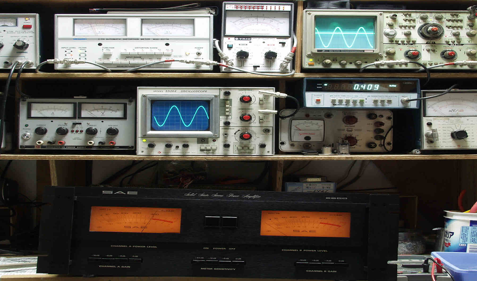 | E. 測定・調整。 画像をクリックすると、大きく(横幅2050ドット)表示されます。 E0. 出力・歪み率測定、電源電圧は100Vで測定。前期型で、117V仕様なので出力は400W/400Wは出ない。 <見方> 上左オーディオ発振器より400HZ・1KHZの信号を出す(歪み率=約0.003%)。 下中=入力波形(オーディオ発振器のTTLレベル) 下右=周波数計。 上左=SP出力の歪み率測定 左メータ=L出力、右メータ=R出力。 上中=SP出力電圧測定器、赤針=R出力、黒針=L出力。 上右=SP出力波形オシロ 上=R出力、下=L出力(出力電圧測定器の出力)。 |