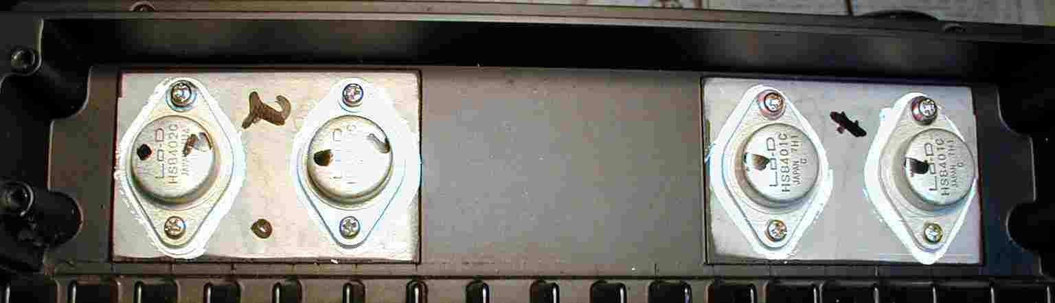 | A. 修理前の状況 左側の終段FET(電界効果トランジスター)の取り付けが逆に付いていた。 お陰で左側のフューズ入り抵抗全部溶断、及びFET(電界トランジスタ ー)/TR(トランジスター)焼損