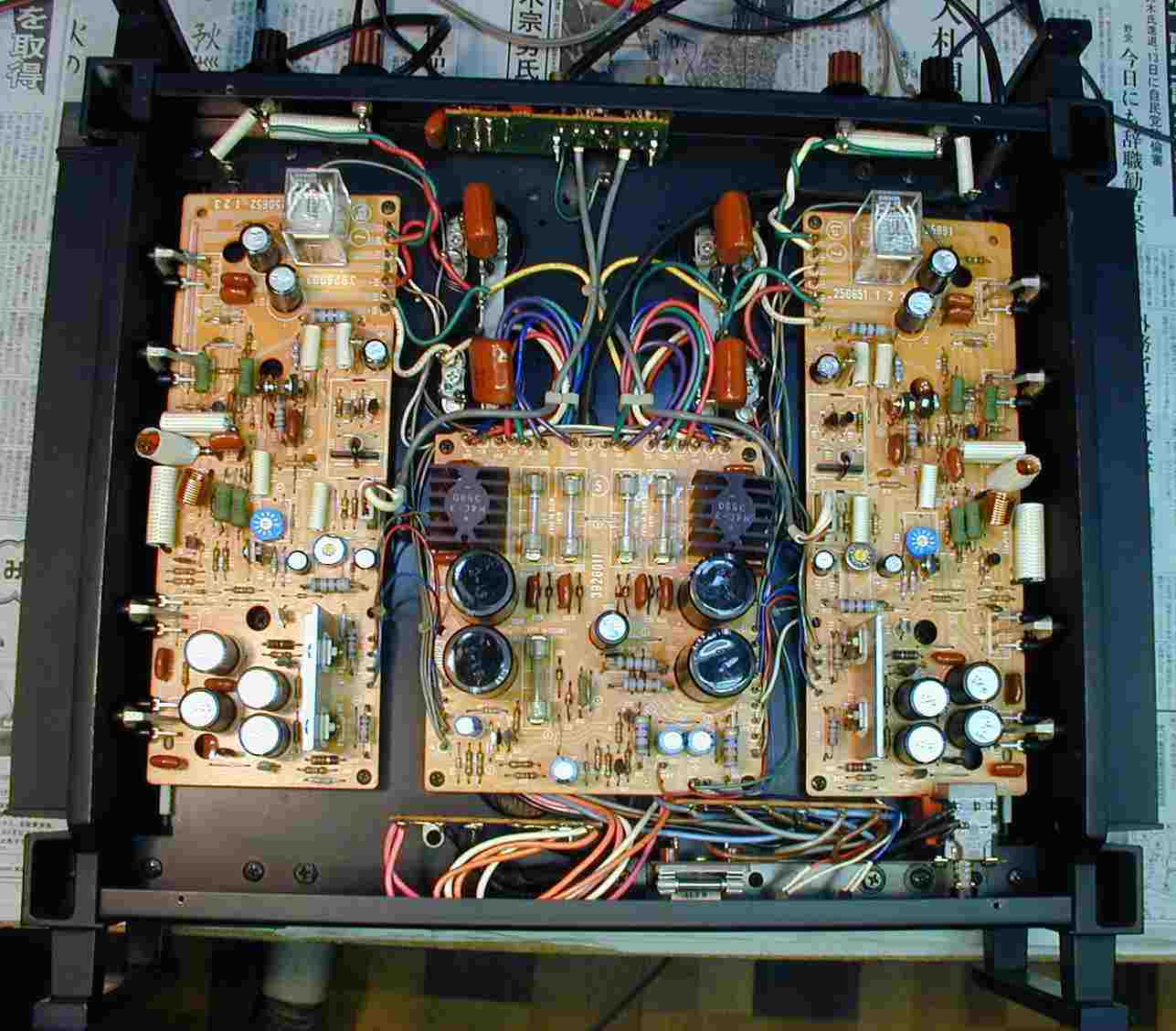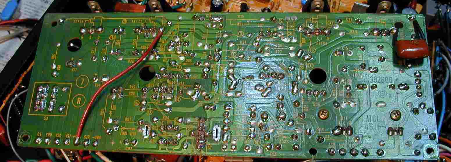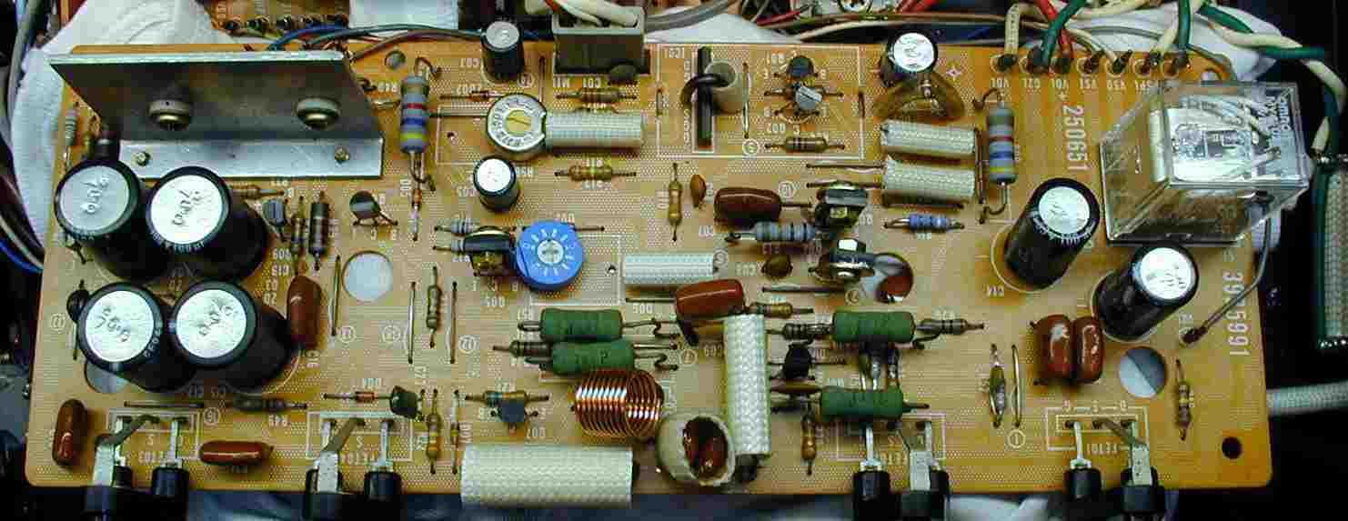 | 3. 修理後ドライブ基板、 初段FET(電界効果トランジスター)、全TR(トランジスター)、バランス/バイアス調整用半固定VR、SP接続リレー交換。 フューズ入り抵抗も全部交換。 |