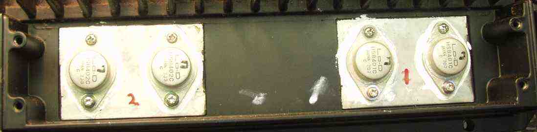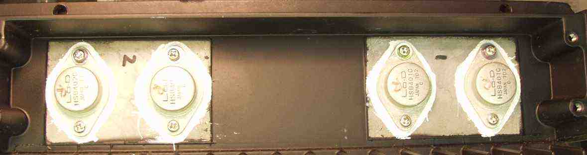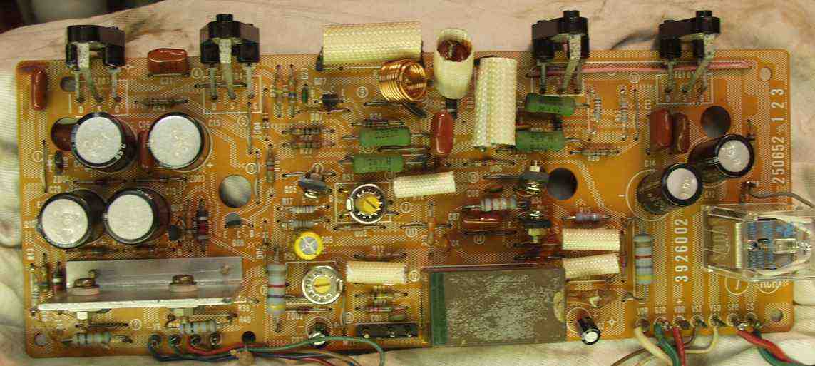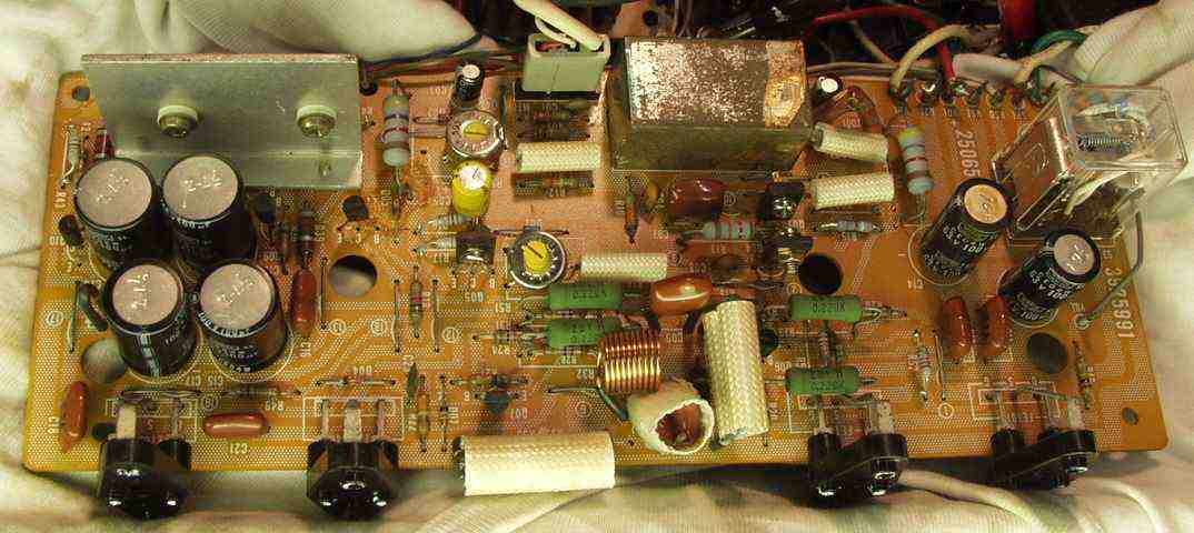 | 2. R側 修理後ドライブ基板、 初段FET(電界効果トランジスター)、全TR(トランジスター)、バランス/バイアス調整用半固定VR、 SP接続リレー交換、フューズ入り抵抗も全部交換。 |