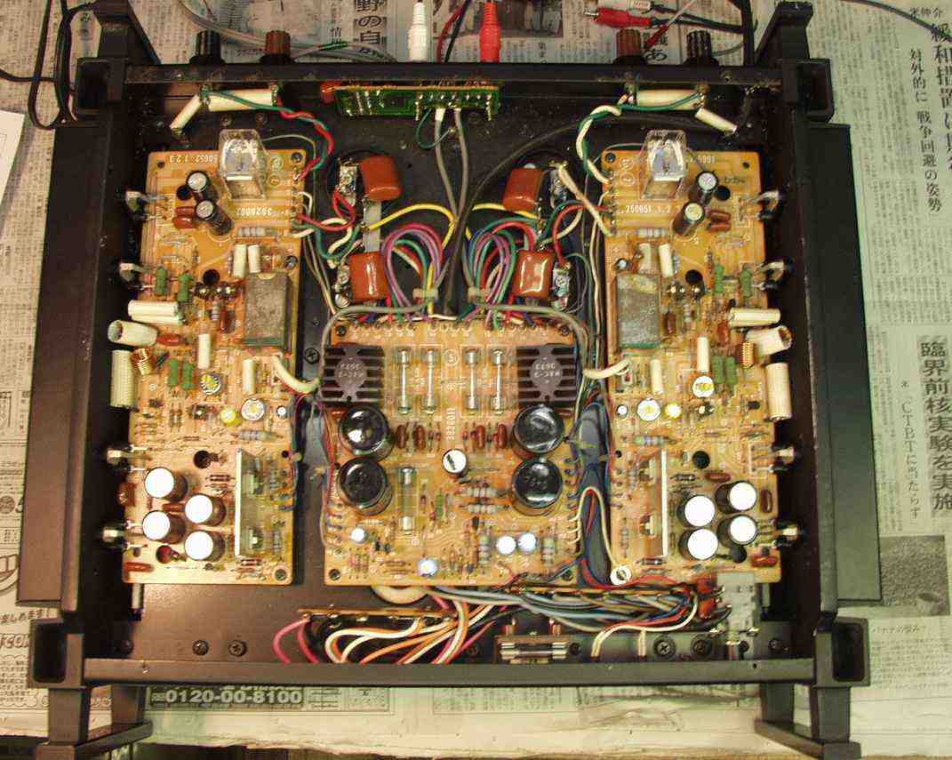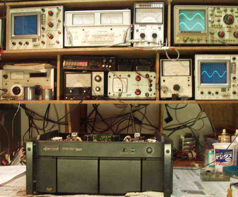 | A. 修理前の状況 プロテクト解除せず B. 原因 経年変化による劣化 C. 修理状況 SP接続リレー交換 初段FET(電界効果トランジスター)交換 バイアス/バランスVR交換 TR(トランジスター) プリント基板補修 配線手直し、補強 D. 使用部品 SP接続リレー 2個 初段FET(電界効果トランジスター) 2個 TR(トランジスター) 14 バイアス/バランス半固定VR 4個 フューズ入り抵抗 20個 抵抗 6個 E. 修理費 40,000円 通常修理。 S. HITACHI Lo−D HMA−9500 の仕様(マニアルより) |
