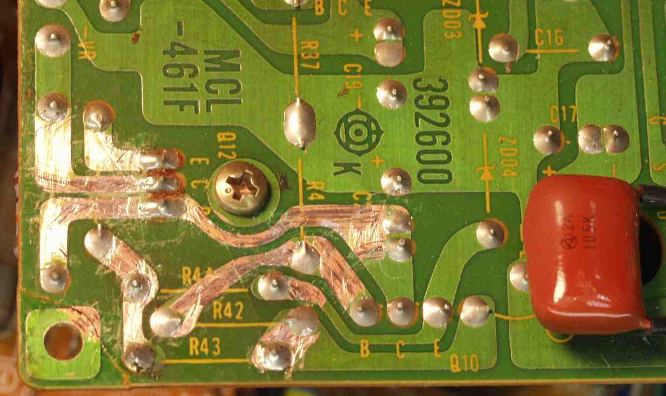| C2. 修理中 拡大した割れた基盤 右下の止めネジのすぐ上に1本 上のネジの下に1本=これが銅箔を切断 |