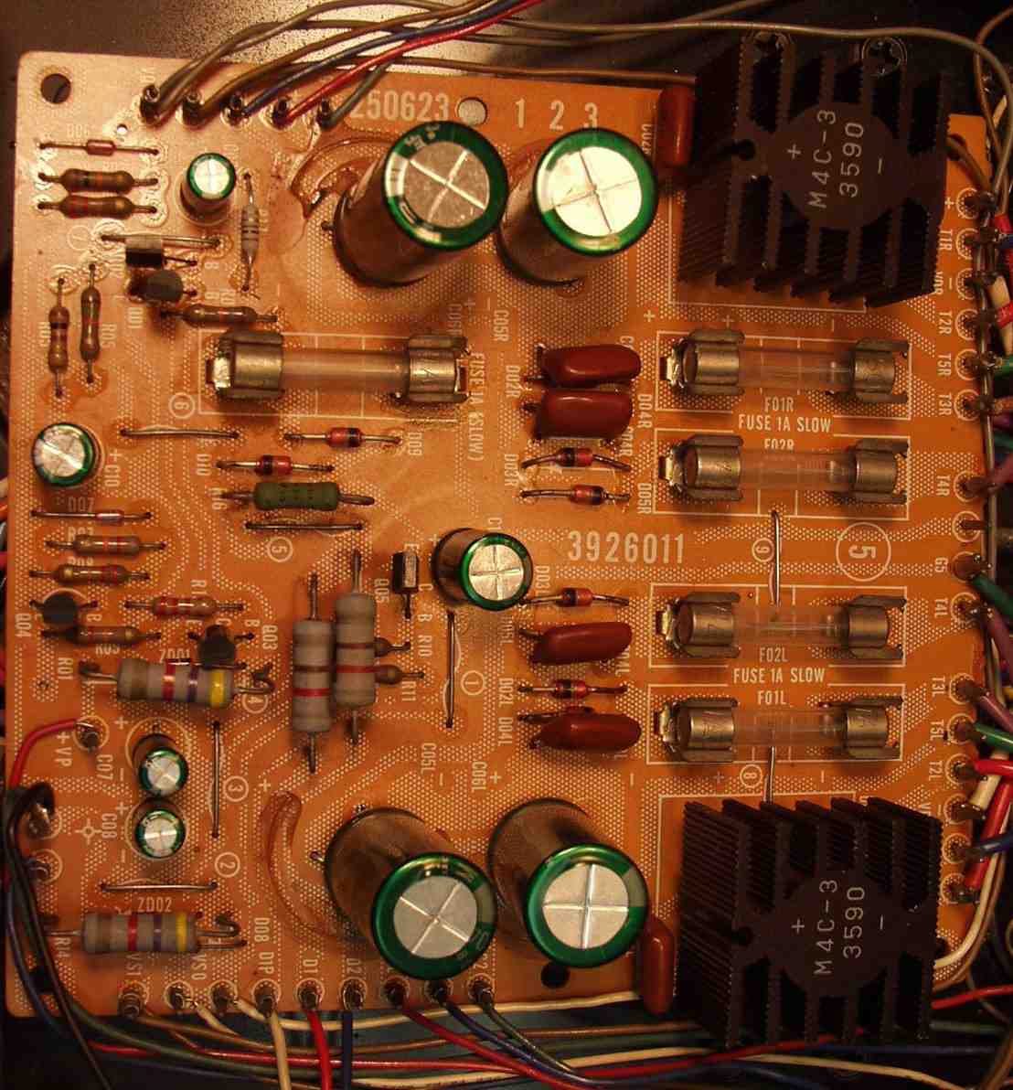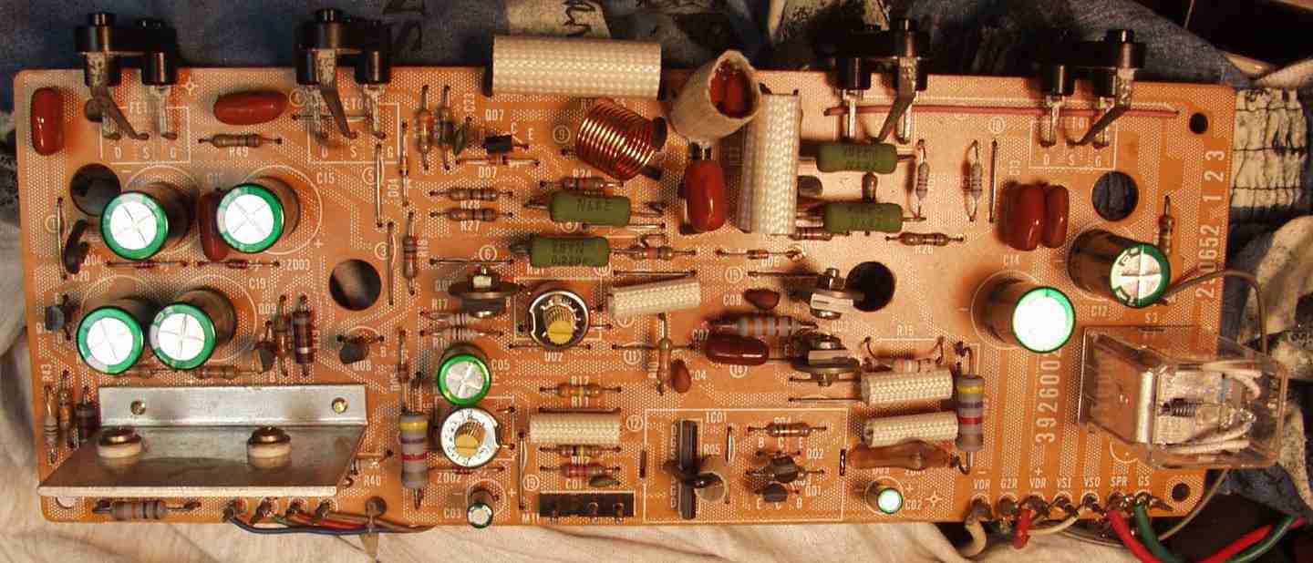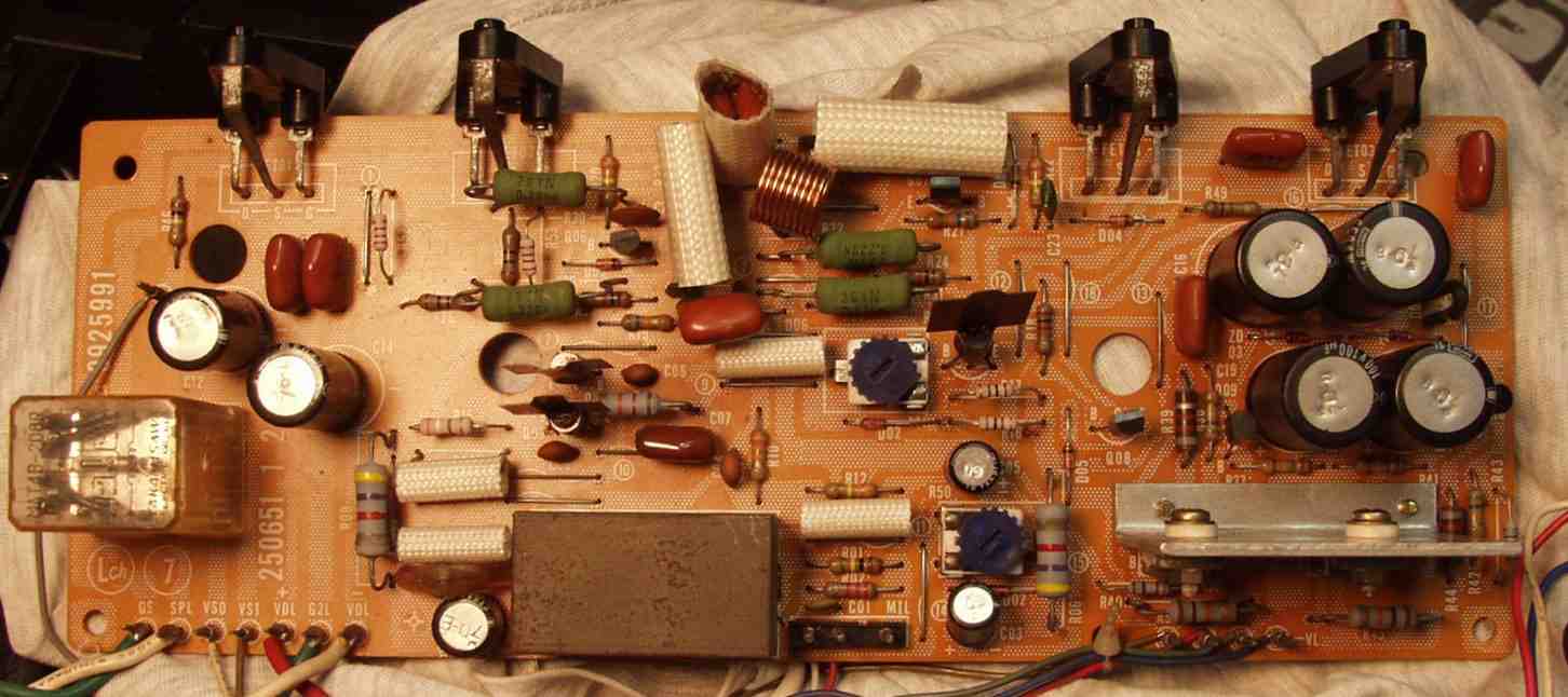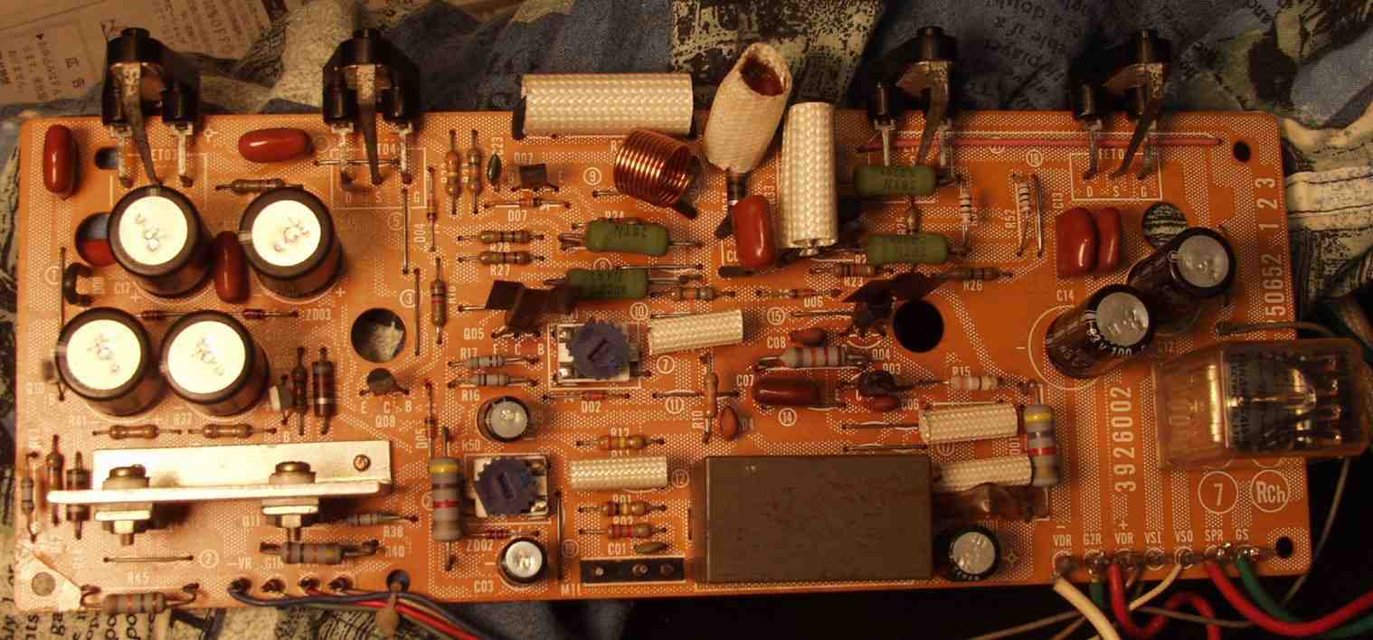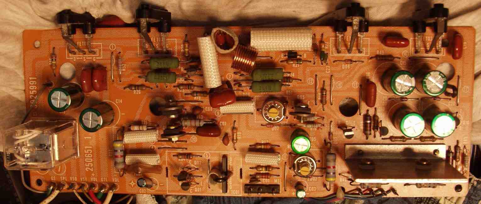 | C6. 修理後 L側基板 初段FET(電界効果トランジスター)、バランス・バイアス調整用半固定VR、SP接続リレー交換、フューズ入り抵抗全部交換、電解コンデンサー全部交換 |